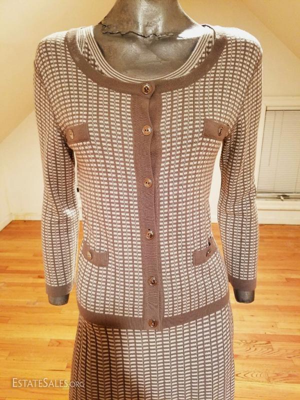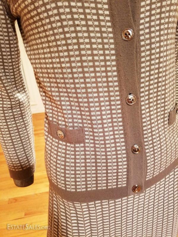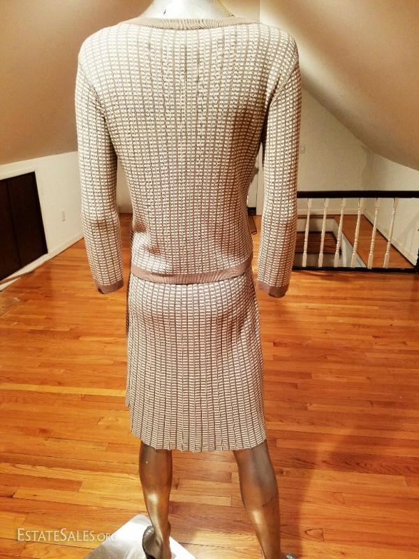 French designer Rodika Paris ensemble. Accordion pleats dress is very fluid and classic with the Chanel style jacket and gold plated designer buttons. on slash pockets. Classic for every occasion this one is magnificent.. worn only a few times.so it is like new.