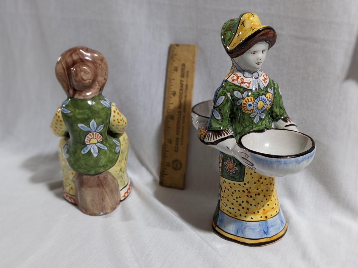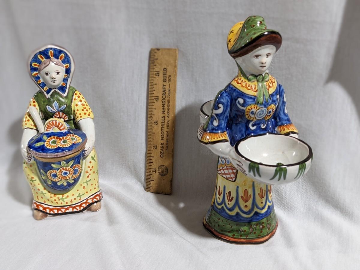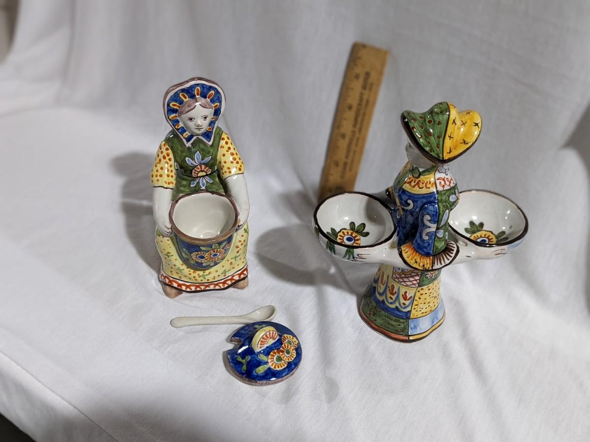 Antique French Faience open salt and pepper and covered mustard cruet pair.