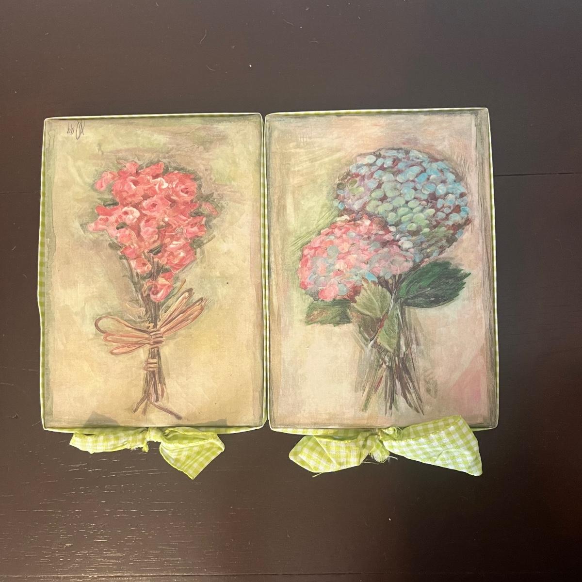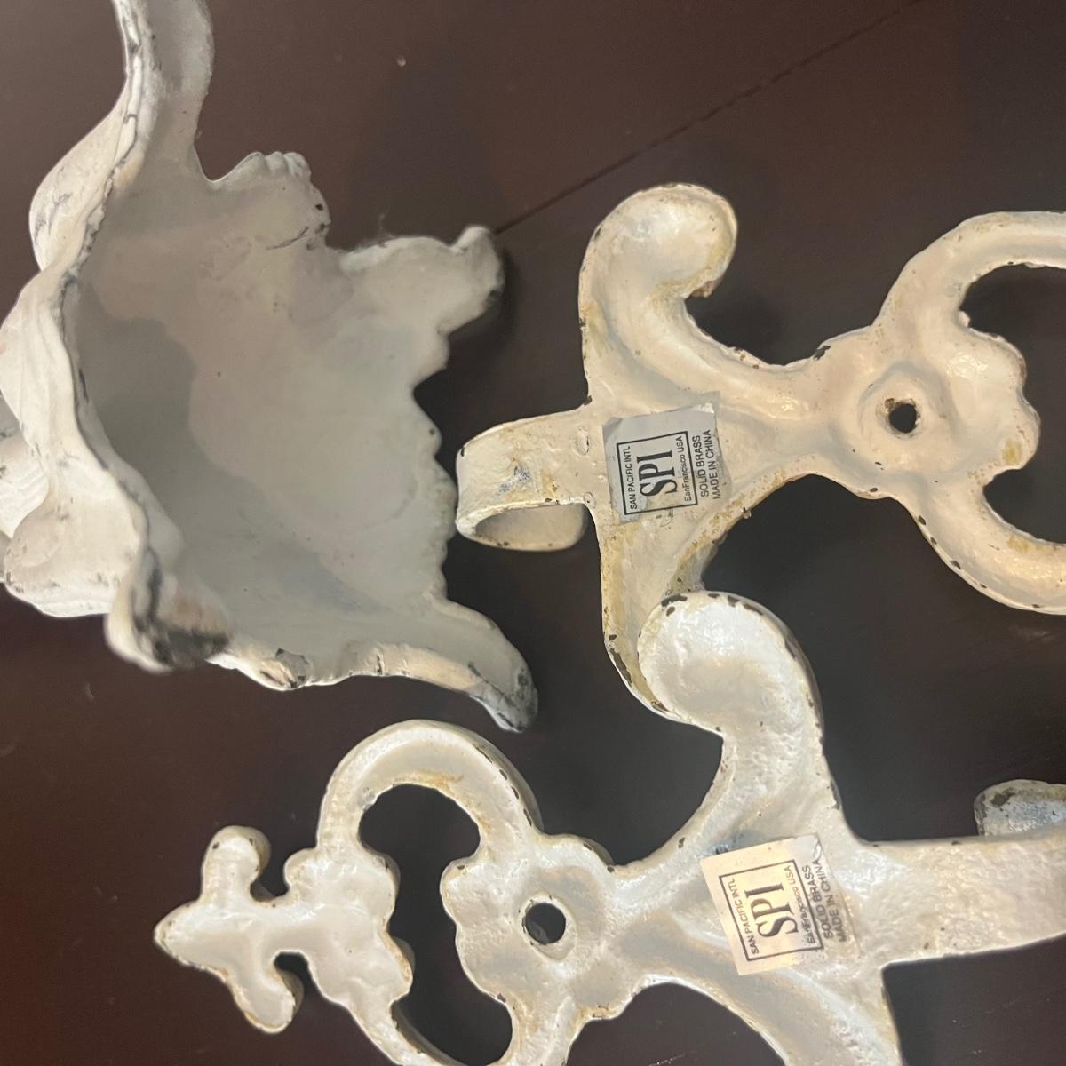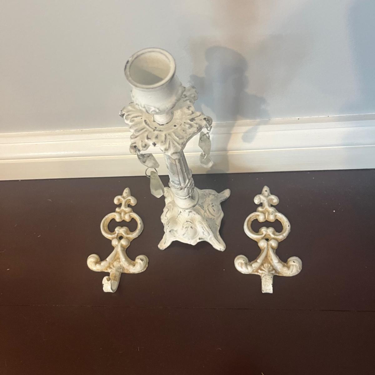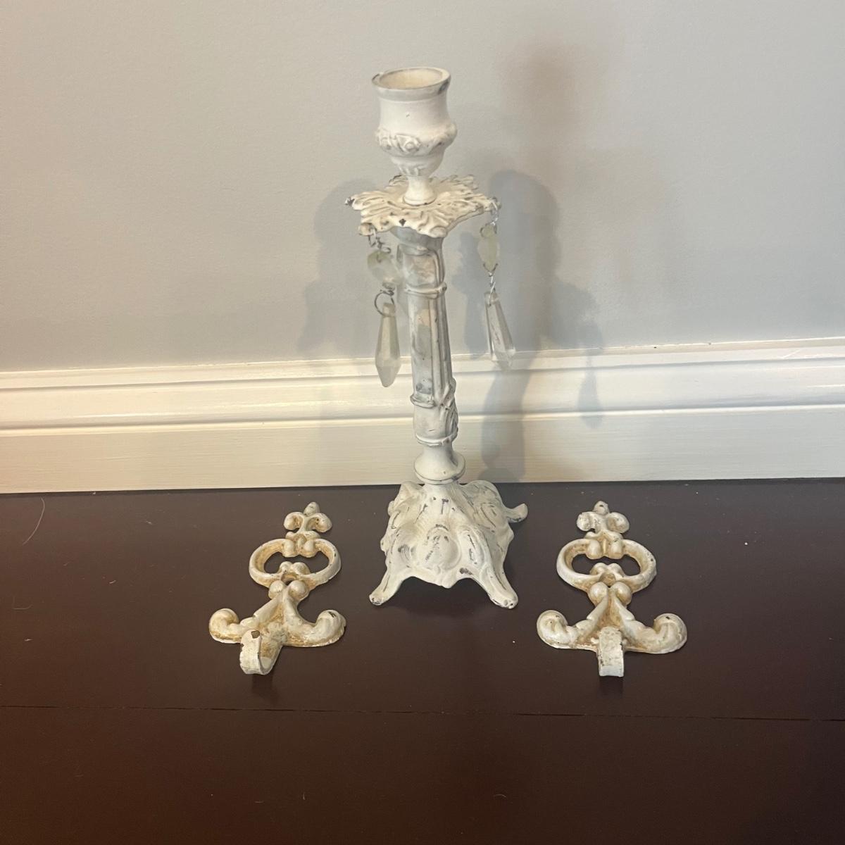 Lot includes two signs by Stupell Industries, three prints signed by Wendy Patterson, two wooden wall hangings, wooden chocolate box, two dried flower prints, iron candlestick and two hooks. Also includes a wooden wall mount shelf and four prints with three signed by Wendy Patterson and a pair of wooden candleholders. Largest wall hanging measures. 5” x 37” x 12”H. Also includes