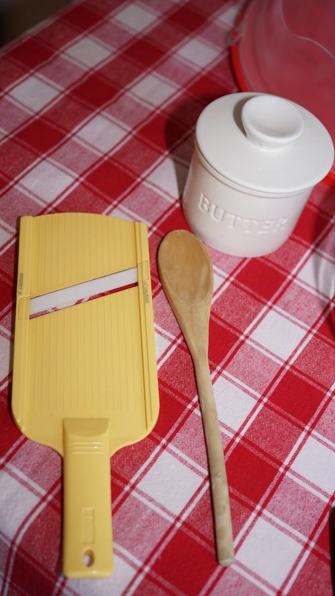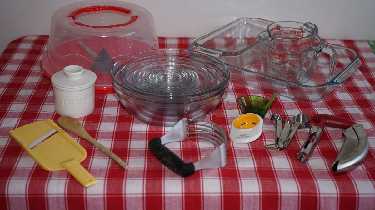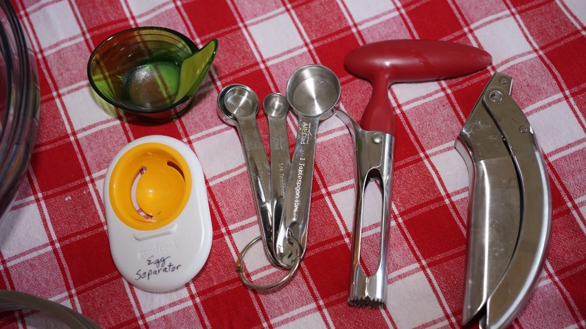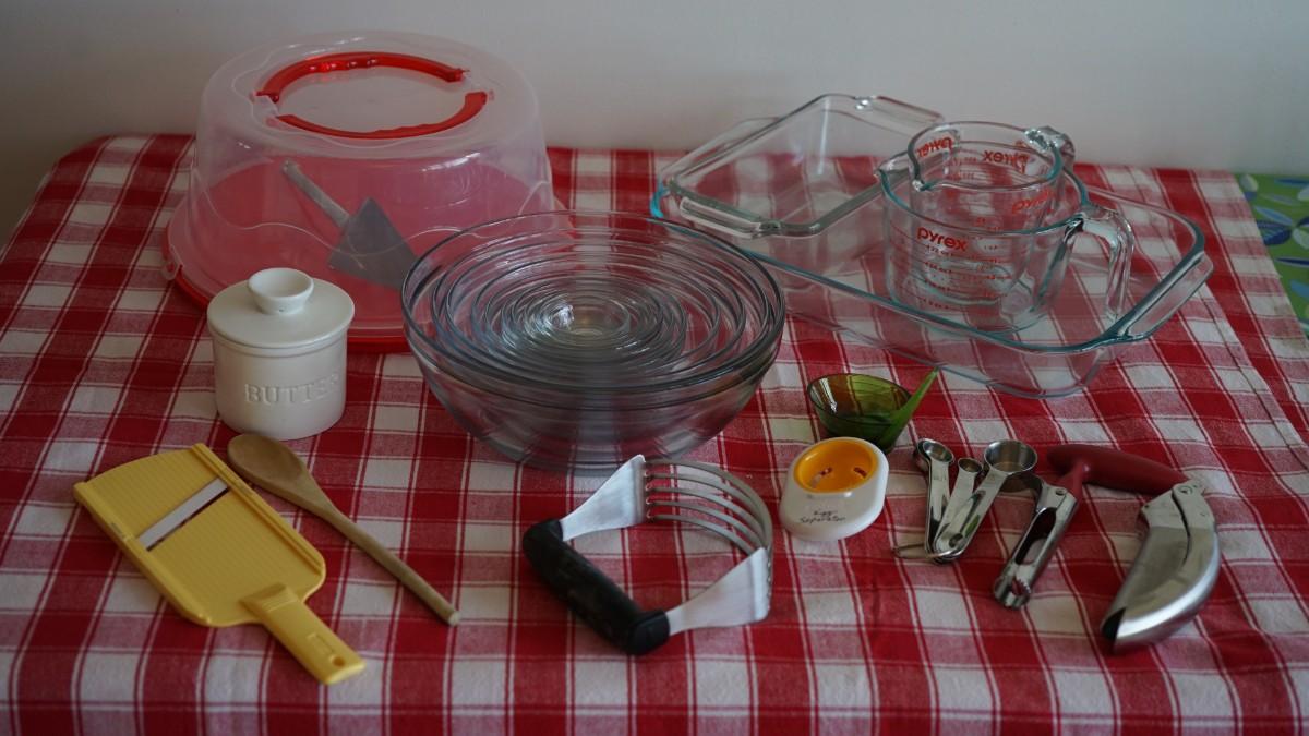 Baking needs to include pastry knife, egg separator, measuring spoons, Kuhn Rikon cracker, graters, butter keeper, jar for keeping that butter keeper with lid. apple corer, wooden spoon, grater. all in very good, lightly used.