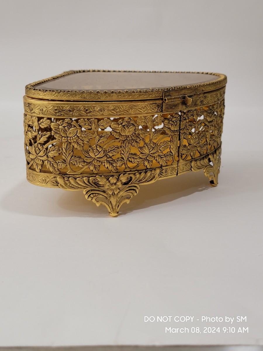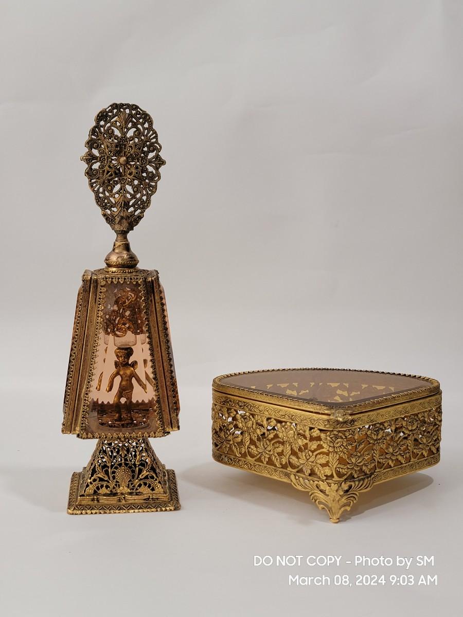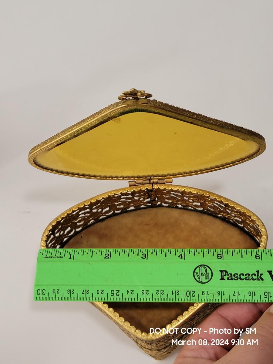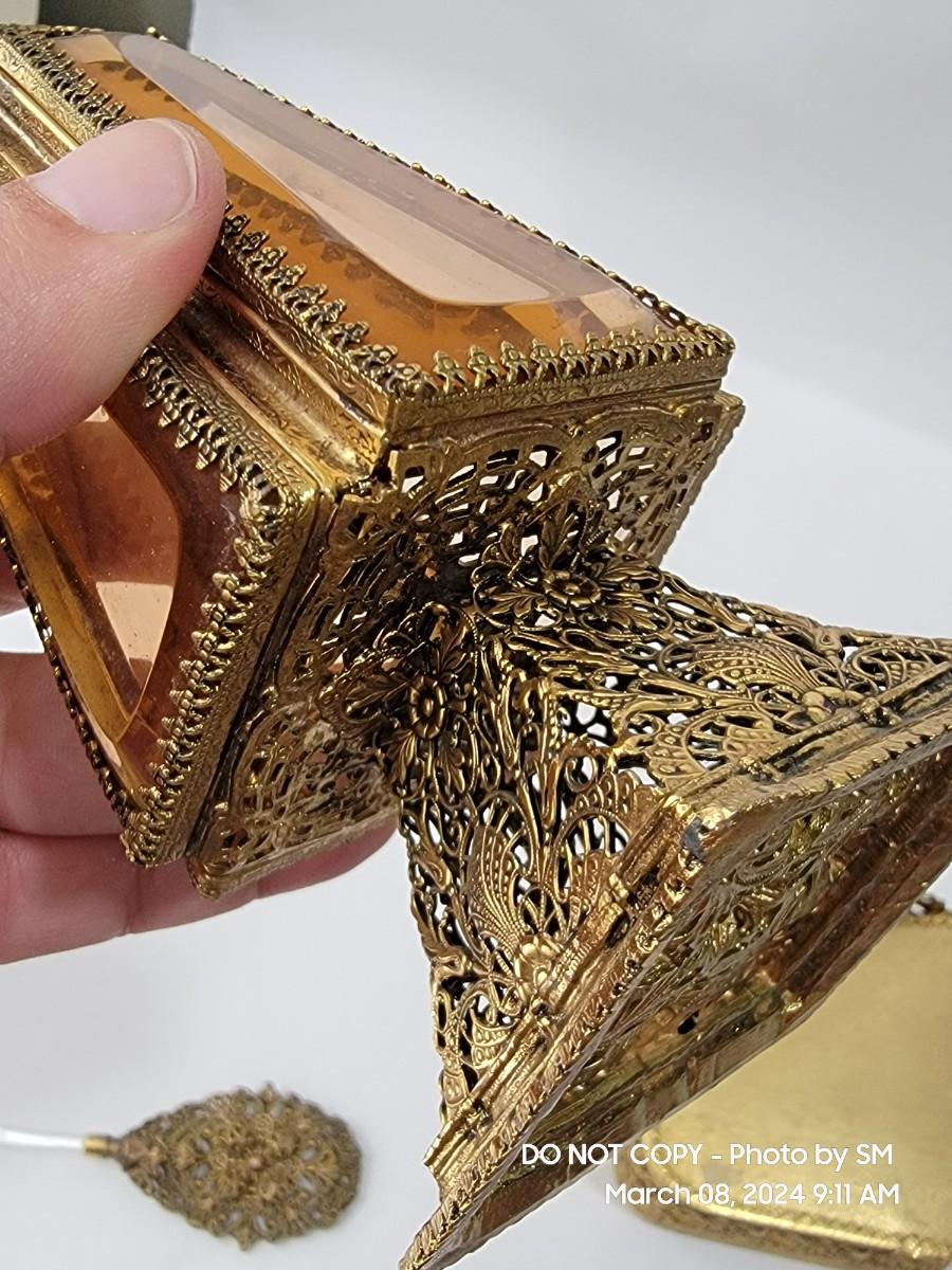 2. Trinket box - only the top has glass and is an amber / yellow color. Inside on bottom it has what feels like velvet. Has dirt some scuffs.