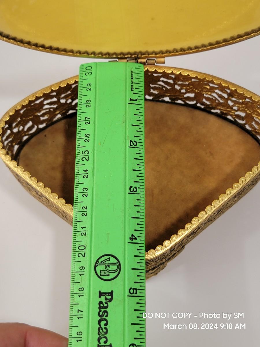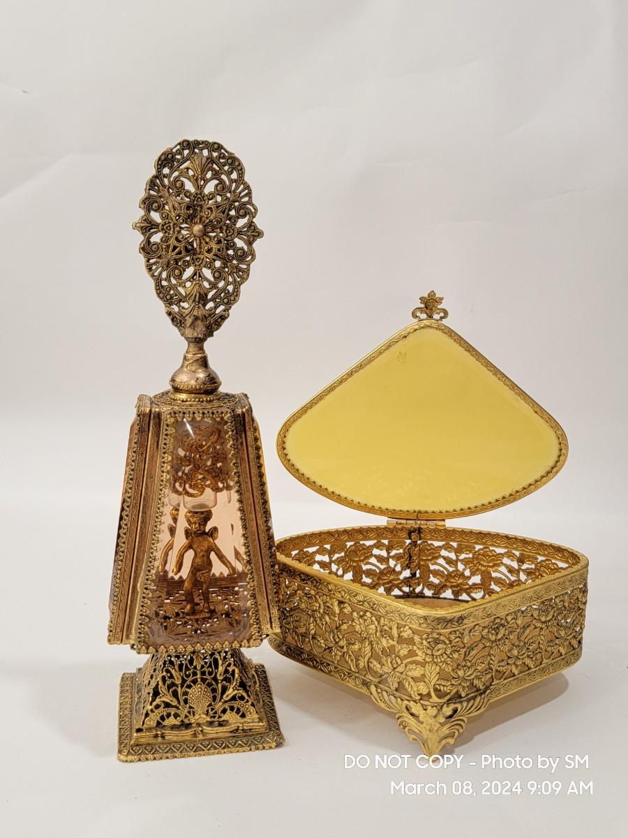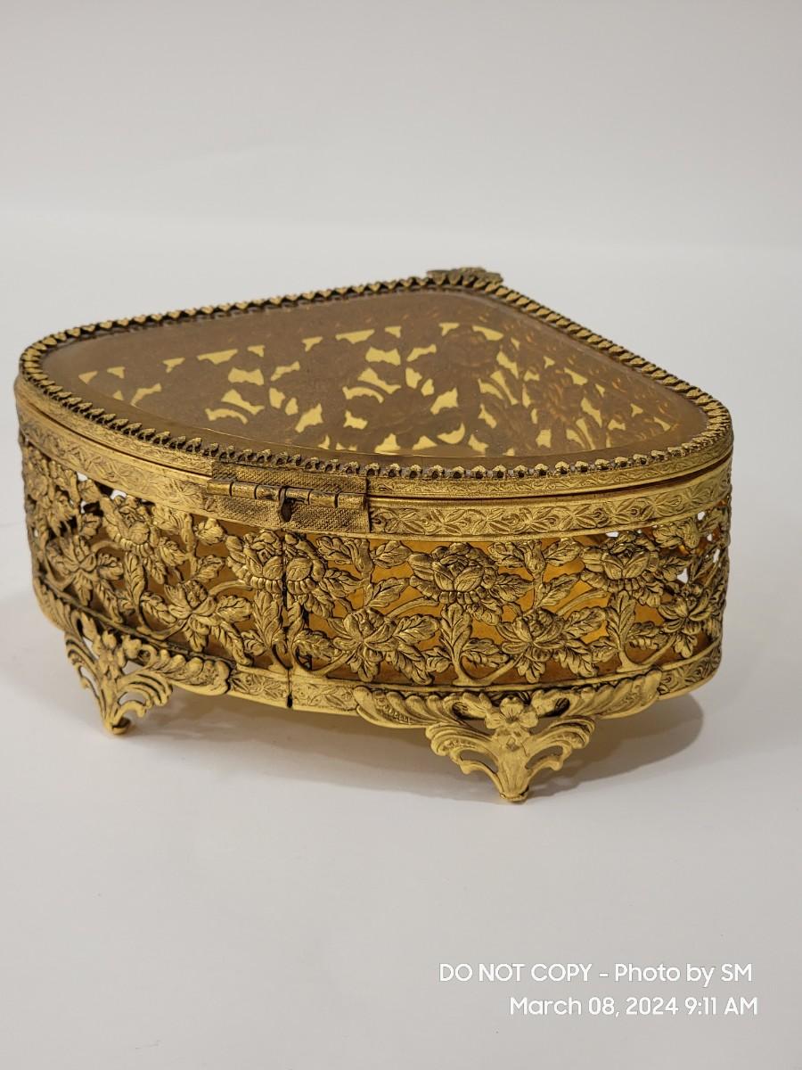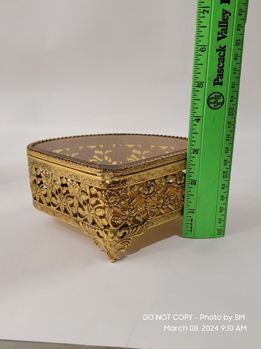 2. Trinket box - only the top has glass and is an amber / yellow color. Inside on bottom it has what feels like velvet. Has dirt some scuffs.