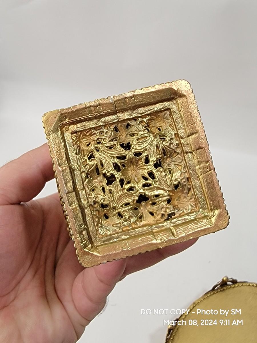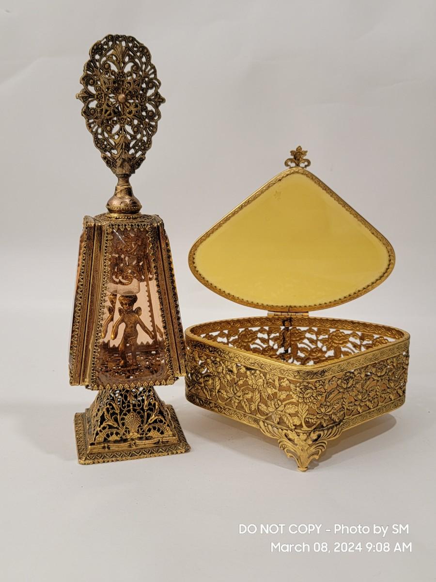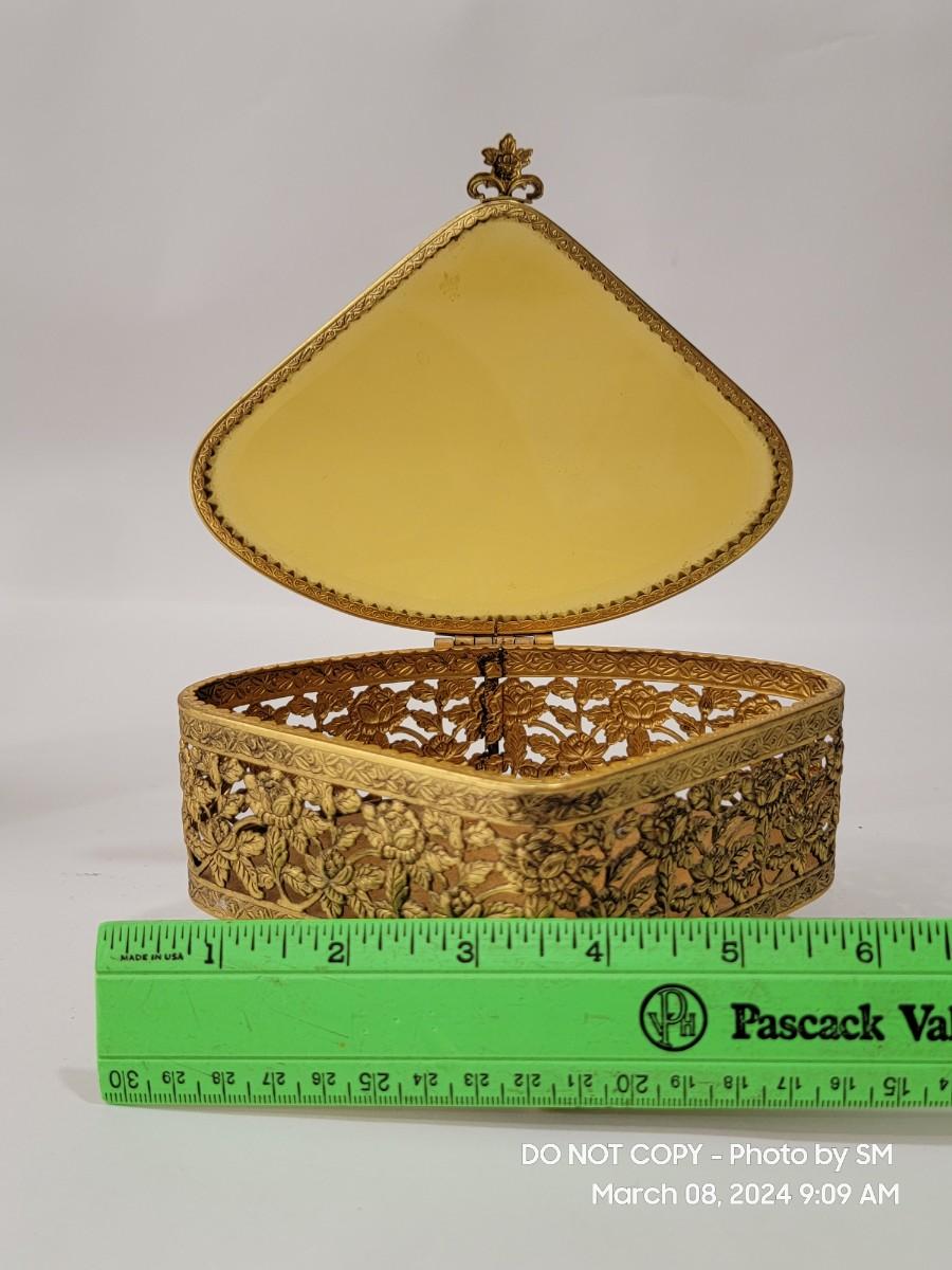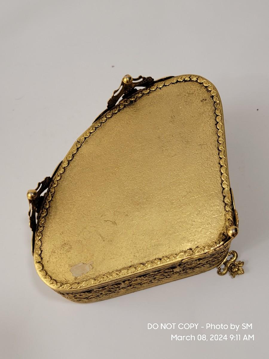 2. Trinket box - only the top has glass and is an amber / yellow color. Inside on bottom it has what feels like velvet. Has dirt some scuffs.