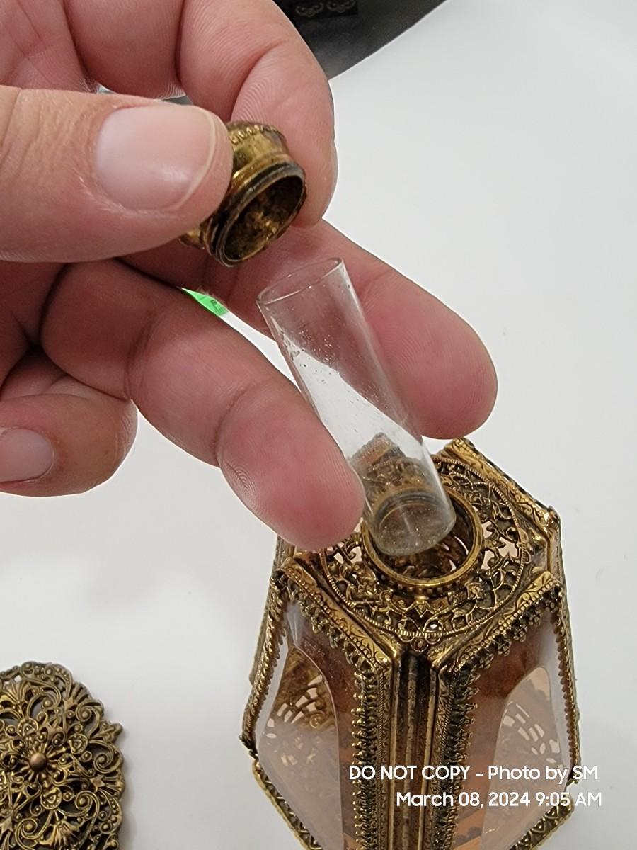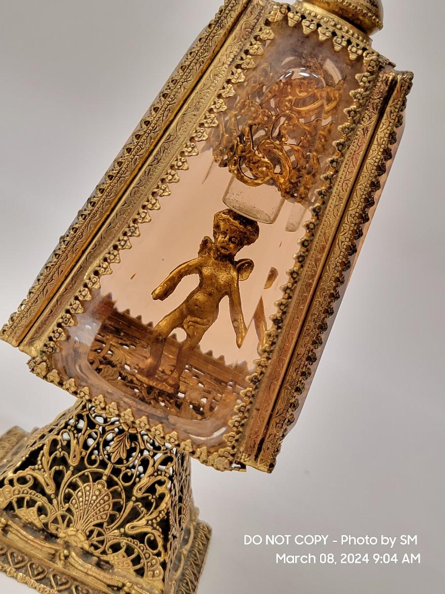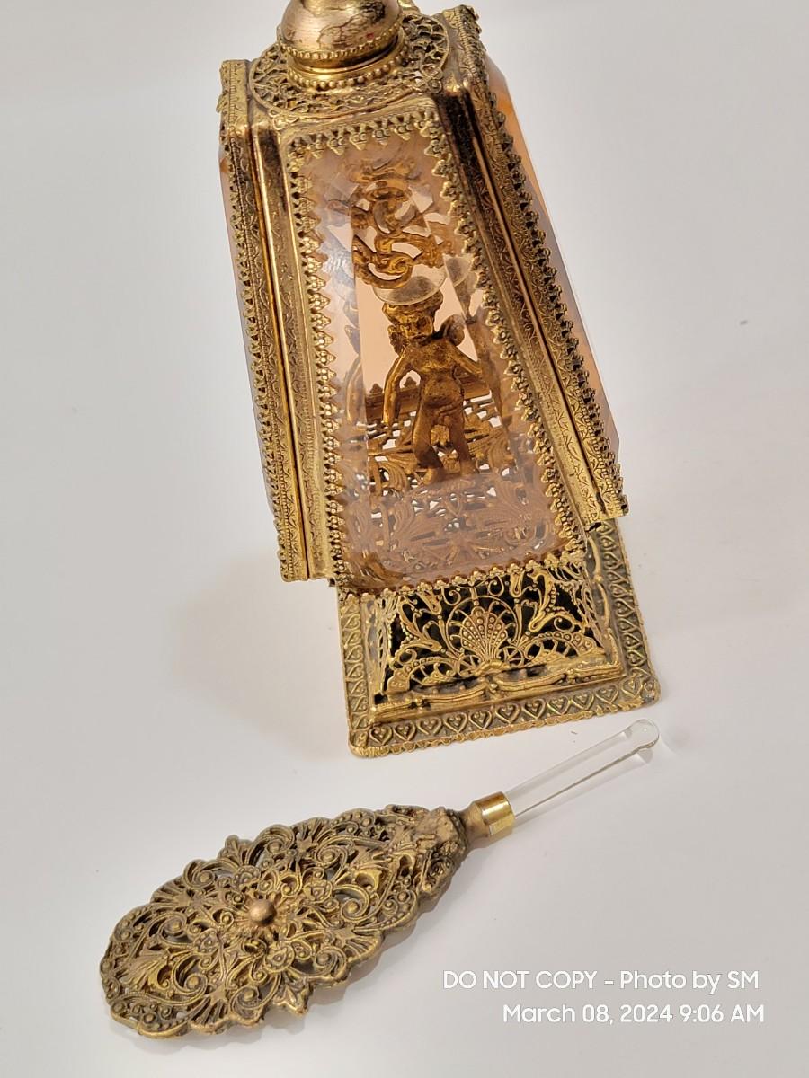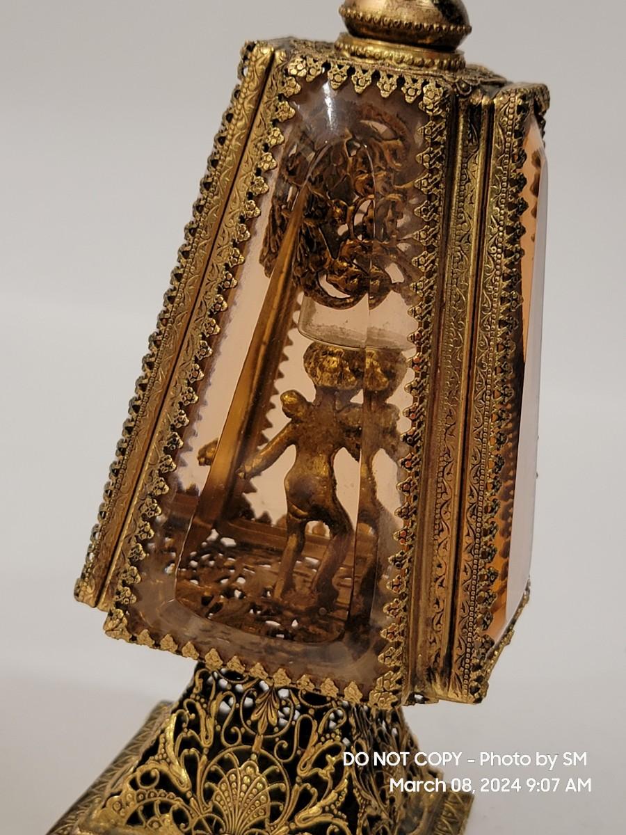 1. Perfume bottle has a peachy brown colored glass. The cherub inside is a first for me, yet adds a whimsical romantic vibe. The top unscrews and the glass vial can come out. I think the glass is supposed to be attached to the screw top - but not sure. Has minor scuffs, aged patina, dark spots, one spot feels like residue or gunk, but might be a minor imperfection in yhe glass like a possible chip ( I thinknits residue) maybe some other minor issues I missed. Overall breathtaking.