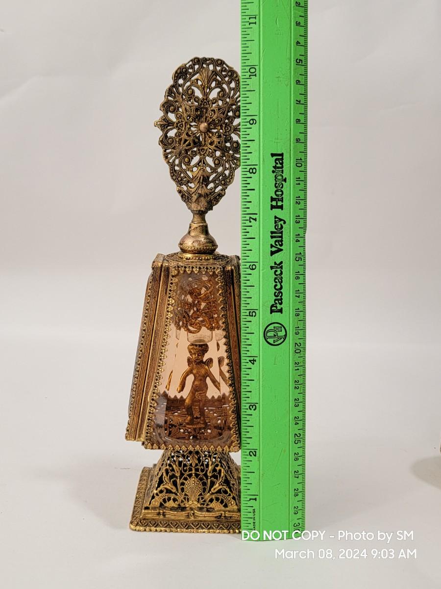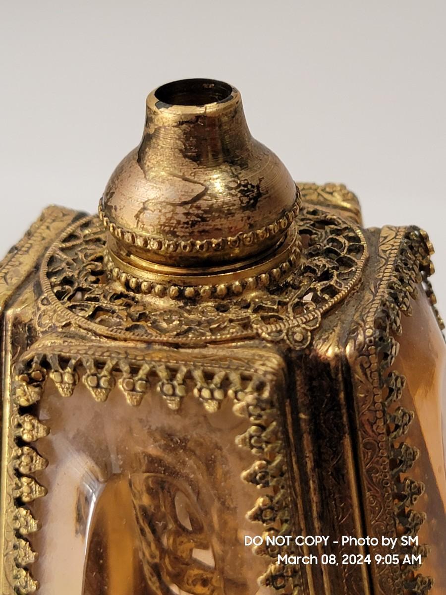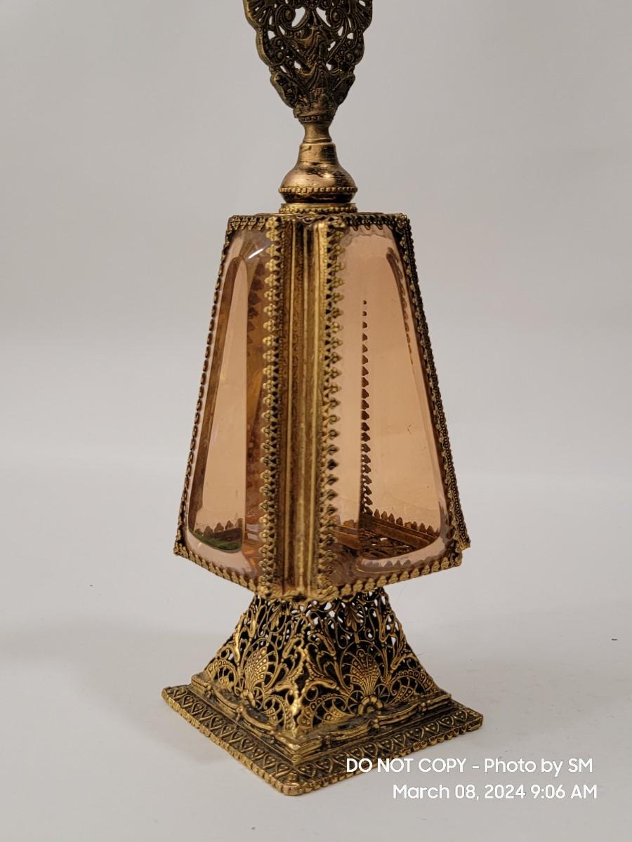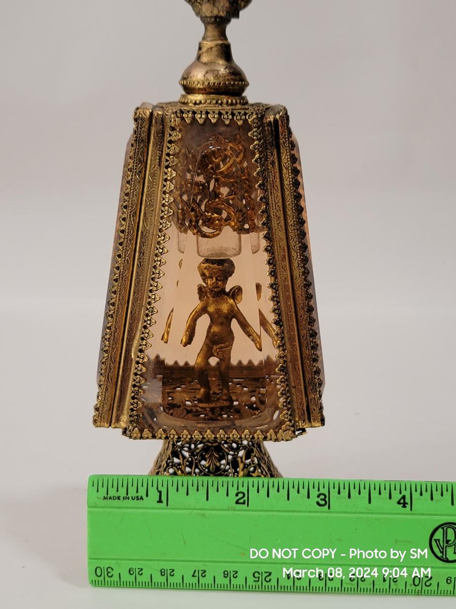 1. Perfume bottle has a peachy brown colored glass. The cherub inside is a first for me, yet adds a whimsical romantic vibe. The top unscrews and the glass vial can come out. I think the glass is supposed to be attached to the screw top - but not sure. Has minor scuffs, aged patina, dark spots, one spot feels like residue or gunk, but might be a minor imperfection in yhe glass like a possible chip ( I thinknits residue) maybe some other minor issues I missed. Overall breathtaking.