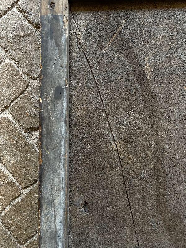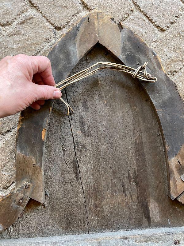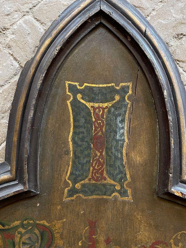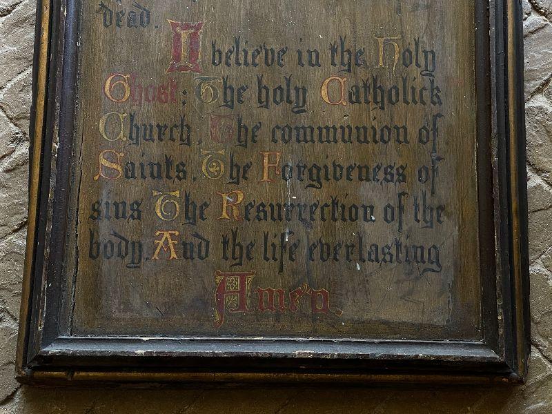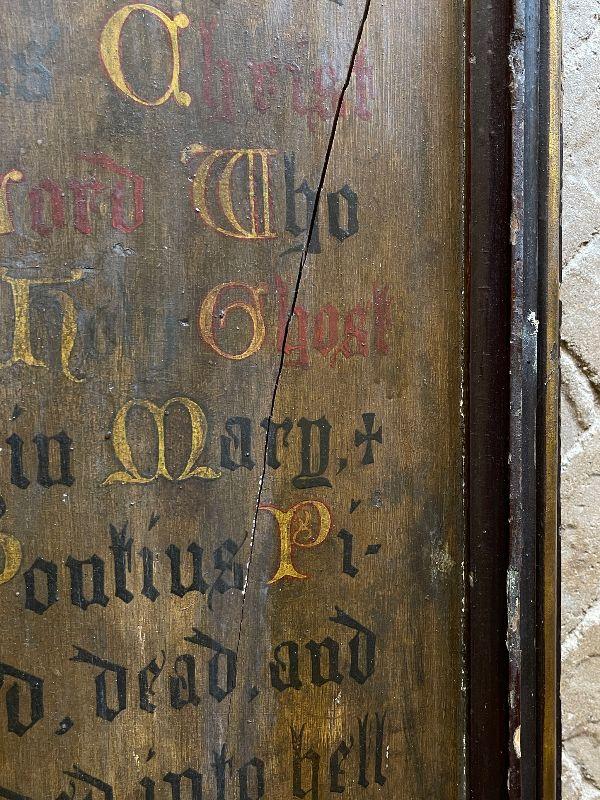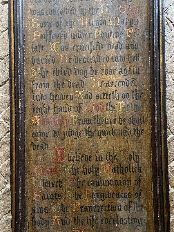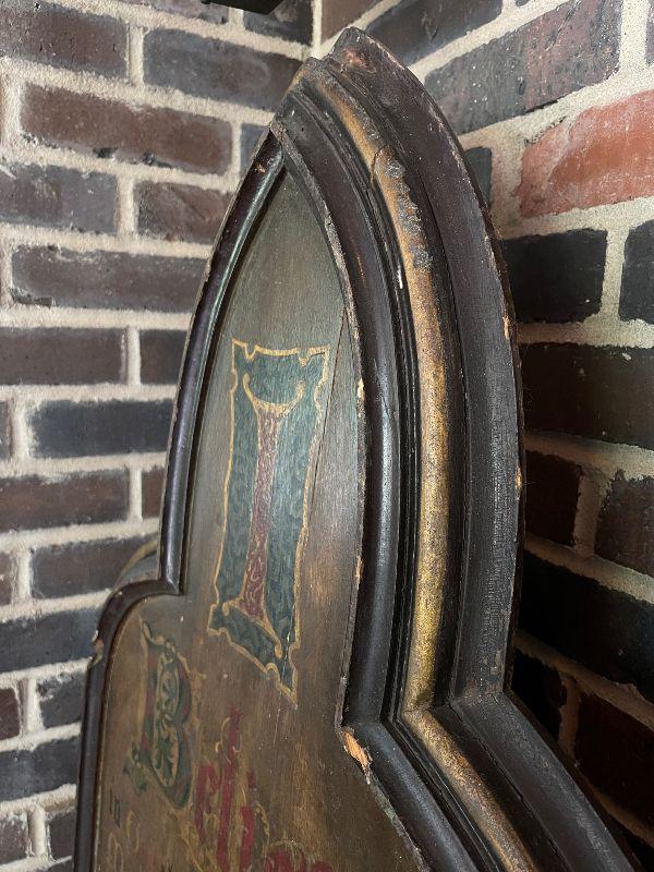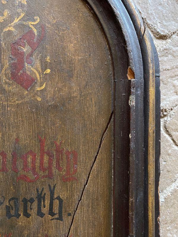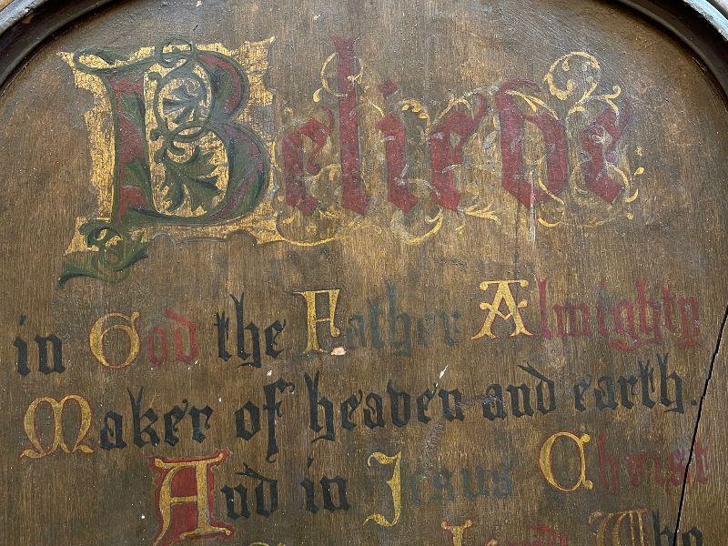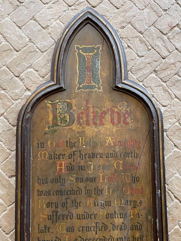 The subject item is a large 19th C antique chapel wall plaque created to help the faithful recite the Apostles' Creed. This hand lettered and painted piece, is, in itself, a work of art. The painted panel in the shape of an arch, has been framed with a simple heavy molding, and has darkened over the decades with excessive exposure to candle smoke, which confirms its use in a venerated setting. The panel has some shrinkage cleaving, but none disrupt the image or compromise structural integrity.