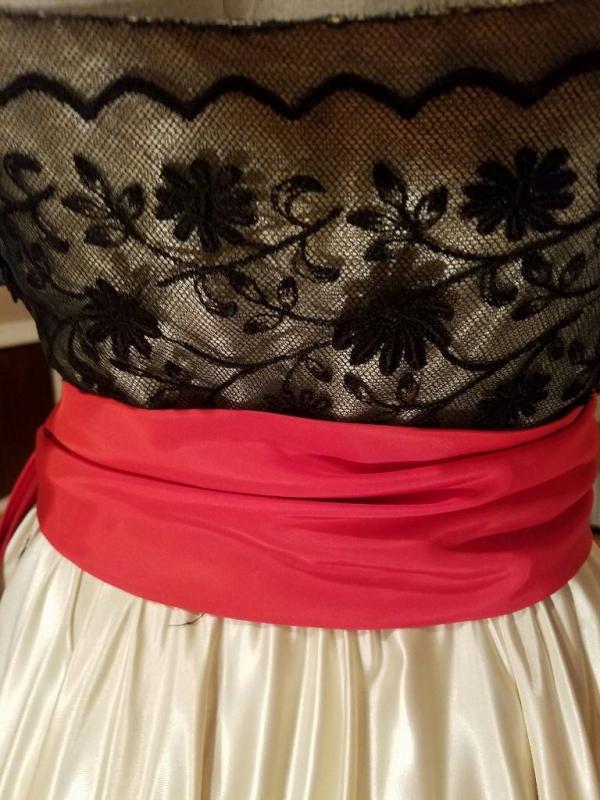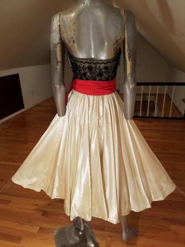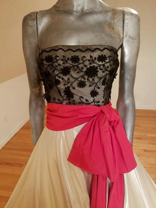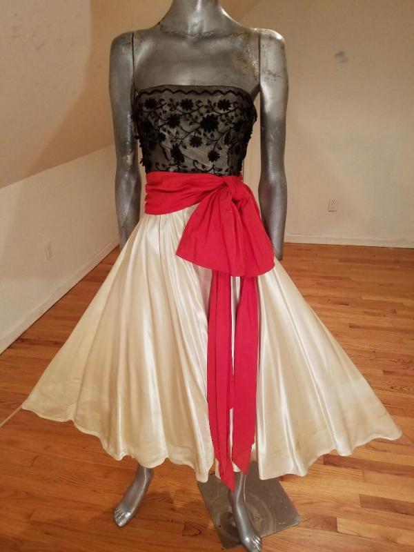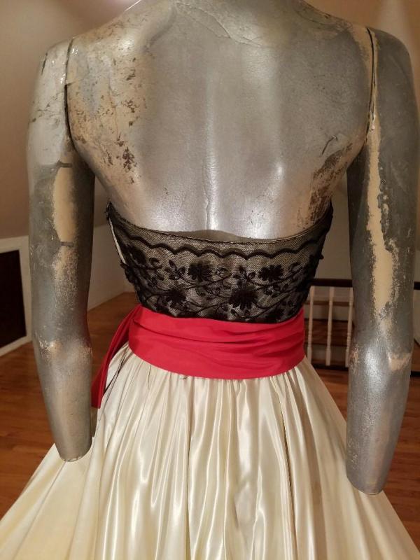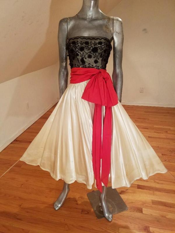 Hollywood Starlet Ethel Allan's Estate Stamford Conn. Circa 1950's . This one is drop dead gorgeous. The skirt has yards of Peau de Soie in a an eggshell coloration The bodice is a French Guipure dentelle on tulle atop a Soie forming an illusion strapless bodice , and the waist is adorned by a wide red satin sash with bow. Magnificent gown to say the least. In very good vintage condition but will need a cleaning at the skirt and bow.