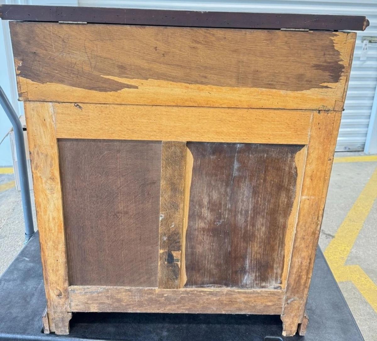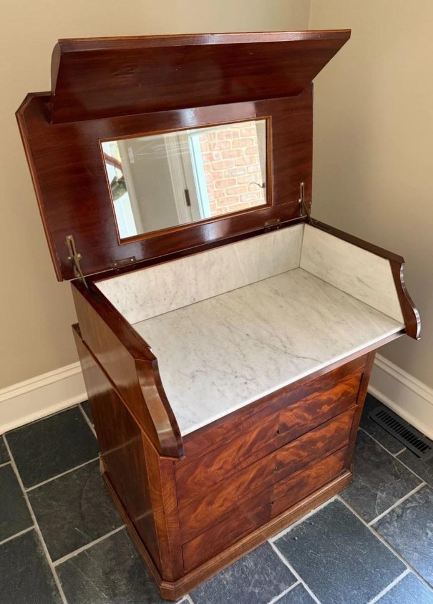 Antique 1850's French Louis Phillippe Dressing Table or Wash Bin with Hinged Lid that opens to a Mirror & Marble Interior. Hand Jointed Detail. Mahogany Veneer.