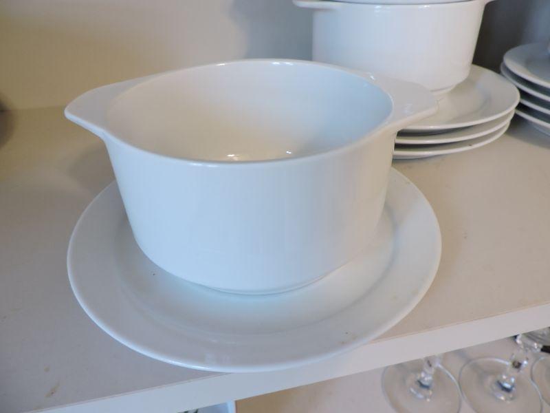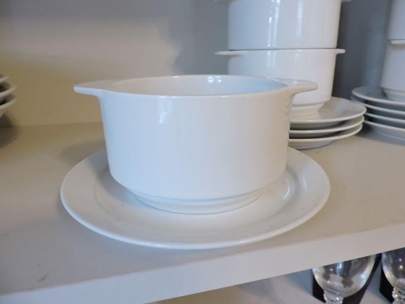 Eight crocks with saucers. Just in time for those cold nights. **Please read Terms and Conditions before placing a bid. Pick up is Saturday, November 30 from 9am to 3pm in Bridgeton, NJ. All sales are final. All sales are as is, where is. Please review all photos. Any props included in photos are not included in listing. All measurements are approximate.
