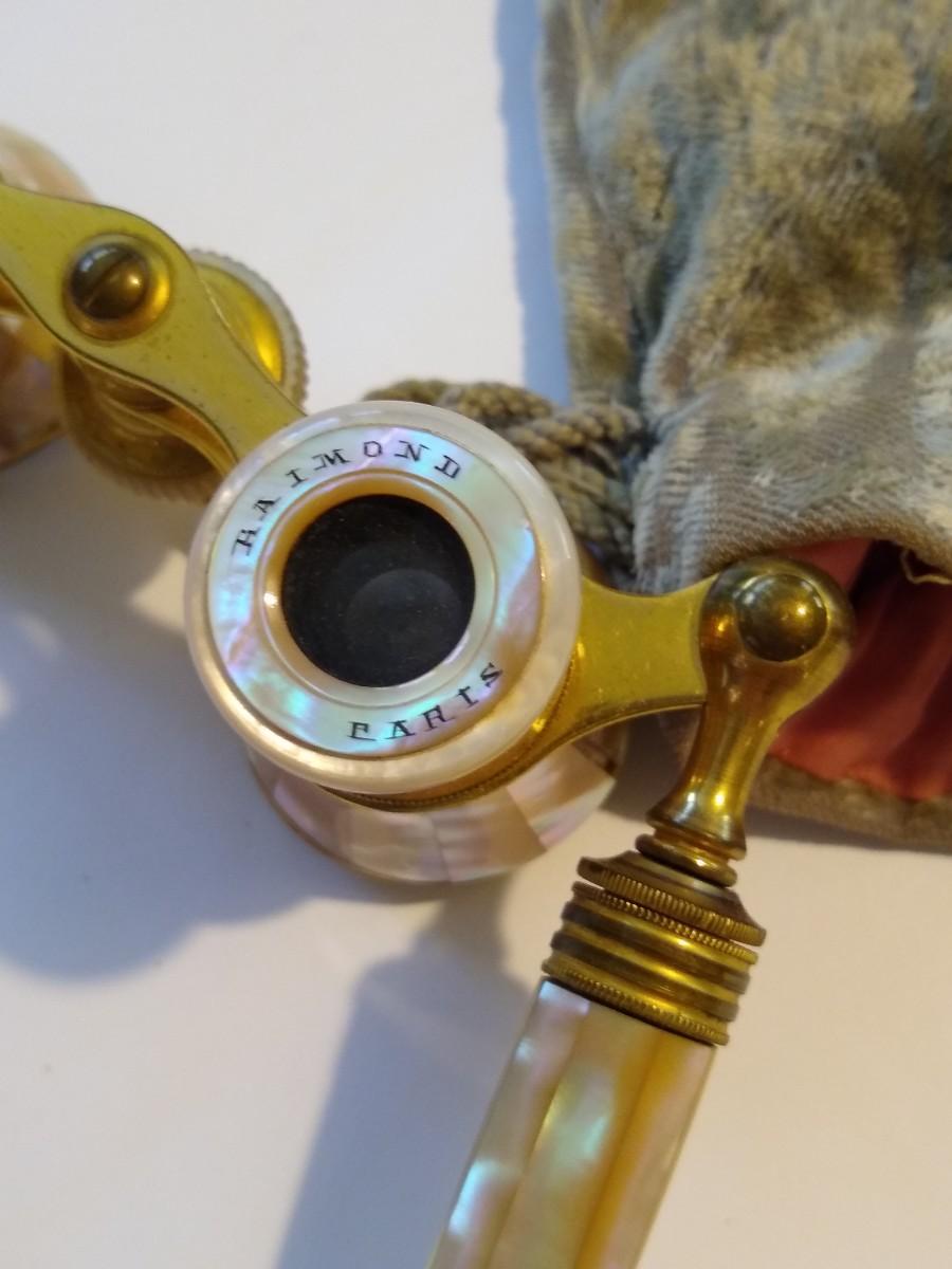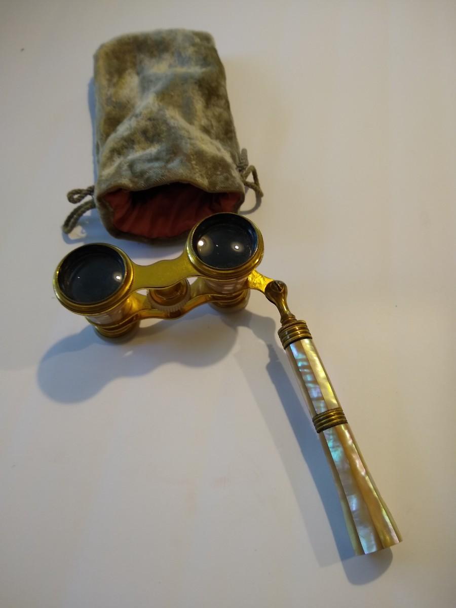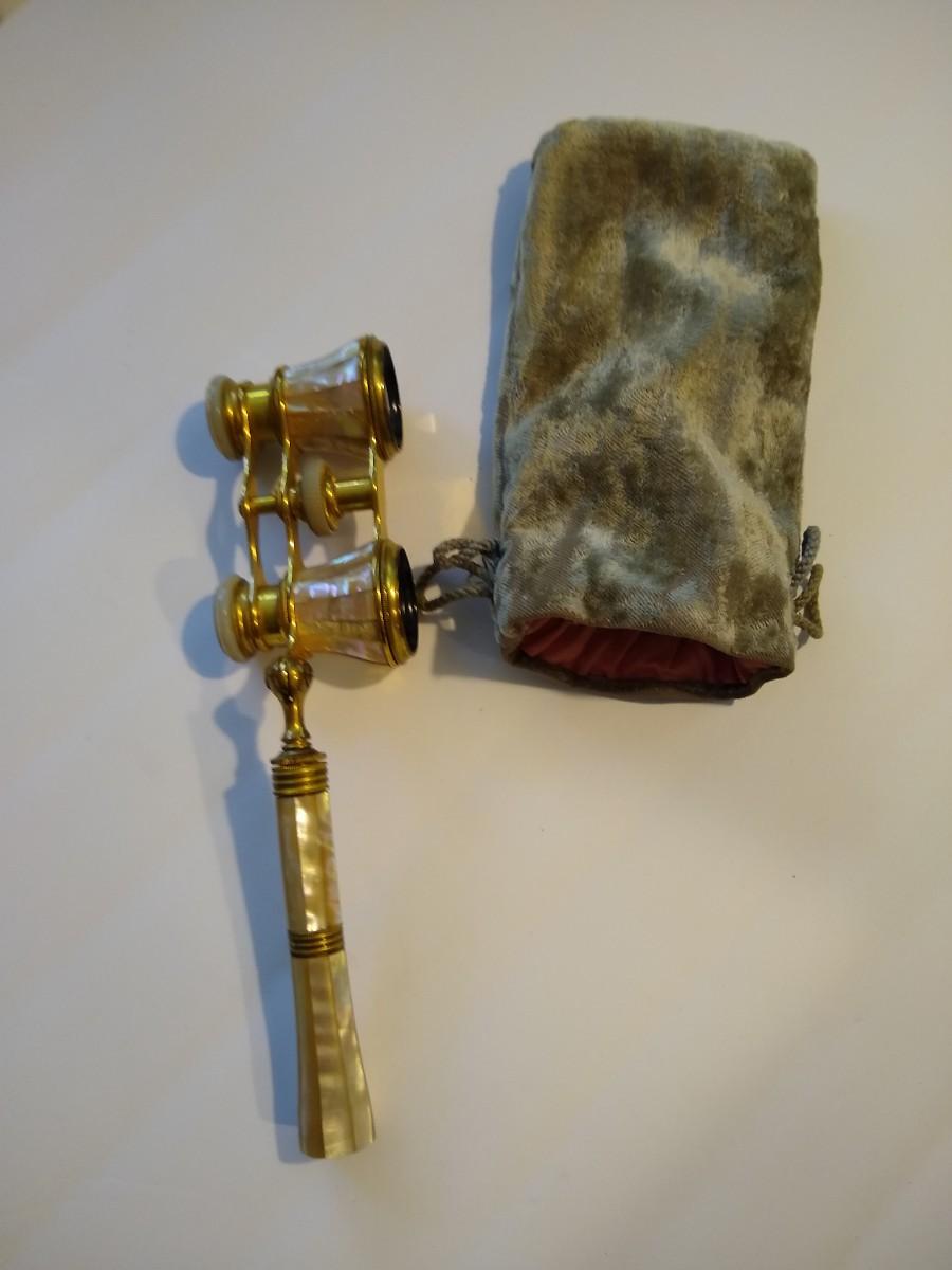 Antique French Opera Glasses Mother Of Pearl in velvet pouch. One panel of mother of pearl missing.