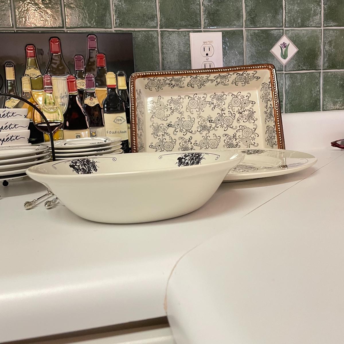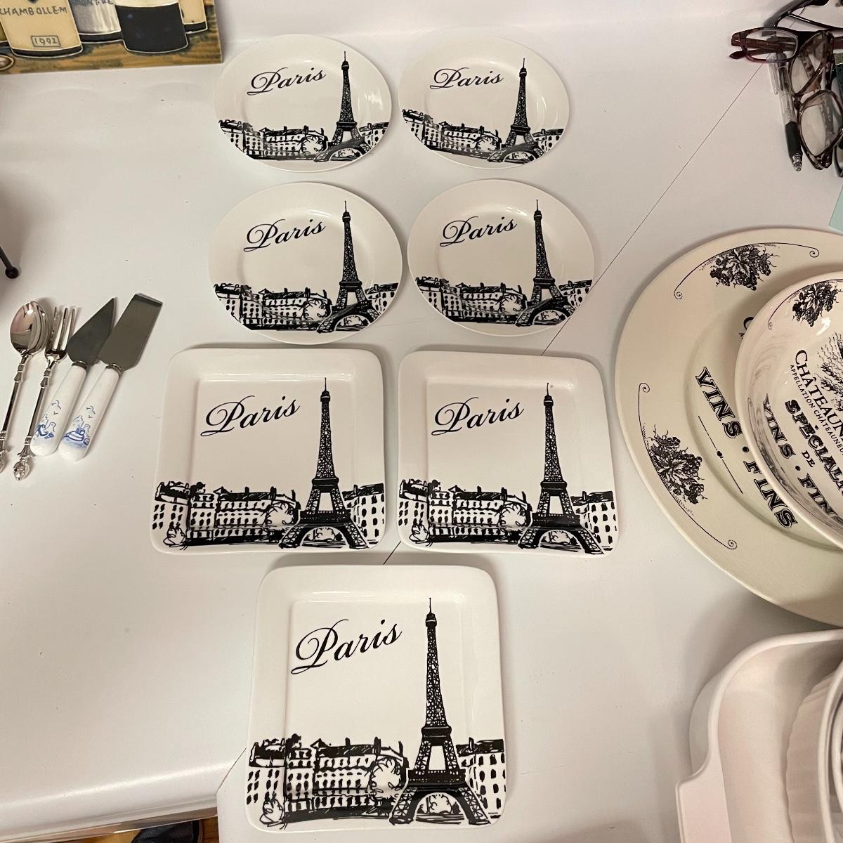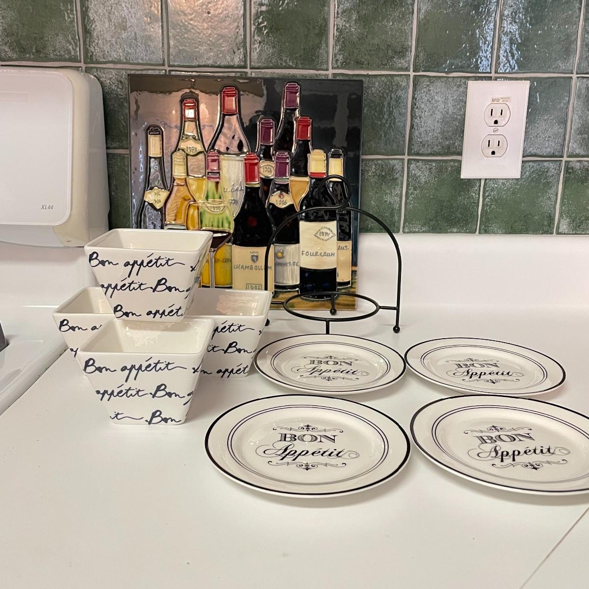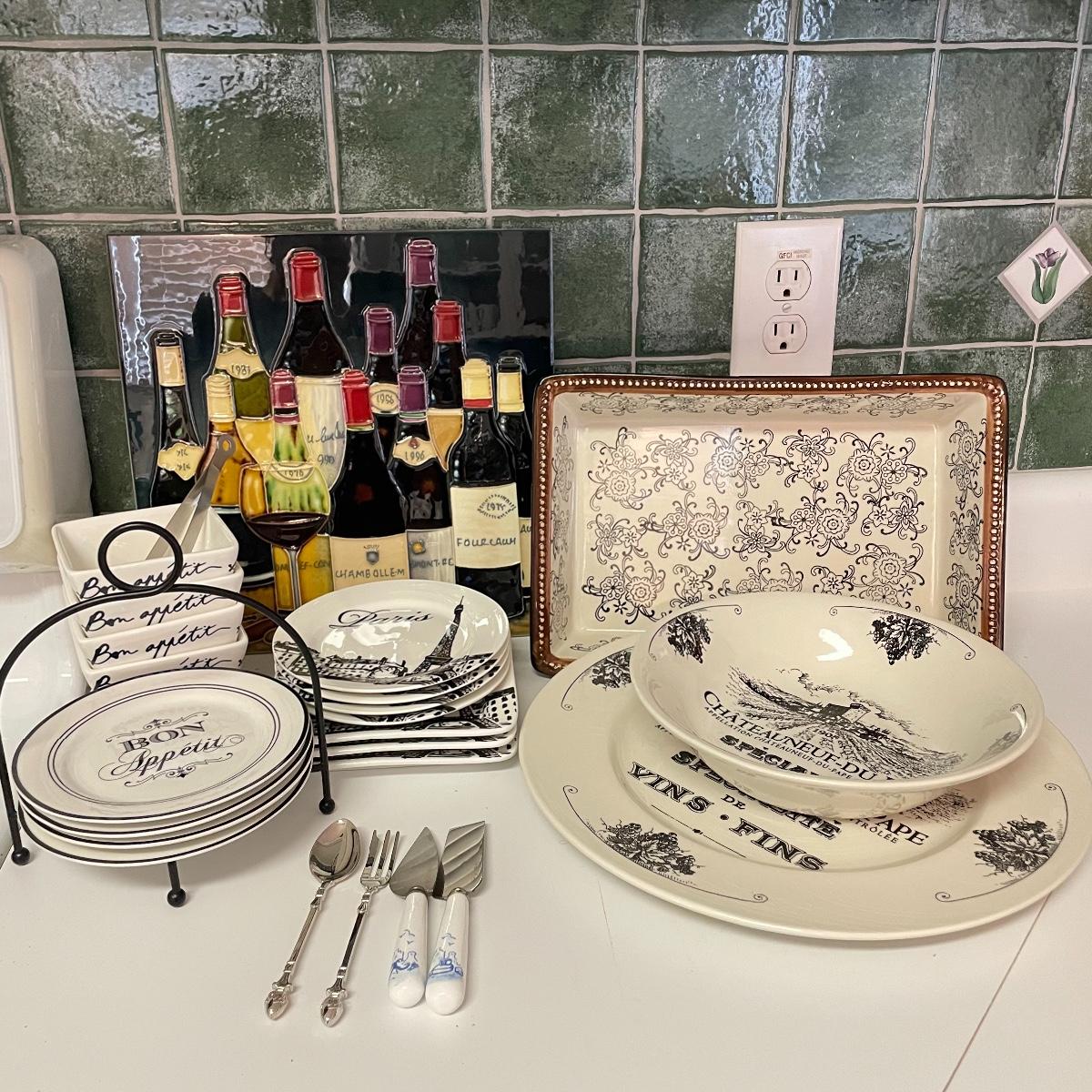12”sq glazed wine art, appears to be tile based. Four small square bowls (4”sq x 3”) with eight 5.75” d plates, three utensils and three square 6”sq plates. Platters include 12.5”d and 9”d serving bowl, 12.5” x 8.5” Blue Harbor stoneware casserole dish. Local pick up only.