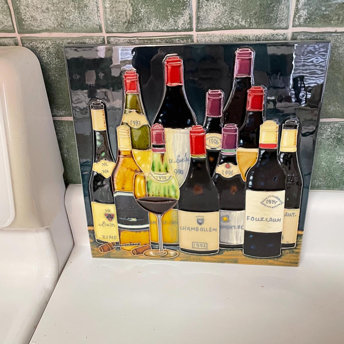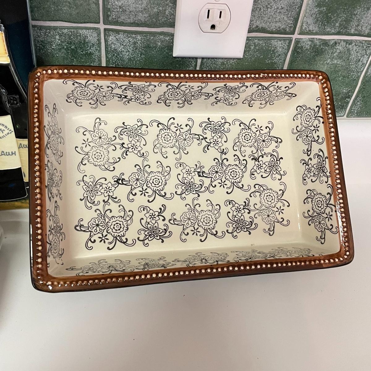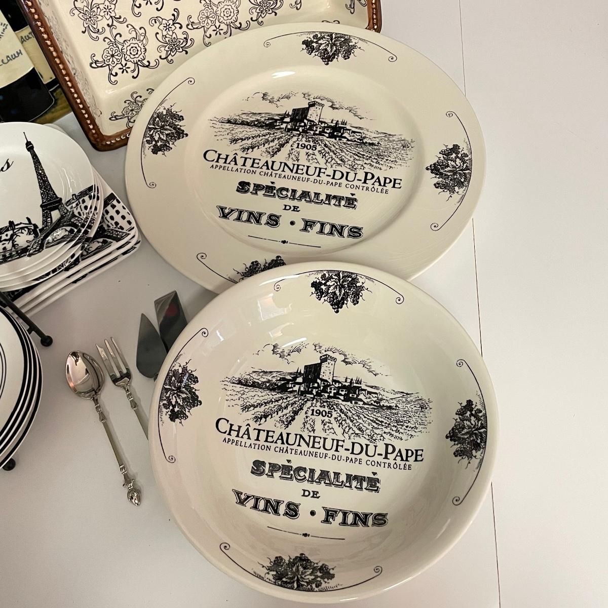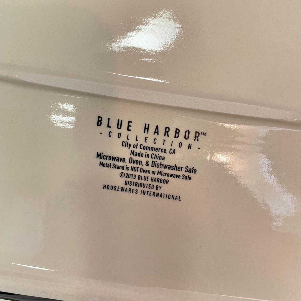 12”sq glazed wine art, appears to be tile based. Four small square bowls (4”sq x 3”) with eight 5.75” d plates, three utensils and three square 6”sq plates. Platters include 12.5”d and 9”d serving bowl, 12.5” x 8.5” Blue Harbor stoneware casserole dish. Local pick up only.
