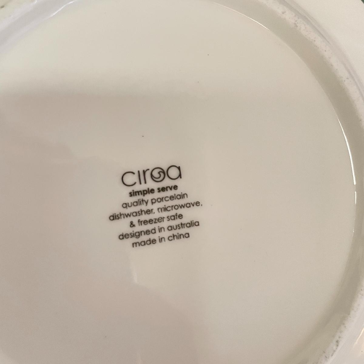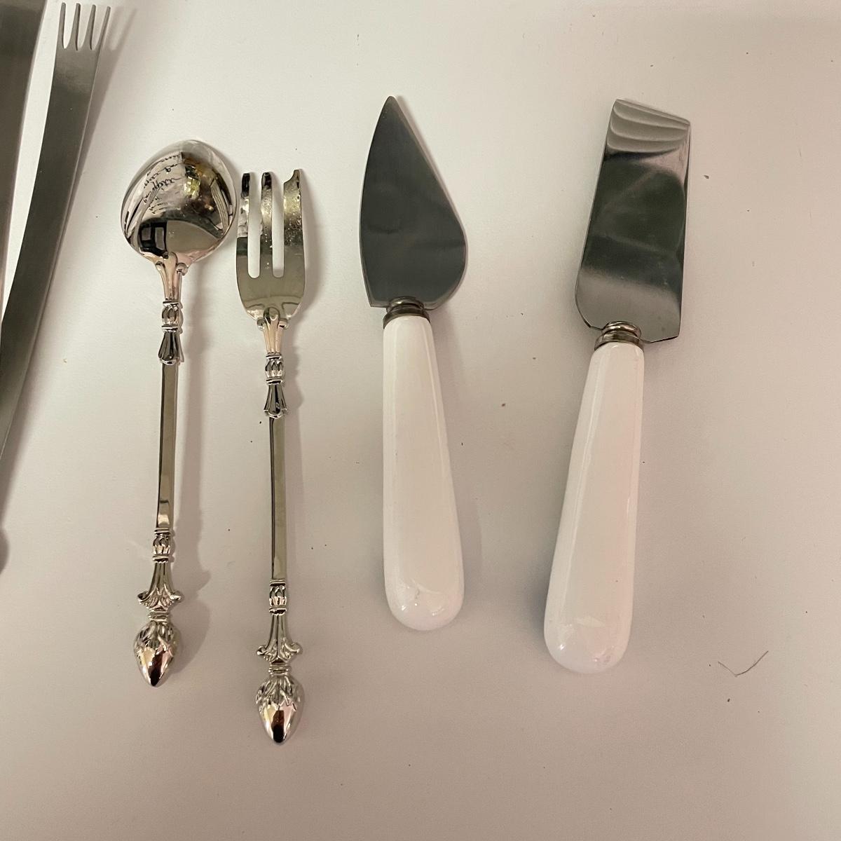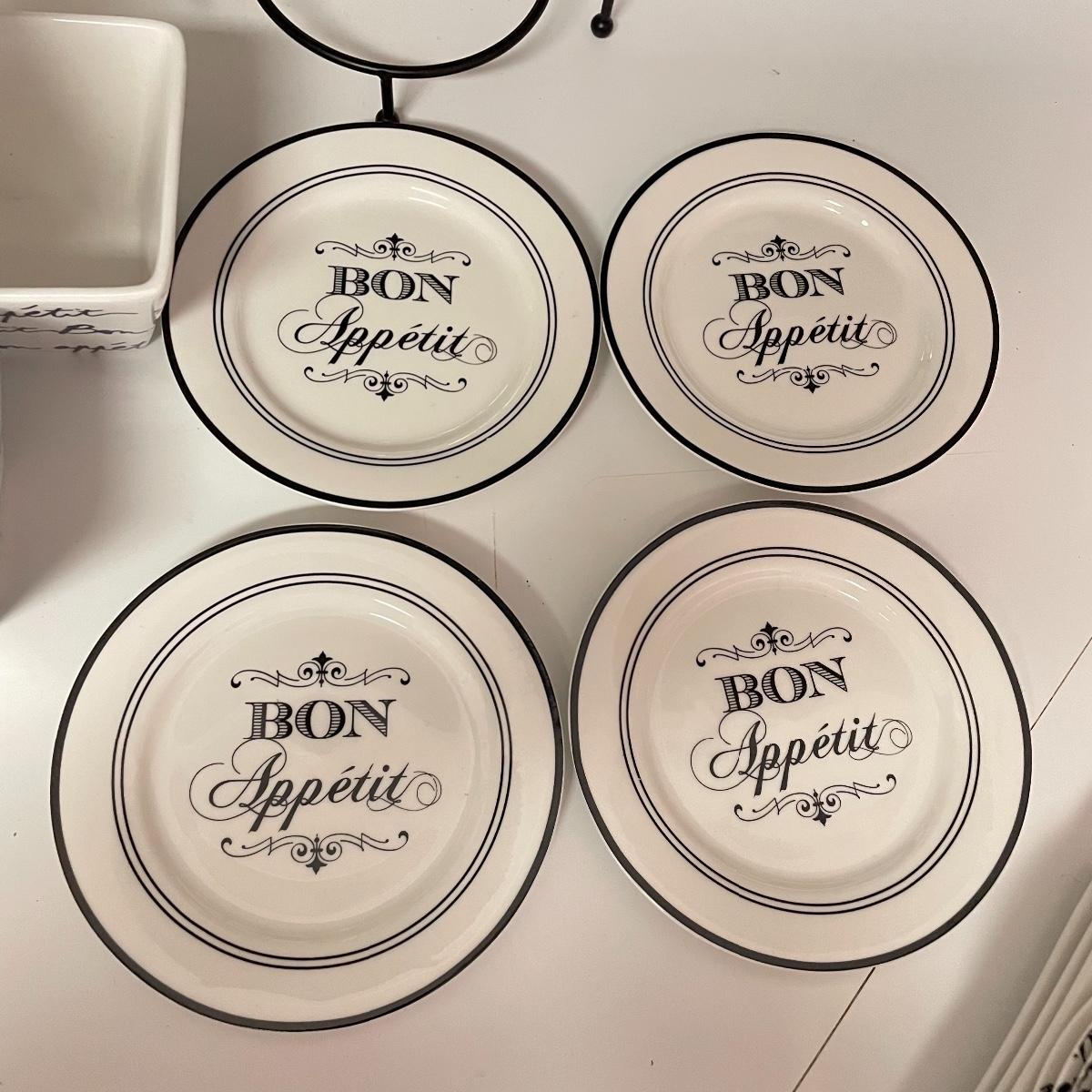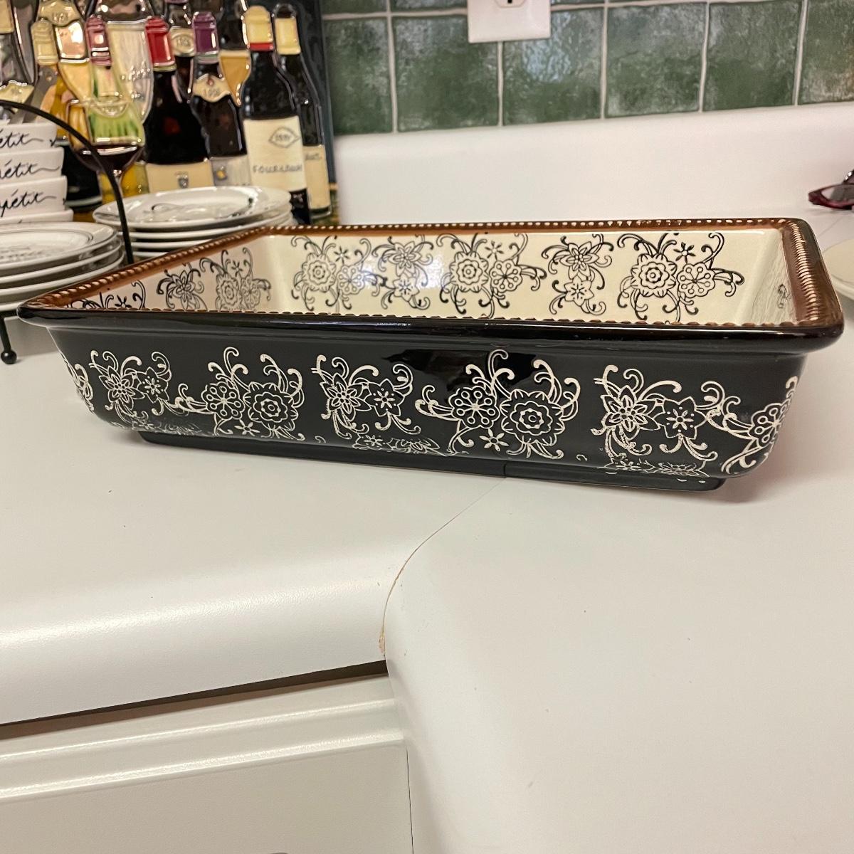 12”sq glazed wine art, appears to be tile based. Four small square bowls (4”sq x 3”) with eight 5.75” d plates, three utensils and three square 6”sq plates. Platters include 12.5”d and 9”d serving bowl, 12.5” x 8.5” Blue Harbor stoneware casserole dish. Local pick up only.