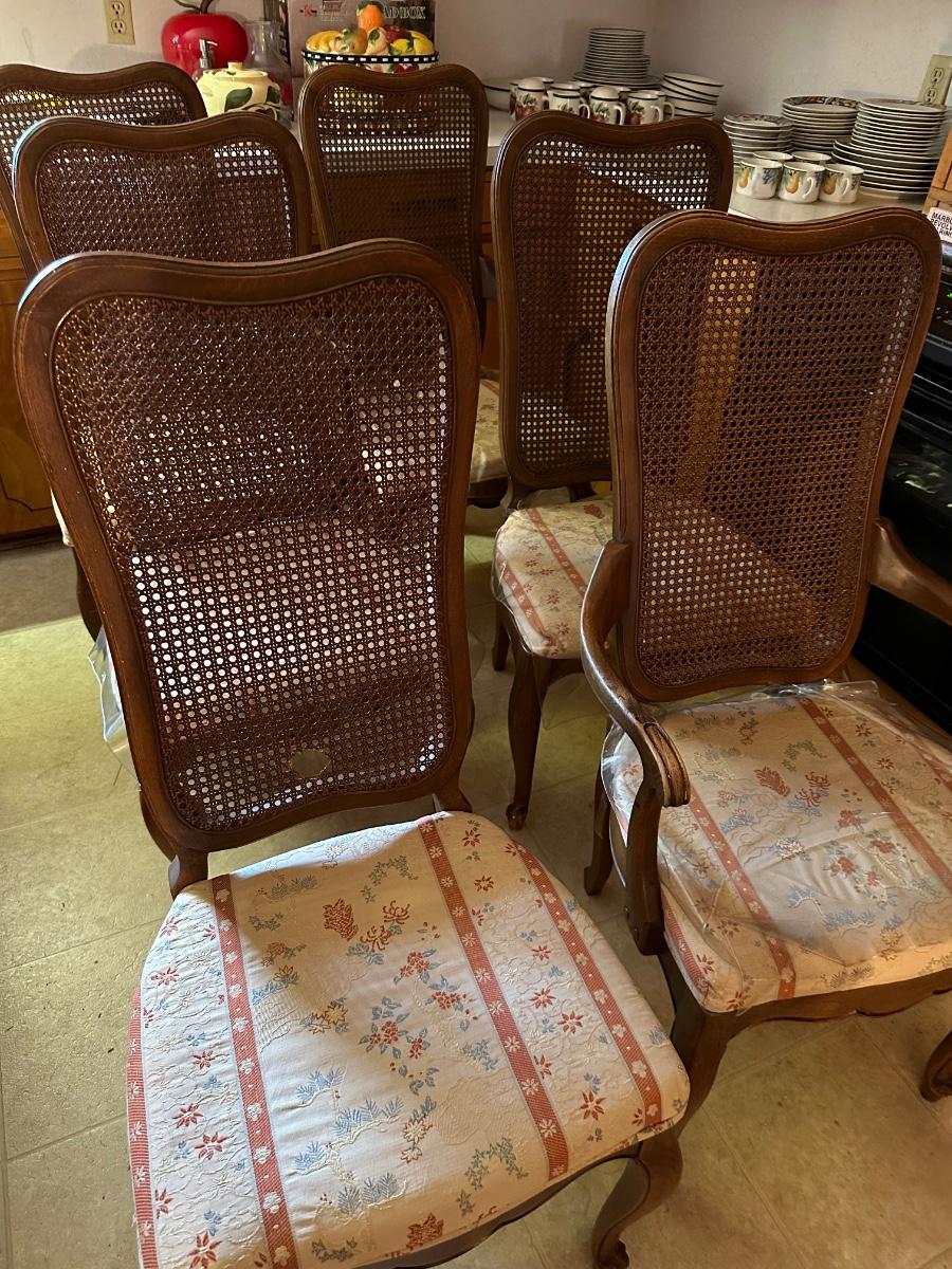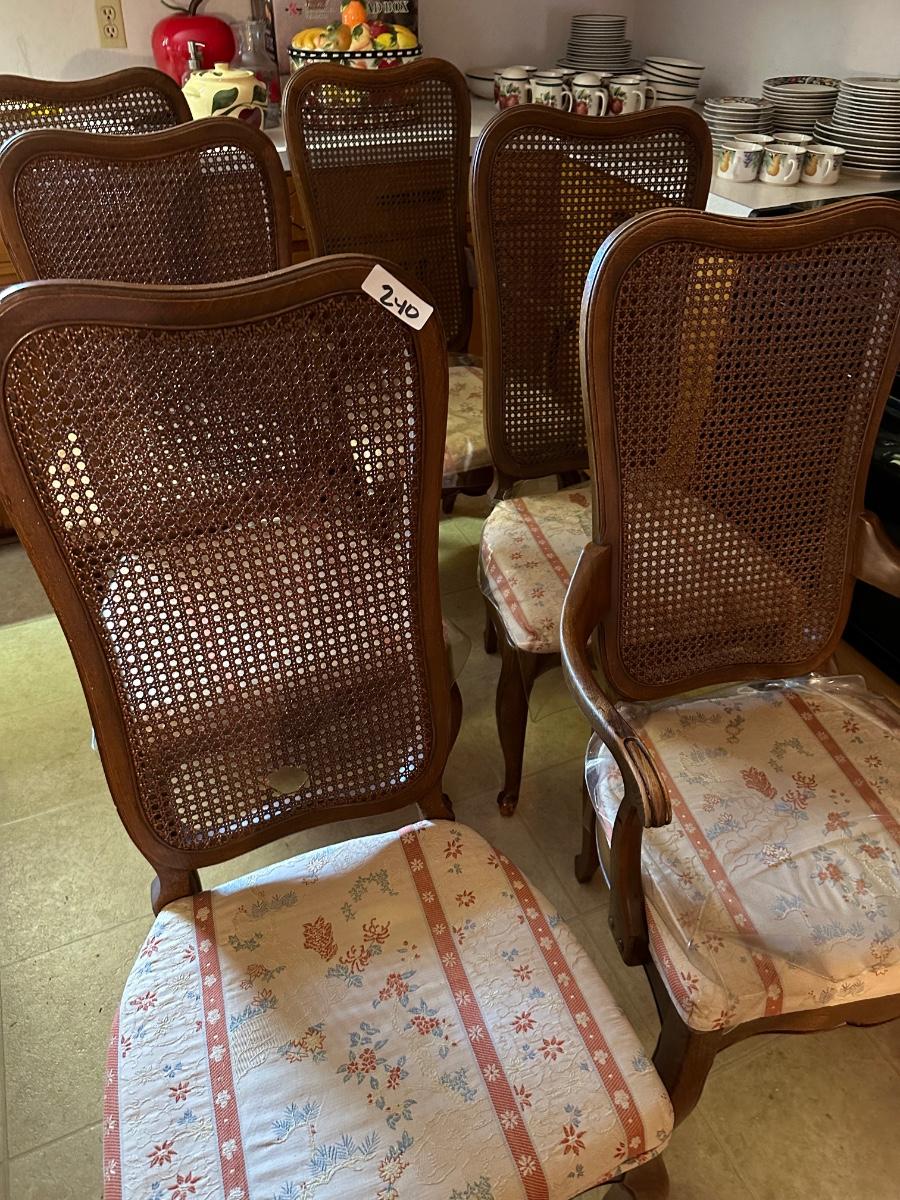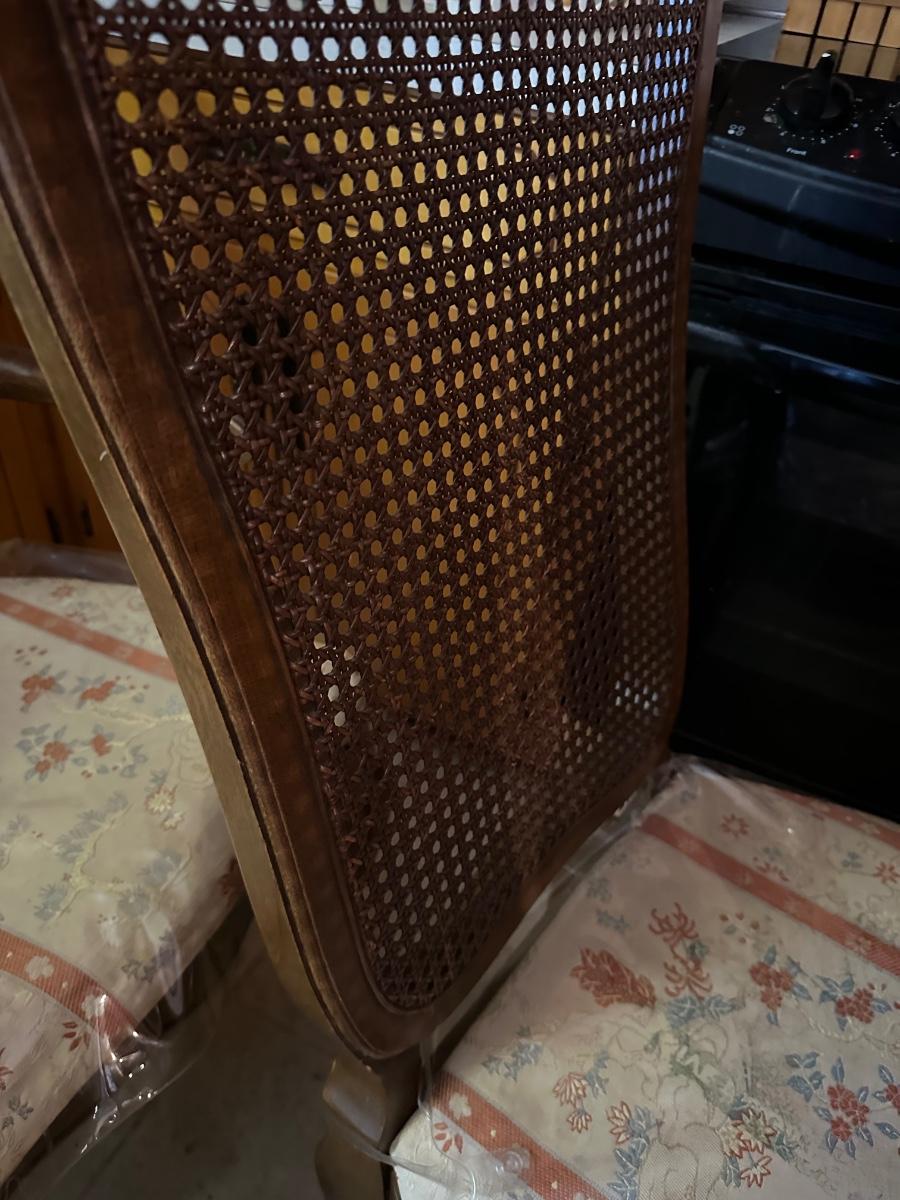 6 FRENCH PROVINCIAL DINING CHAIRS, 1 CANE BACK HAS HOLE, MINOR STAINS ON SEATS AS PICTURED
