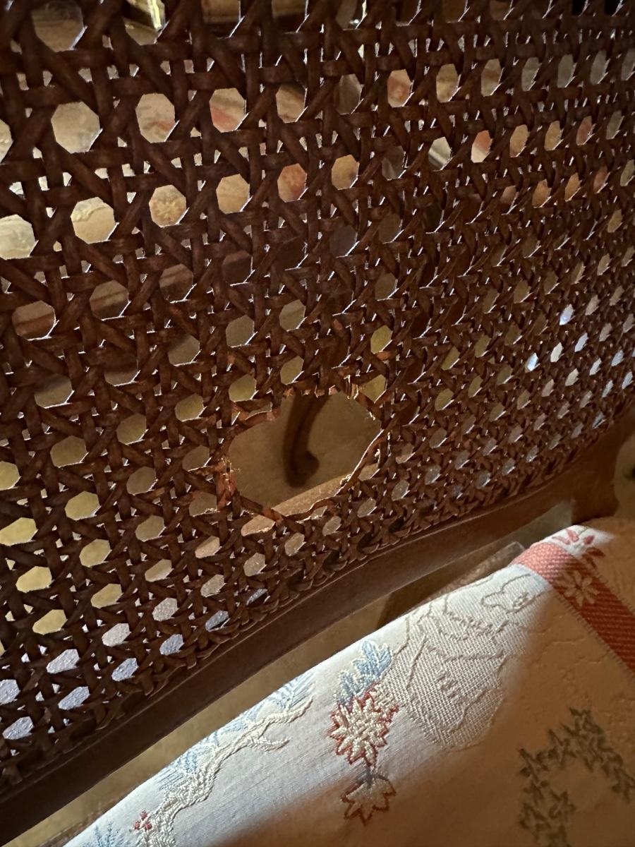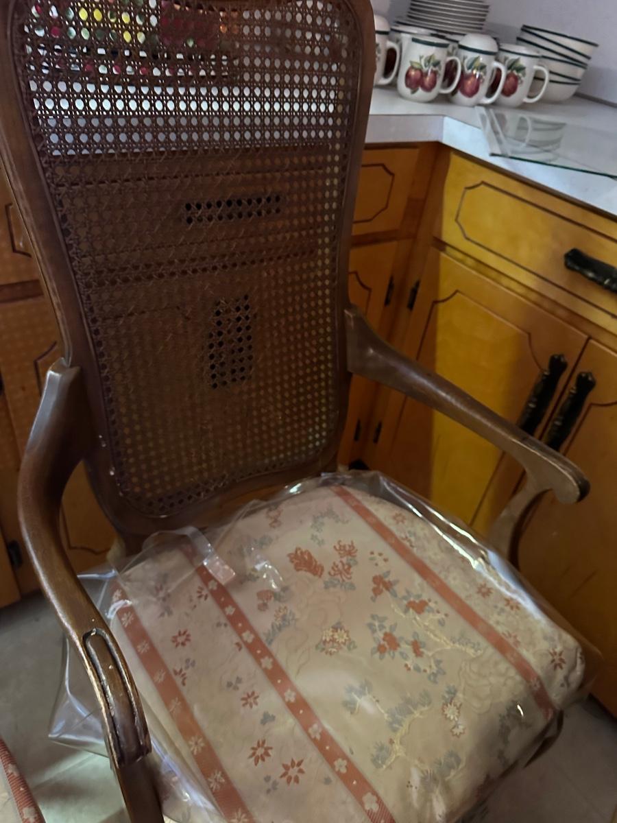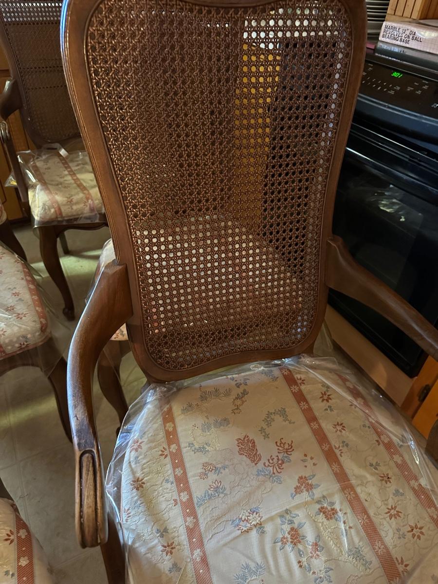 6 FRENCH PROVINCIAL DINING CHAIRS, 1 CANE BACK HAS HOLE, MINOR STAINS ON SEATS AS PICTURED