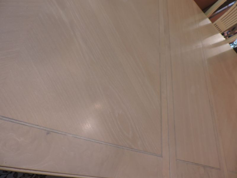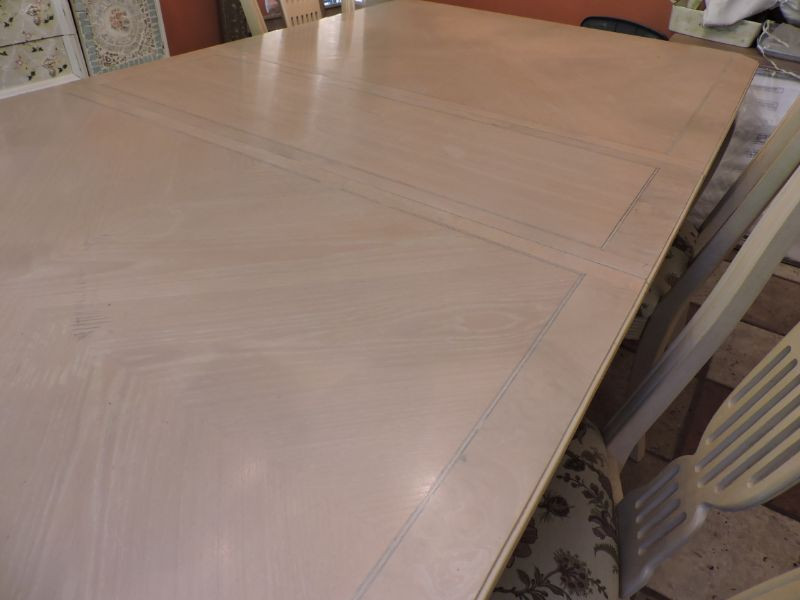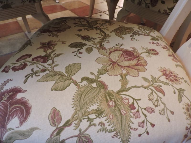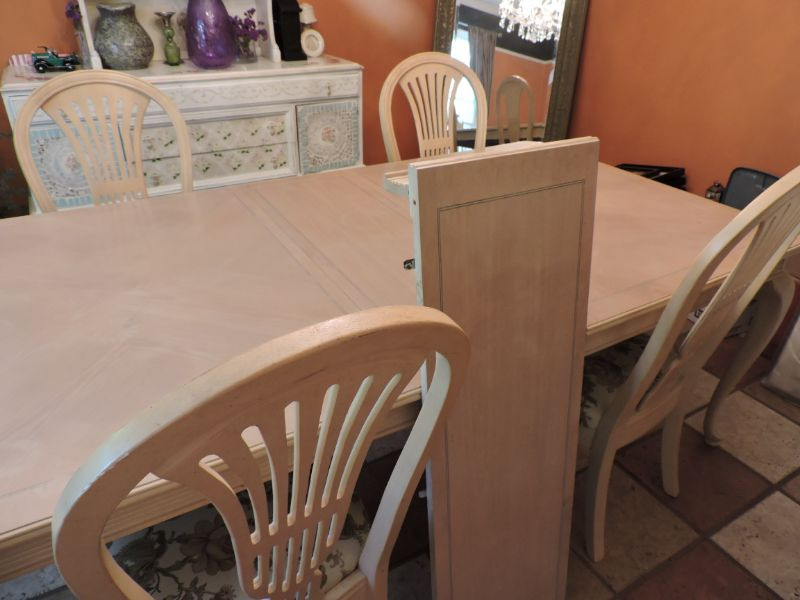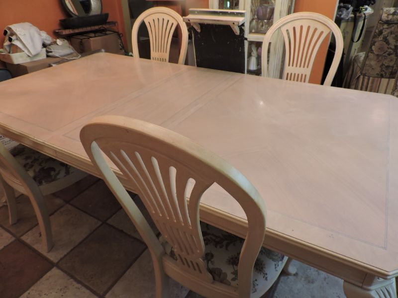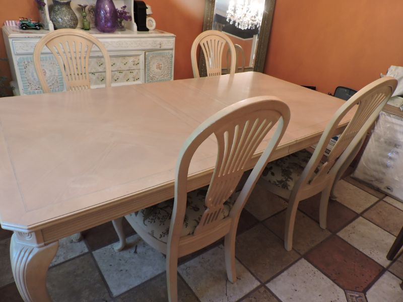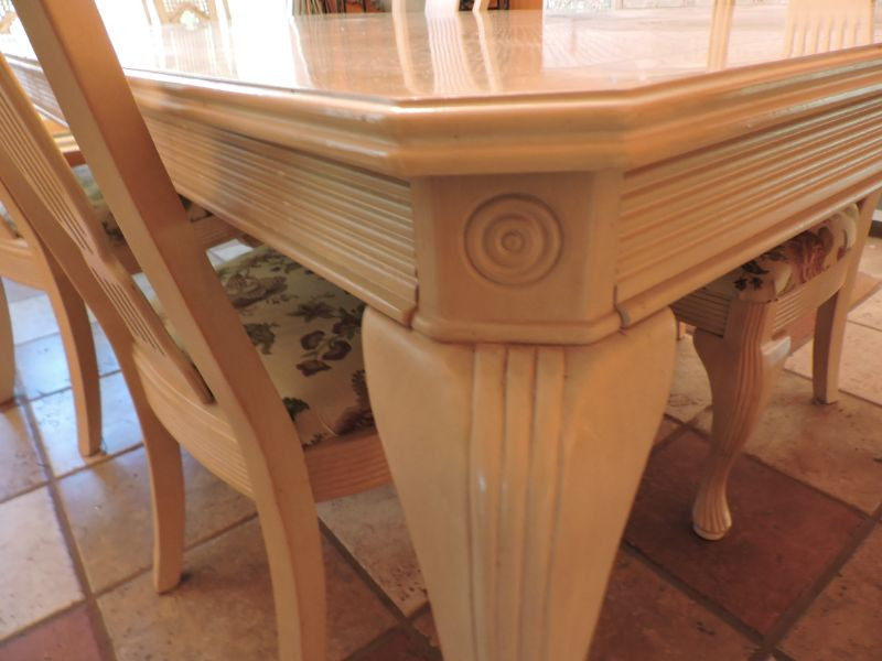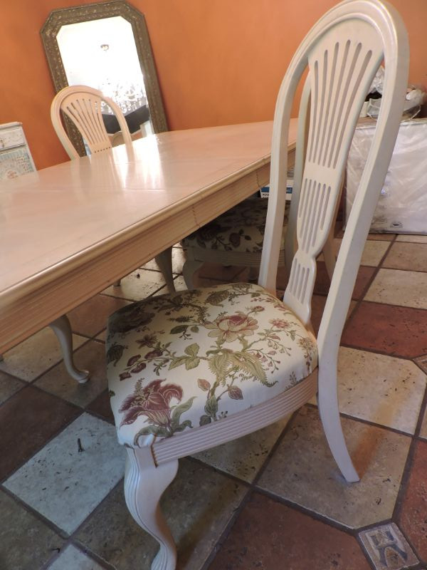 French Provincial dining table with four chairs and 2 leaves. Table without leaves is 68x44x29.5, each leaf is 14” for a total length of 96” (8 foot). The set is in good condition with Jacobean floral print fabric on the chair seats.