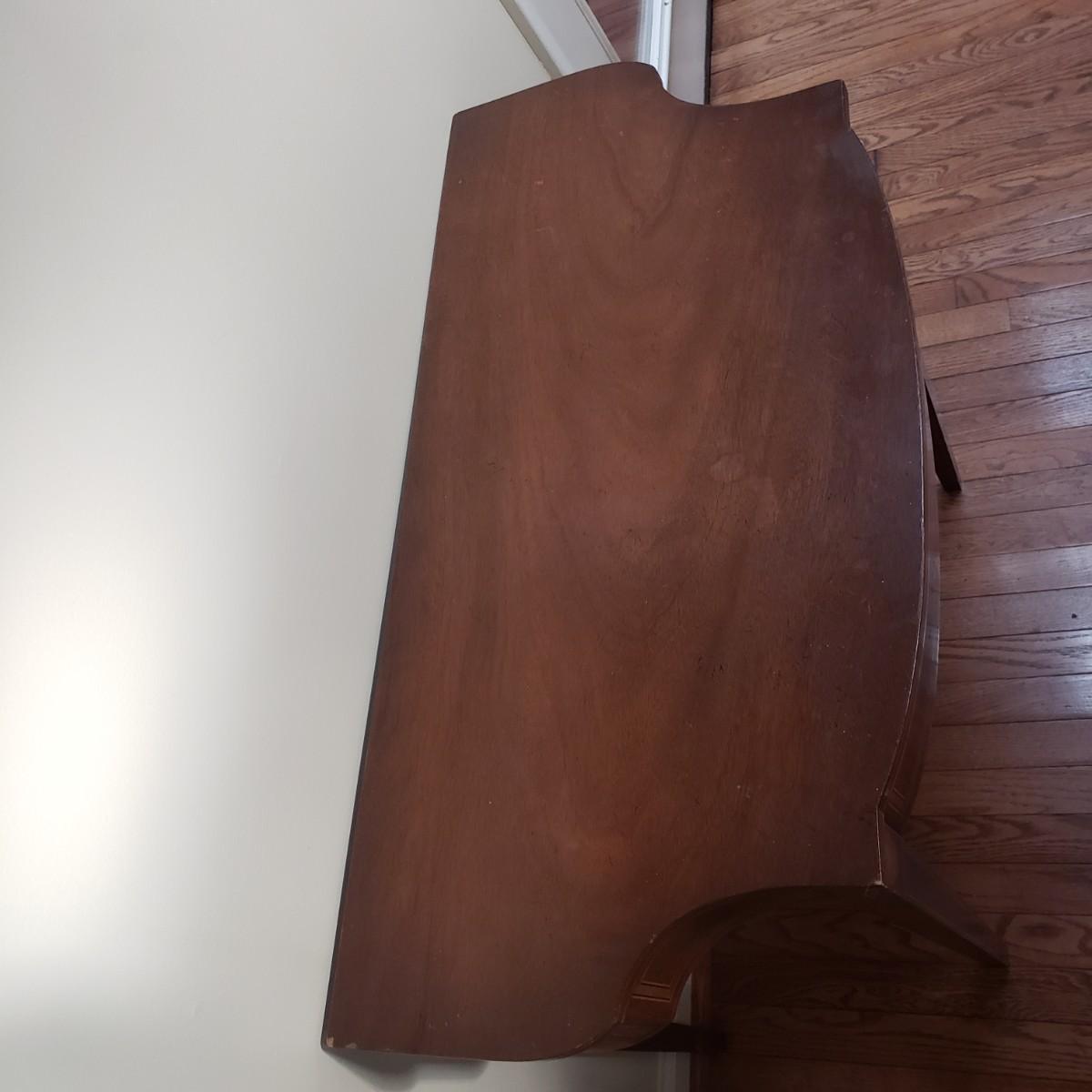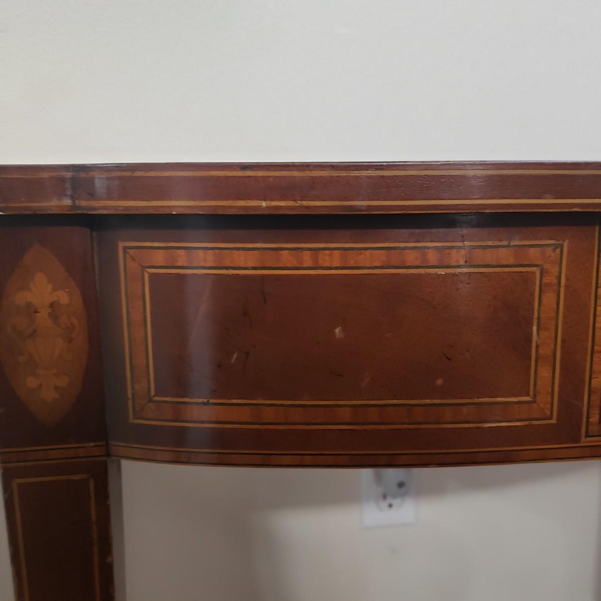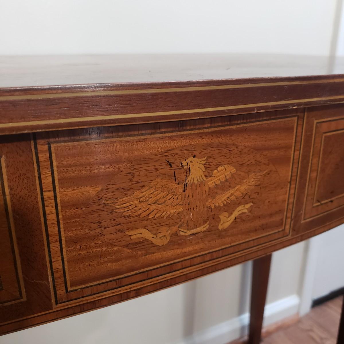 This inlay table measures 36" x 18" x 29"H. The inlay is beautifully designed with an Eagle in the center. This piece has some blemishes, see pictures. Overall, it appears to be a solid piece of furniture.