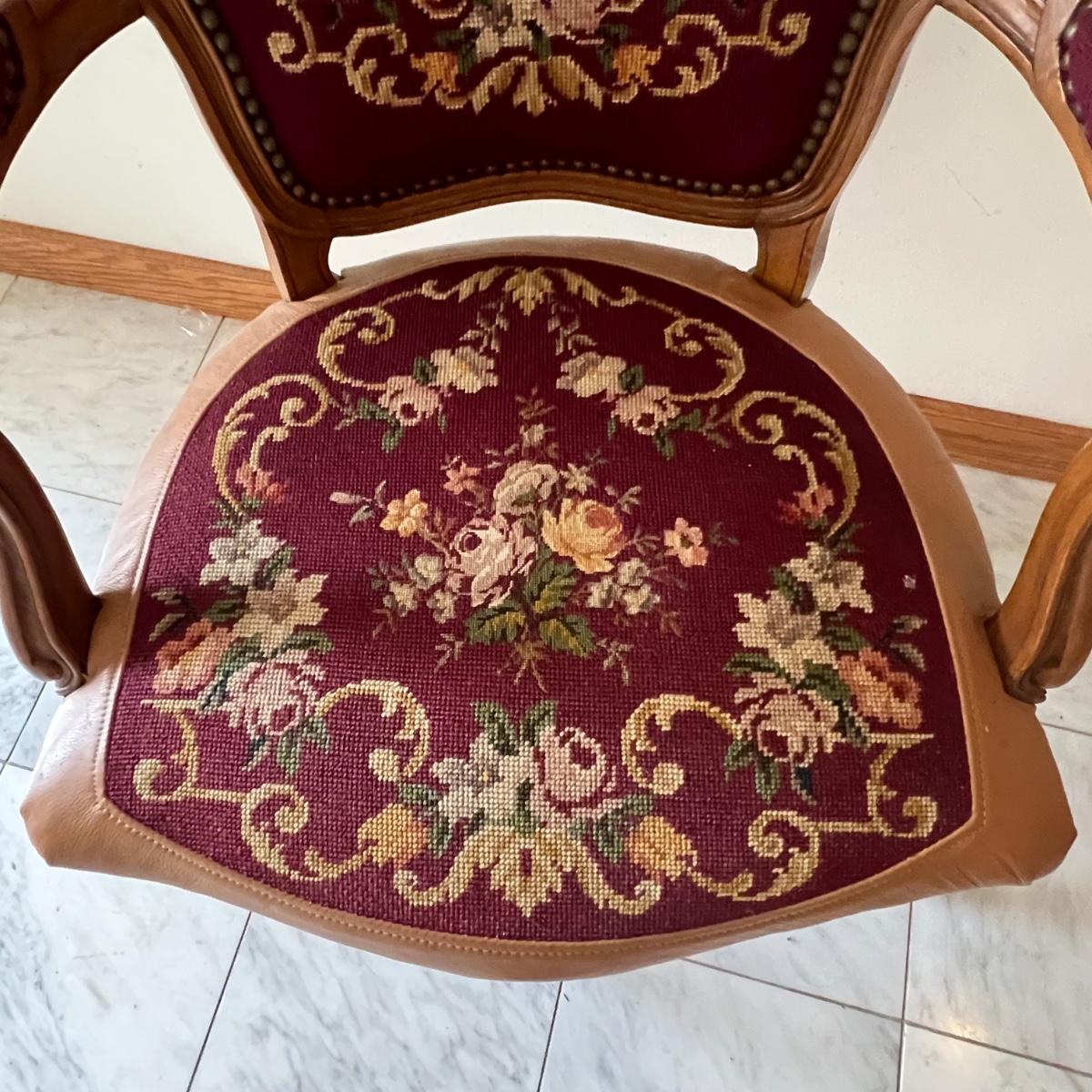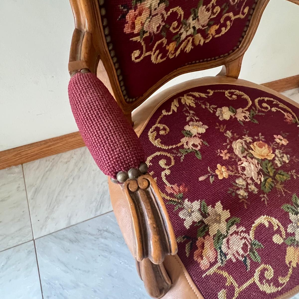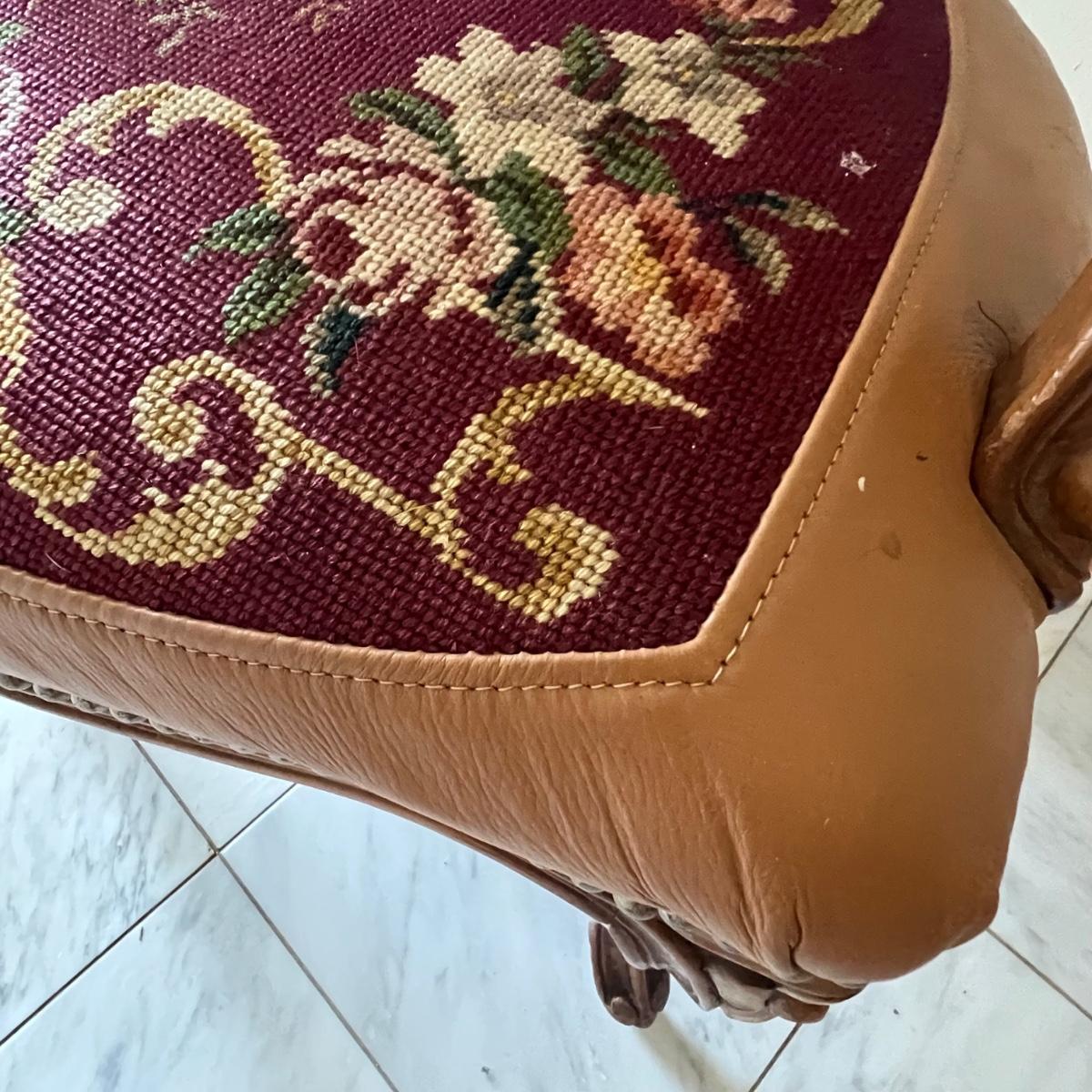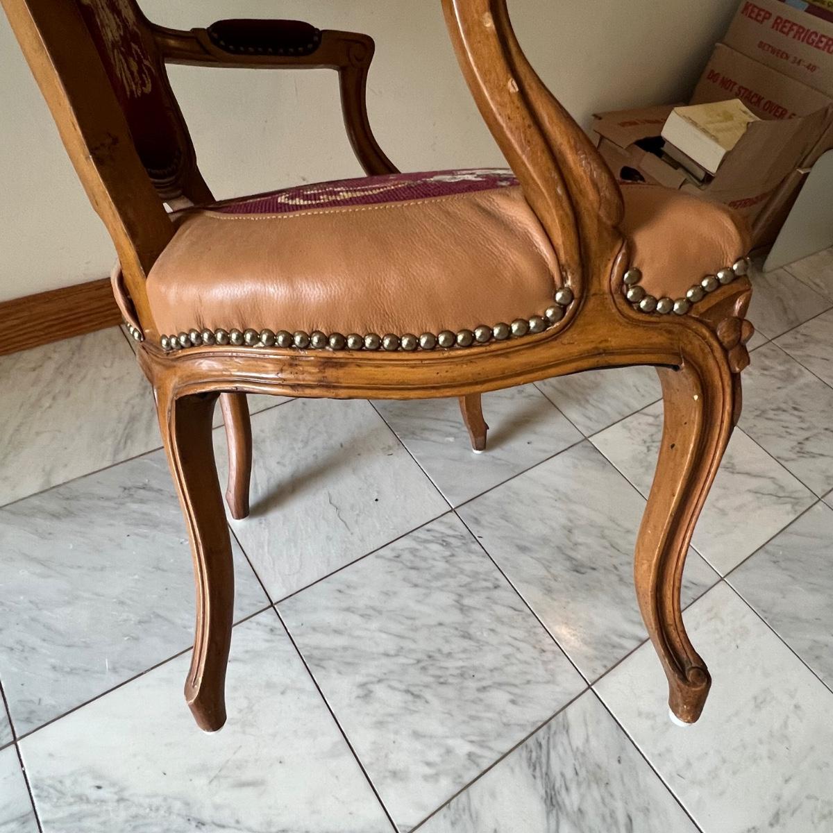 This beautiful wood framed armchair has carved flower embellishments. It appears to have been refurbished as it has immaculate tan leather. The cross stitch is also in great condition, possibly original to the chair but we cannot confirm that.