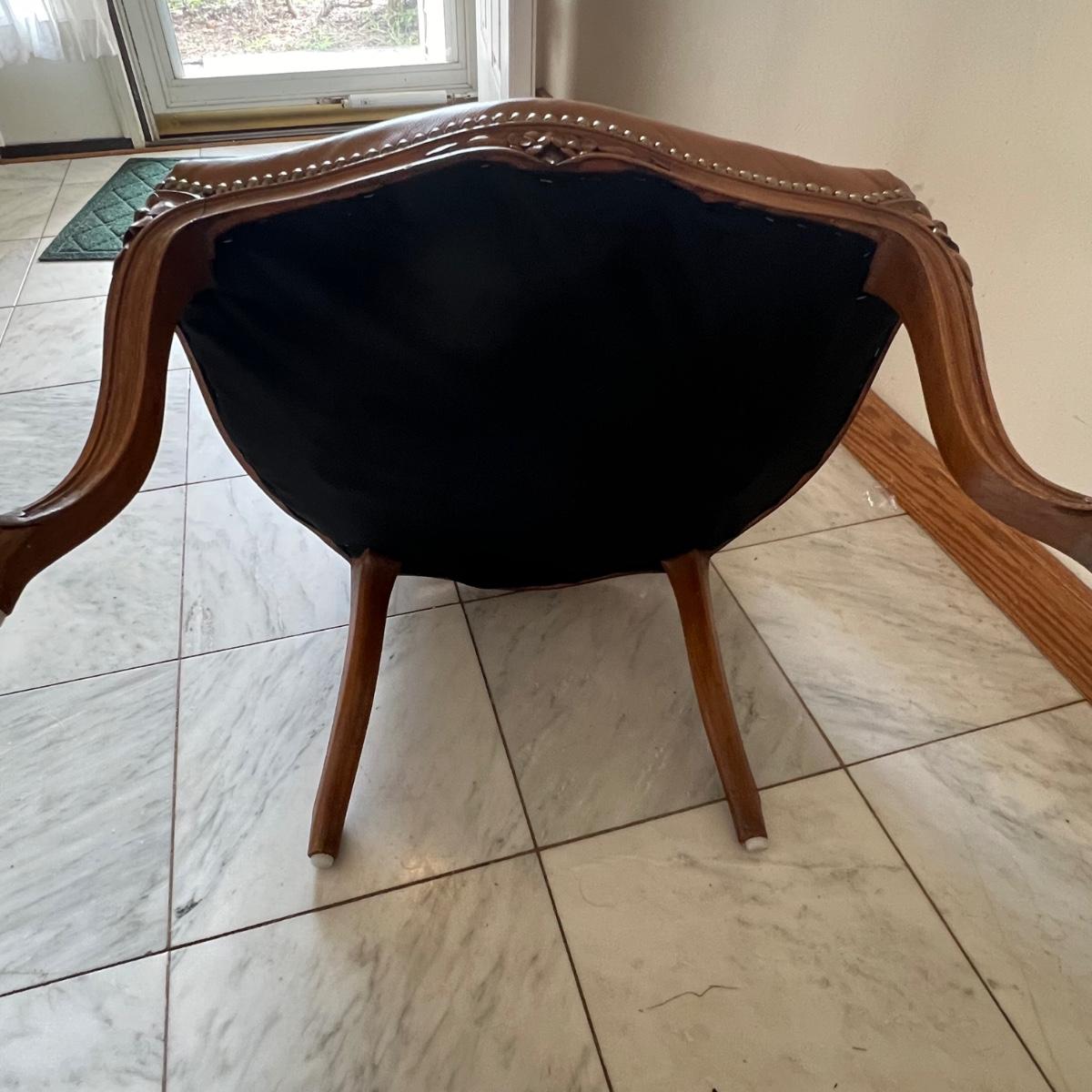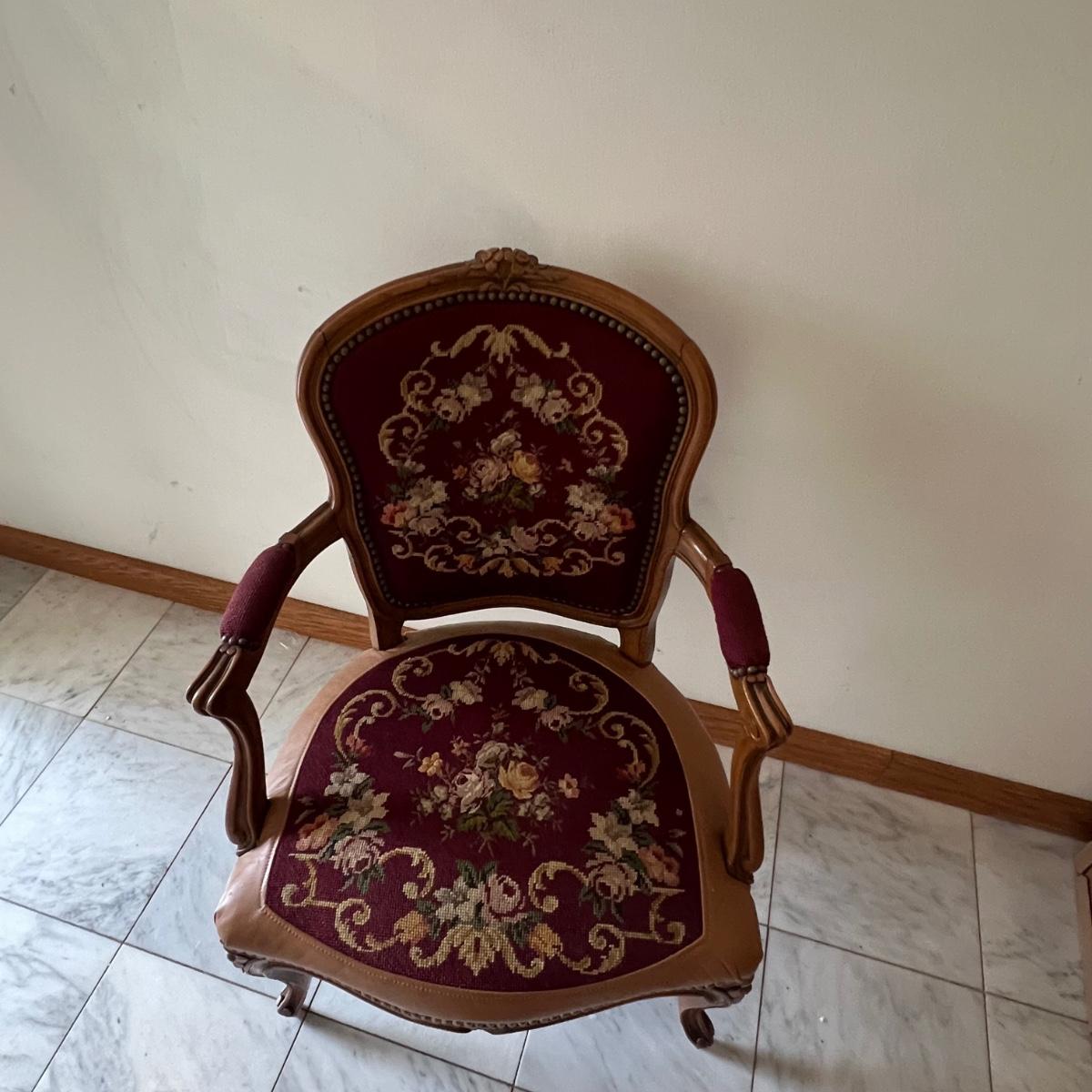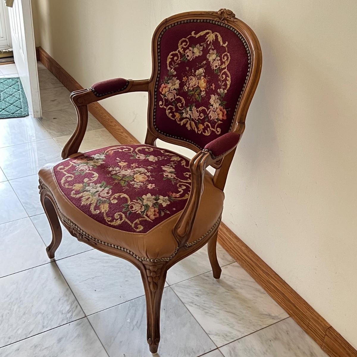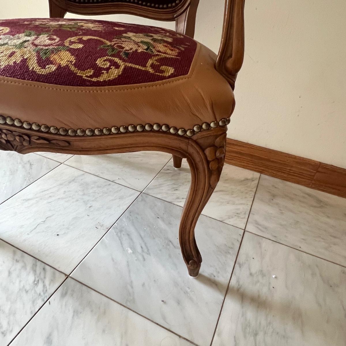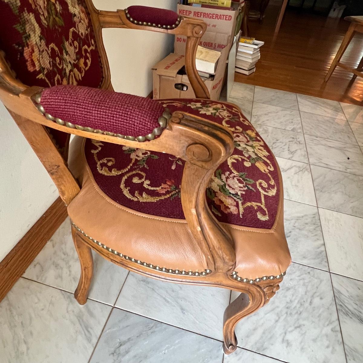 This beautiful wood framed armchair has carved flower embellishments. It appears to have been refurbished as it has immaculate tan leather. The cross stitch is also in great condition, possibly original to the chair but we cannot confirm that.