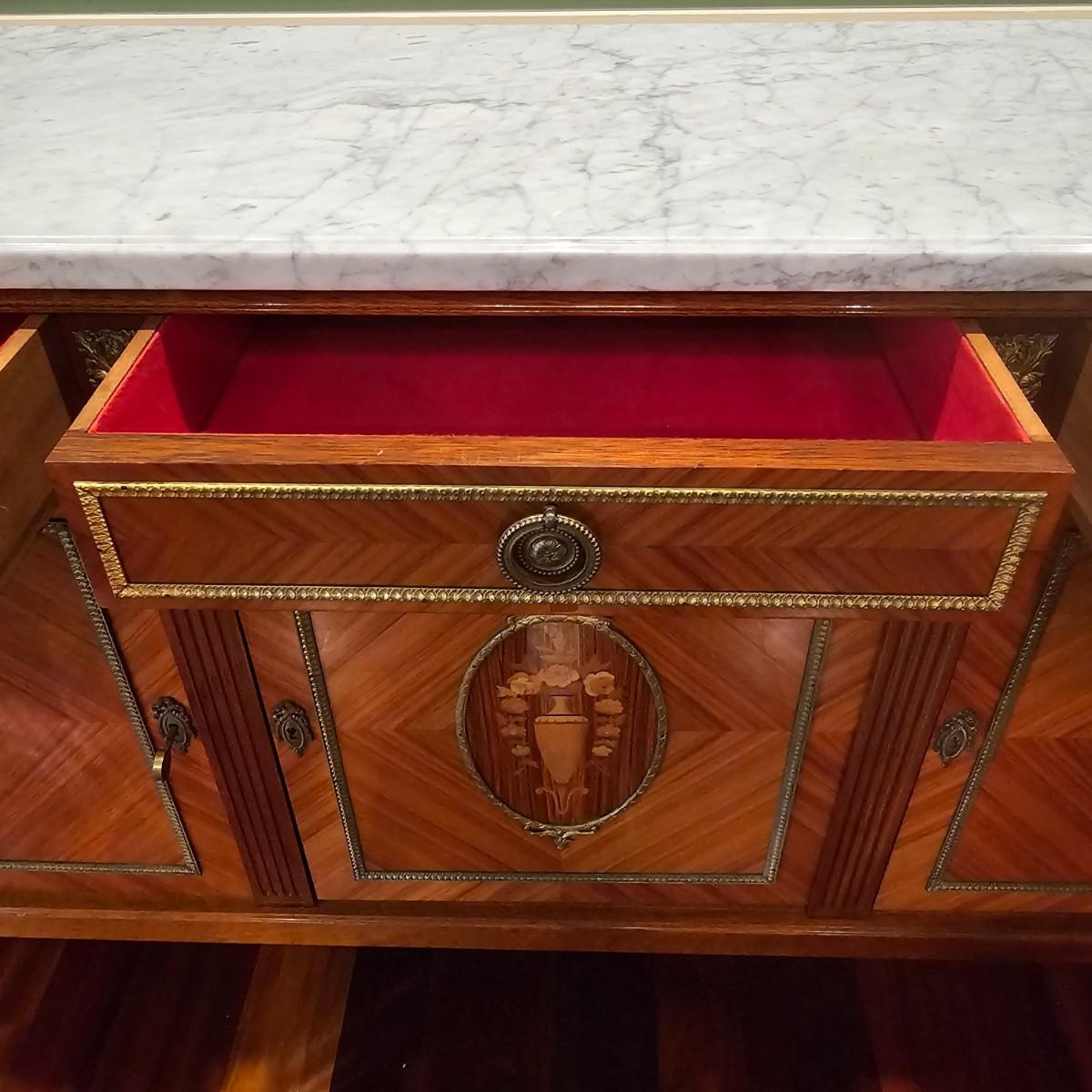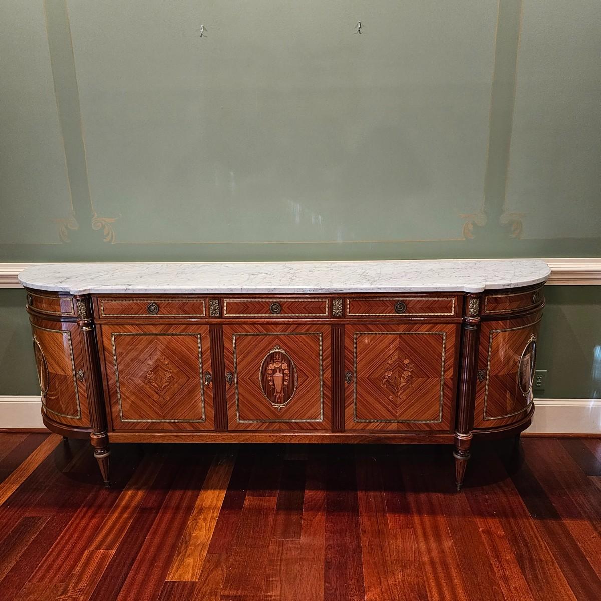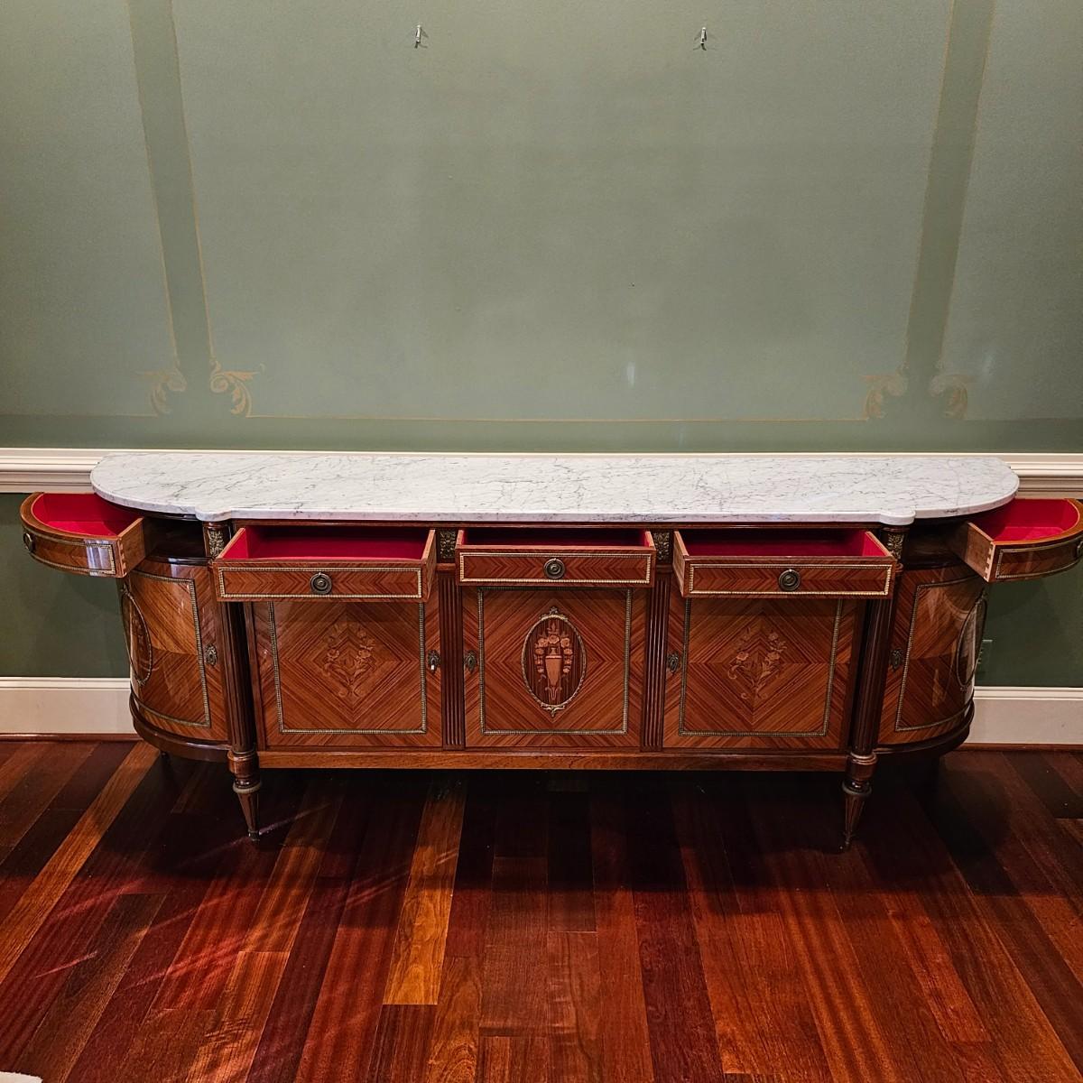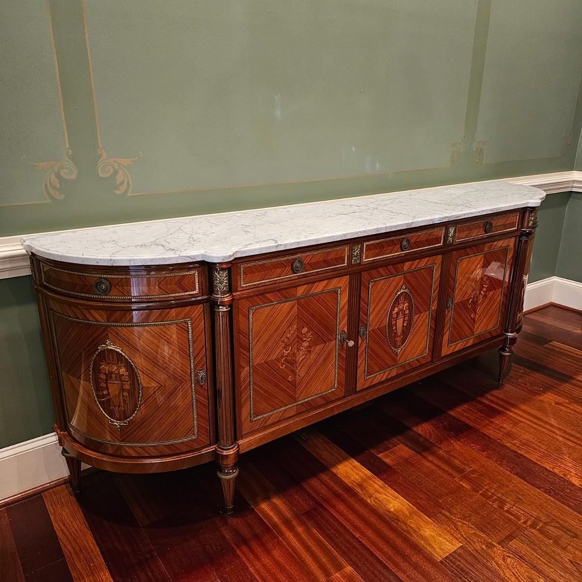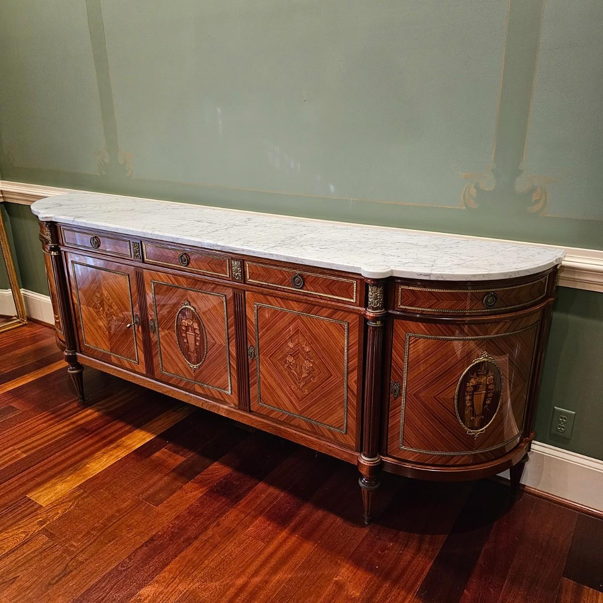 Stunning marble top buffet with inlay doors and decorative accents. Three full doors/cabinets across the front and both ends have rounded corners, doors and drawers. Bottom cabinets share a common locking key. Drawers all have dovetail conctruction and felt lining. Tag inside door indicates made in France. Marble top has front routed edges, is over 1" thick and shaped to the buffet contours and is removable. Buffet measures 105.5" x 21.5" x 40" H, has tensioning rods underneath for added strength. See photos for details. Local pickup only. Winning bidder must bring assistance to help move and load this item due to its weight and/or size. This item is massive and will require three or four people to move it. Item is located on first floor.