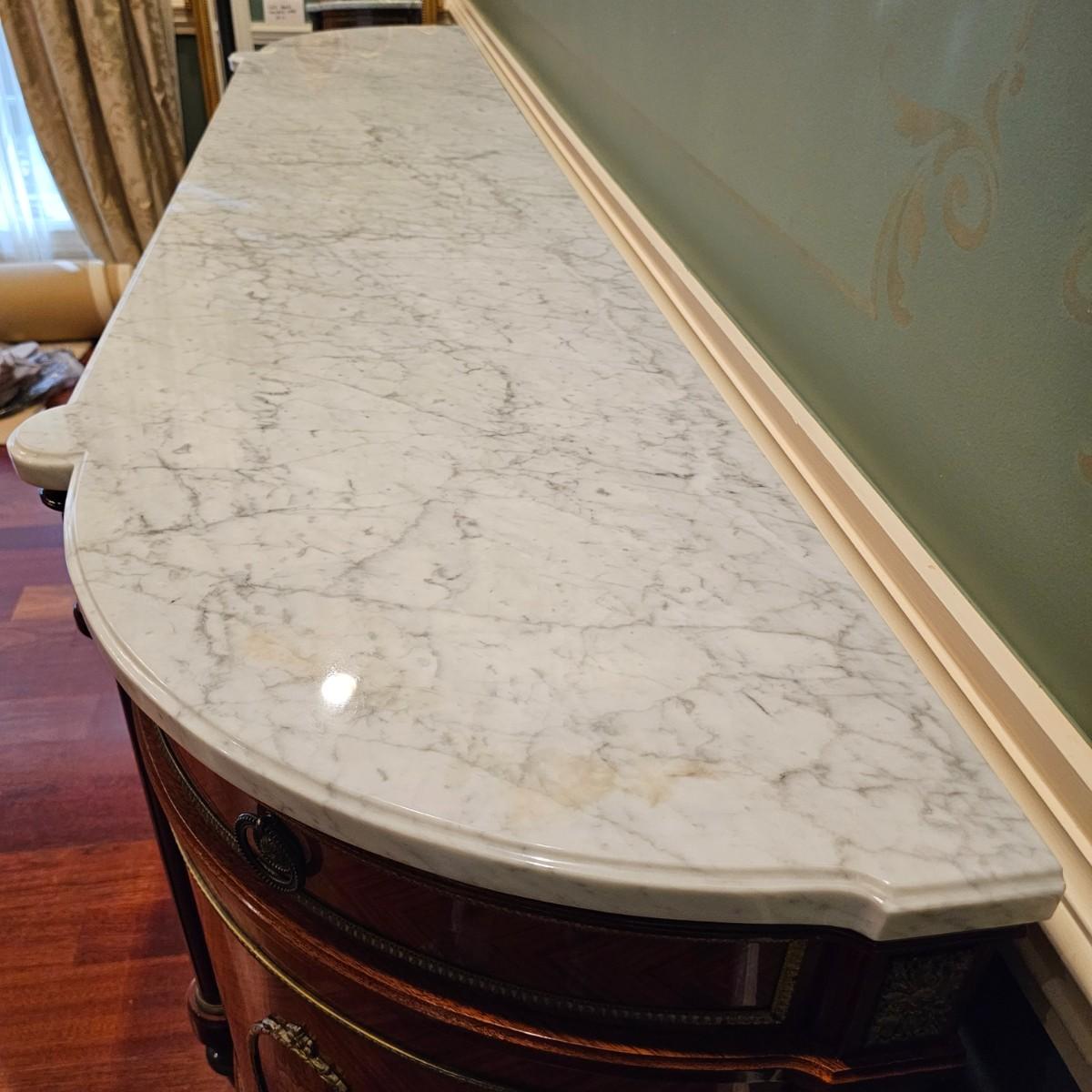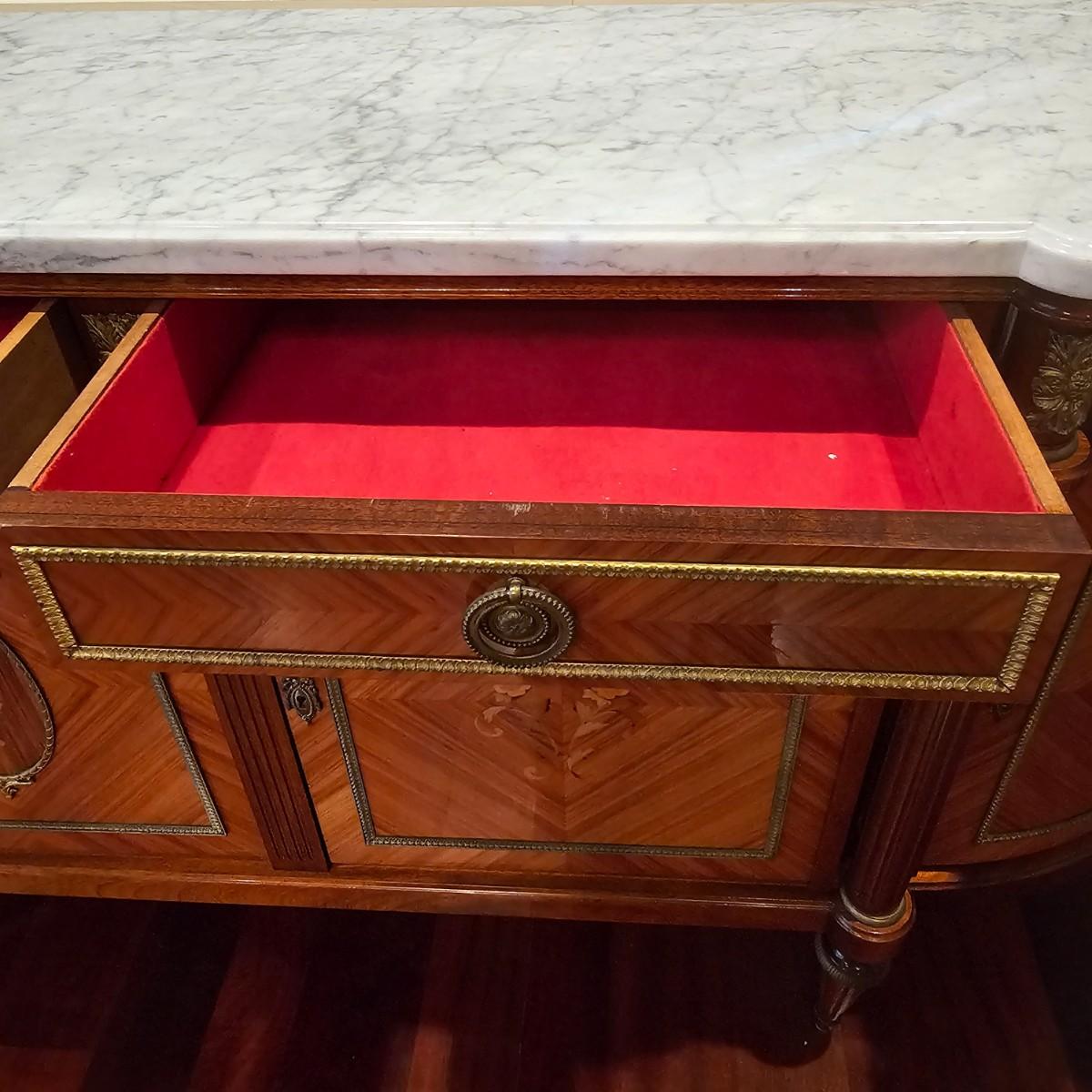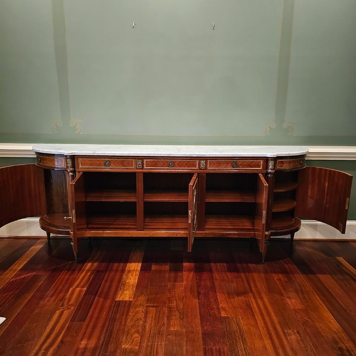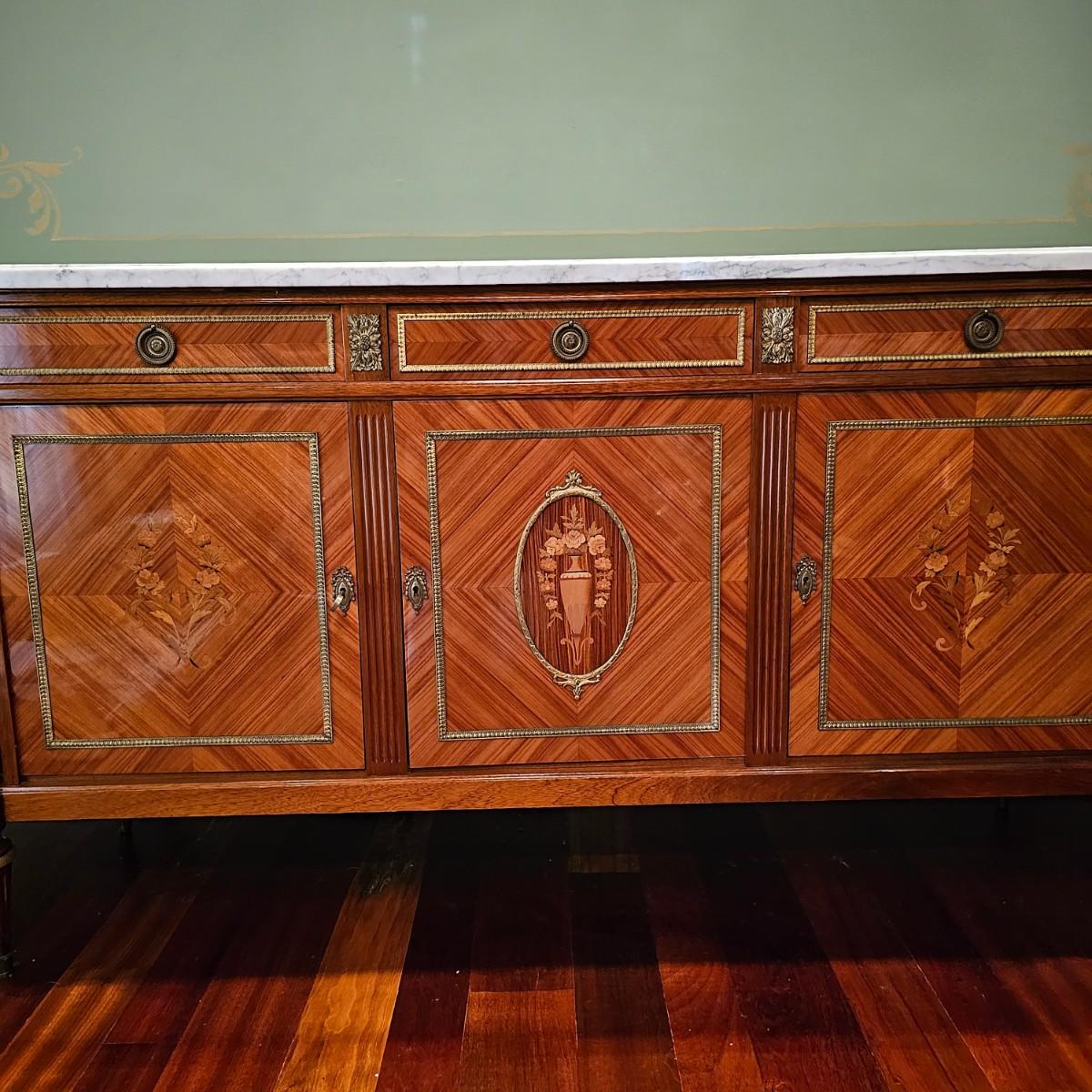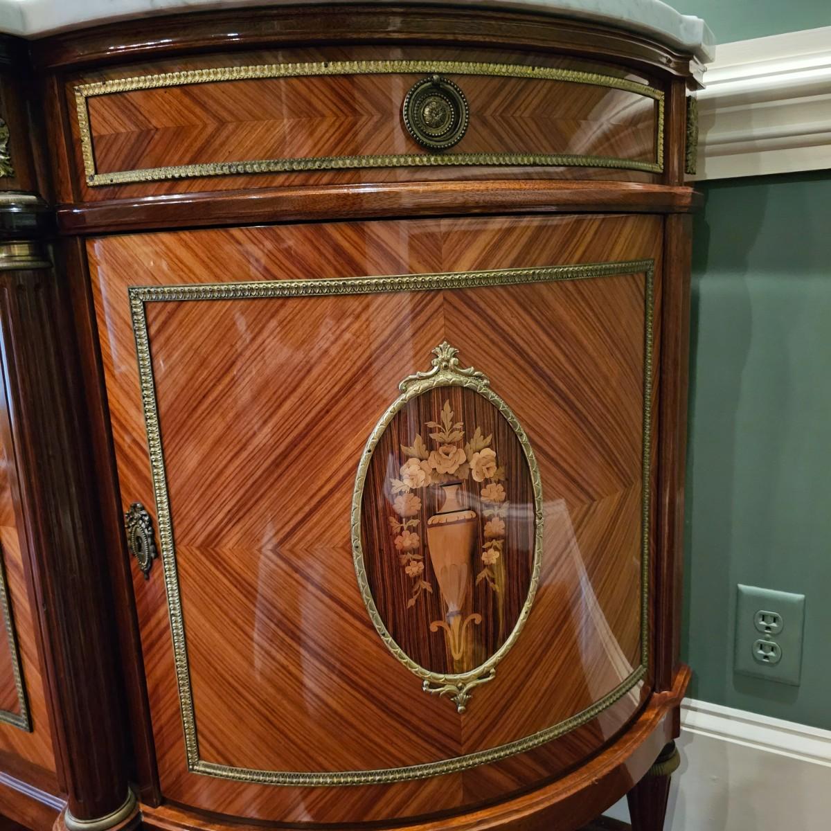 Stunning marble top buffet with inlay doors and decorative accents. Three full doors/cabinets across the front and both ends have rounded corners, doors and drawers. Bottom cabinets share a common locking key. Drawers all have dovetail conctruction and felt lining. Tag inside door indicates made in France. Marble top has front routed edges, is over 1" thick and shaped to the buffet contours and is removable. Buffet measures 105.5" x 21.5" x 40" H, has tensioning rods underneath for added strength. See photos for details. Local pickup only. Winning bidder must bring assistance to help move and load this item due to its weight and/or size. This item is massive and will require three or four people to move it. Item is located on first floor.