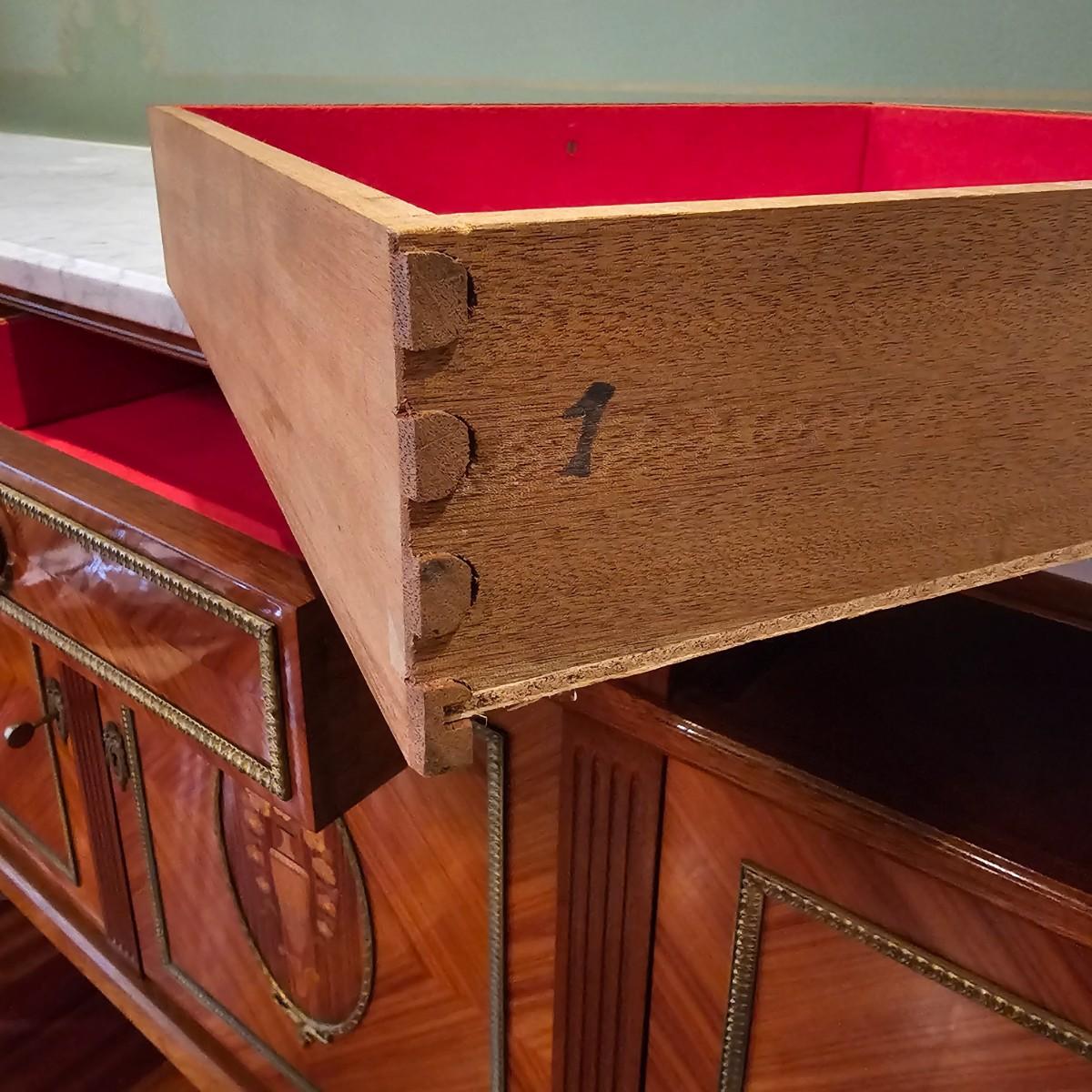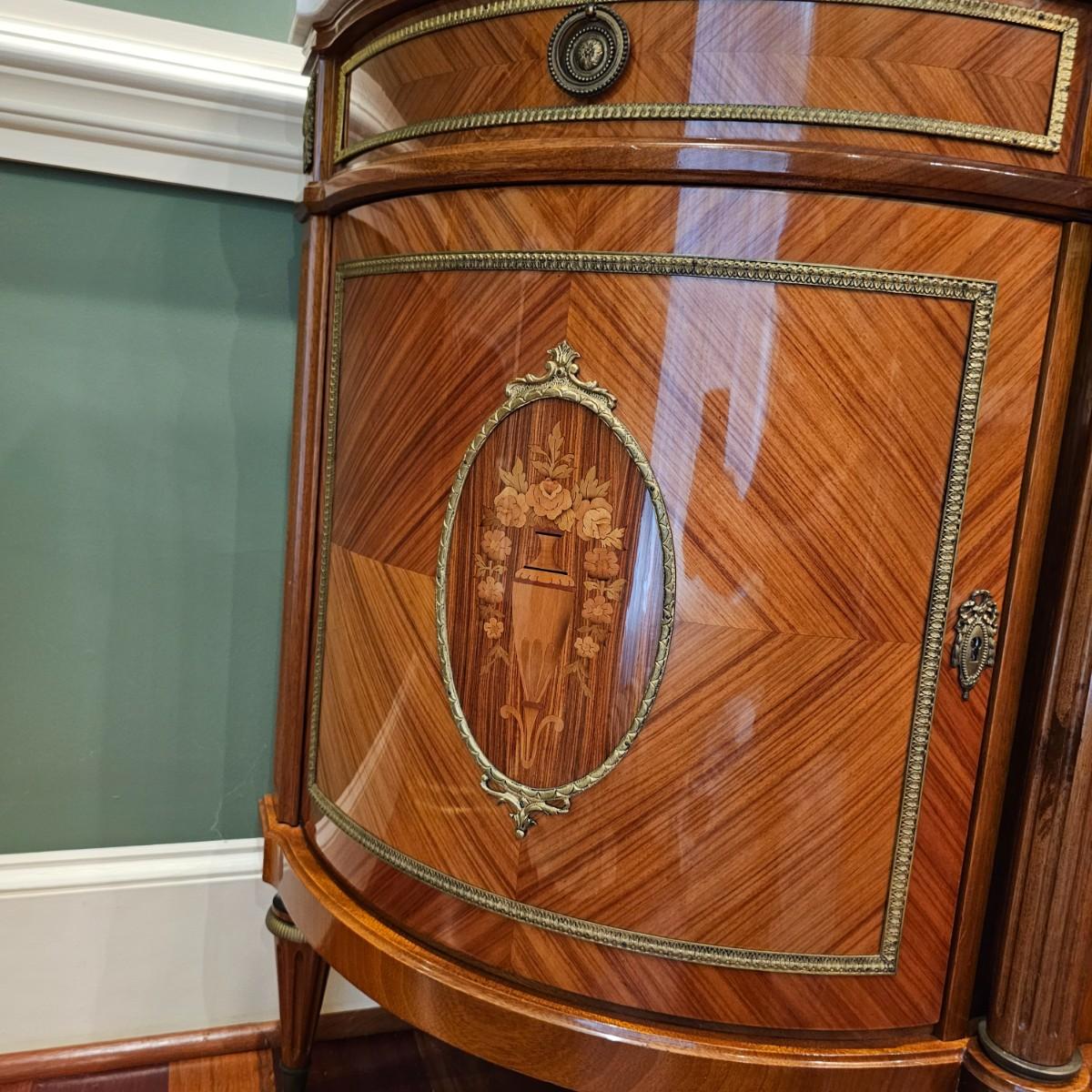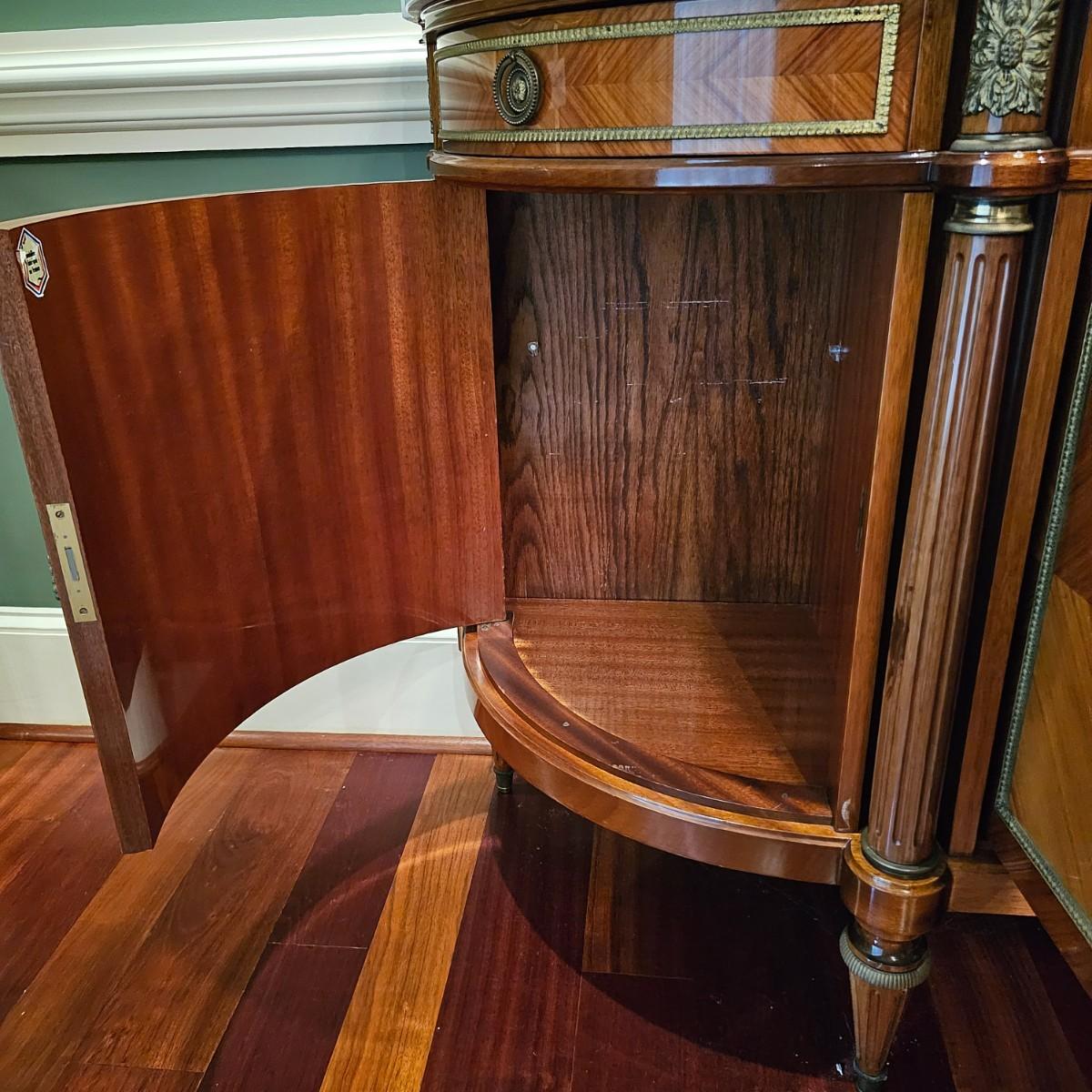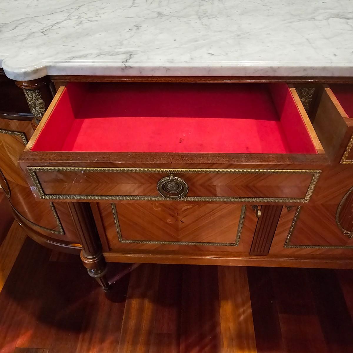 Stunning marble top buffet with inlay doors and decorative accents. Three full doors/cabinets across the front and both ends have rounded corners, doors and drawers. Bottom cabinets share a common locking key. Drawers all have dovetail conctruction and felt lining. Tag inside door indicates made in France. Marble top has front routed edges, is over 1" thick and shaped to the buffet contours and is removable. Buffet measures 105.5" x 21.5" x 40" H, has tensioning rods underneath for added strength. See photos for details. Local pickup only. Winning bidder must bring assistance to help move and load this item due to its weight and/or size. This item is massive and will require three or four people to move it. Item is located on first floor.