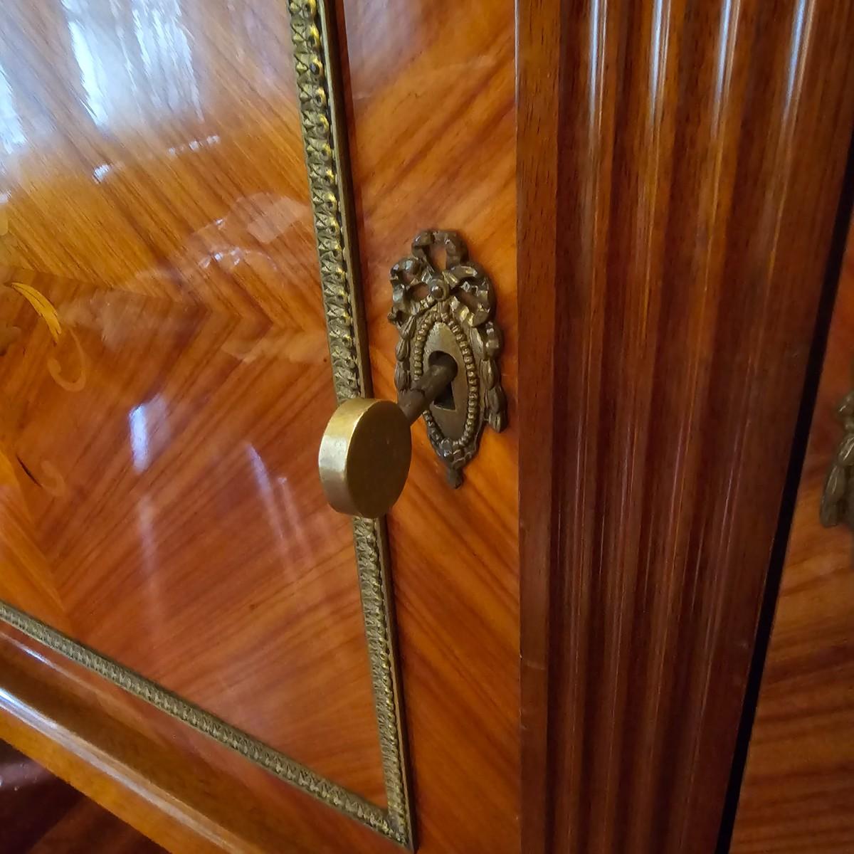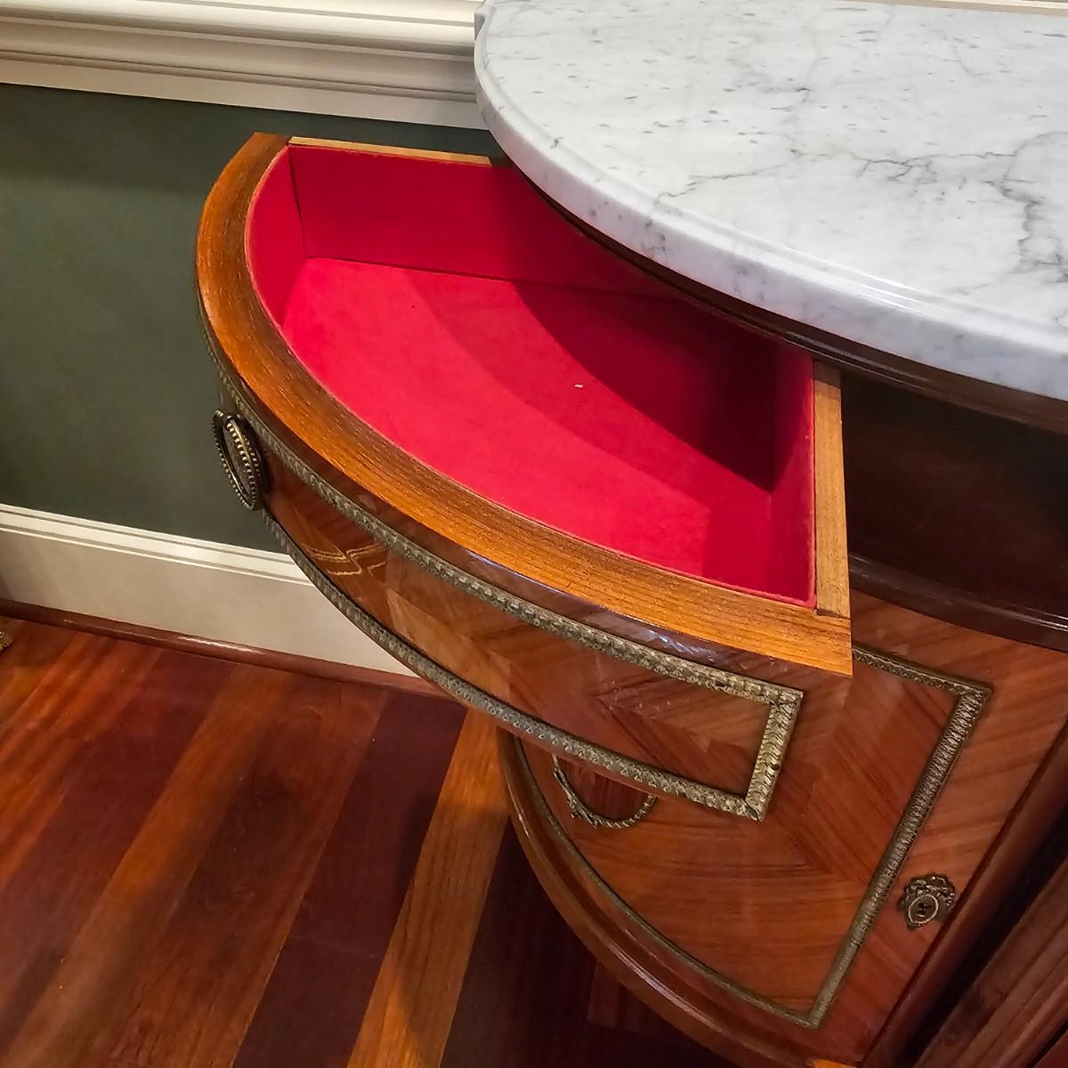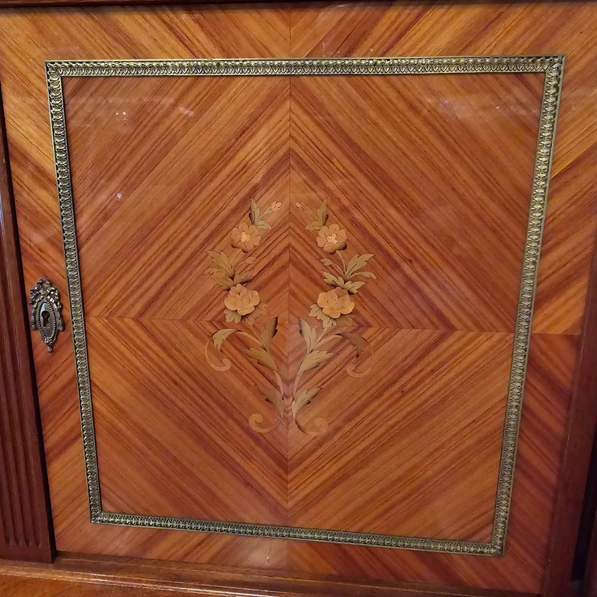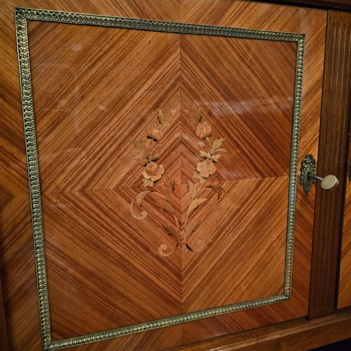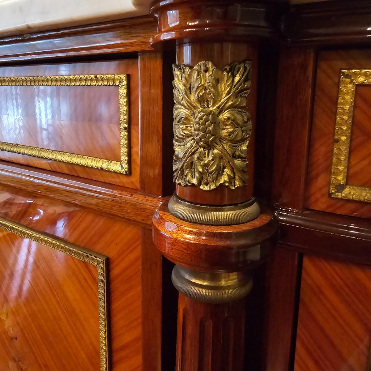 Stunning marble top buffet with inlay doors and decorative accents. Three full doors/cabinets across the front and both ends have rounded corners, doors and drawers. Bottom cabinets share a common locking key. Drawers all have dovetail conctruction and felt lining. Tag inside door indicates made in France. Marble top has front routed edges, is over 1" thick and shaped to the buffet contours and is removable. Buffet measures 105.5" x 21.5" x 40" H, has tensioning rods underneath for added strength. See photos for details. Local pickup only. Winning bidder must bring assistance to help move and load this item due to its weight and/or size. This item is massive and will require three or four people to move it. Item is located on first floor.