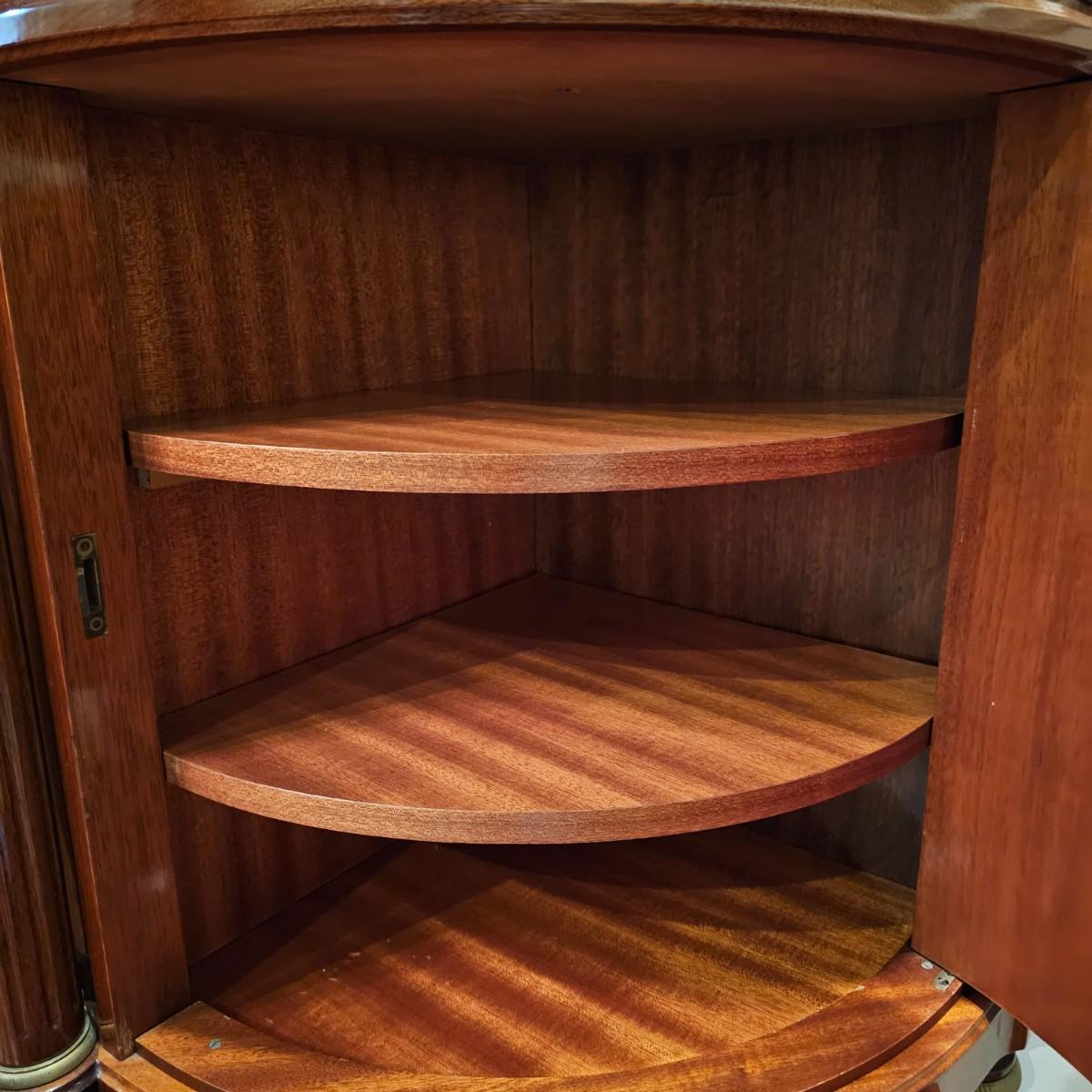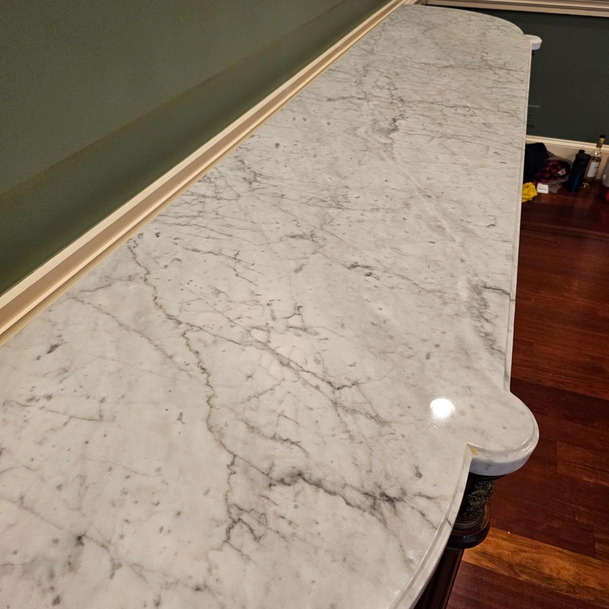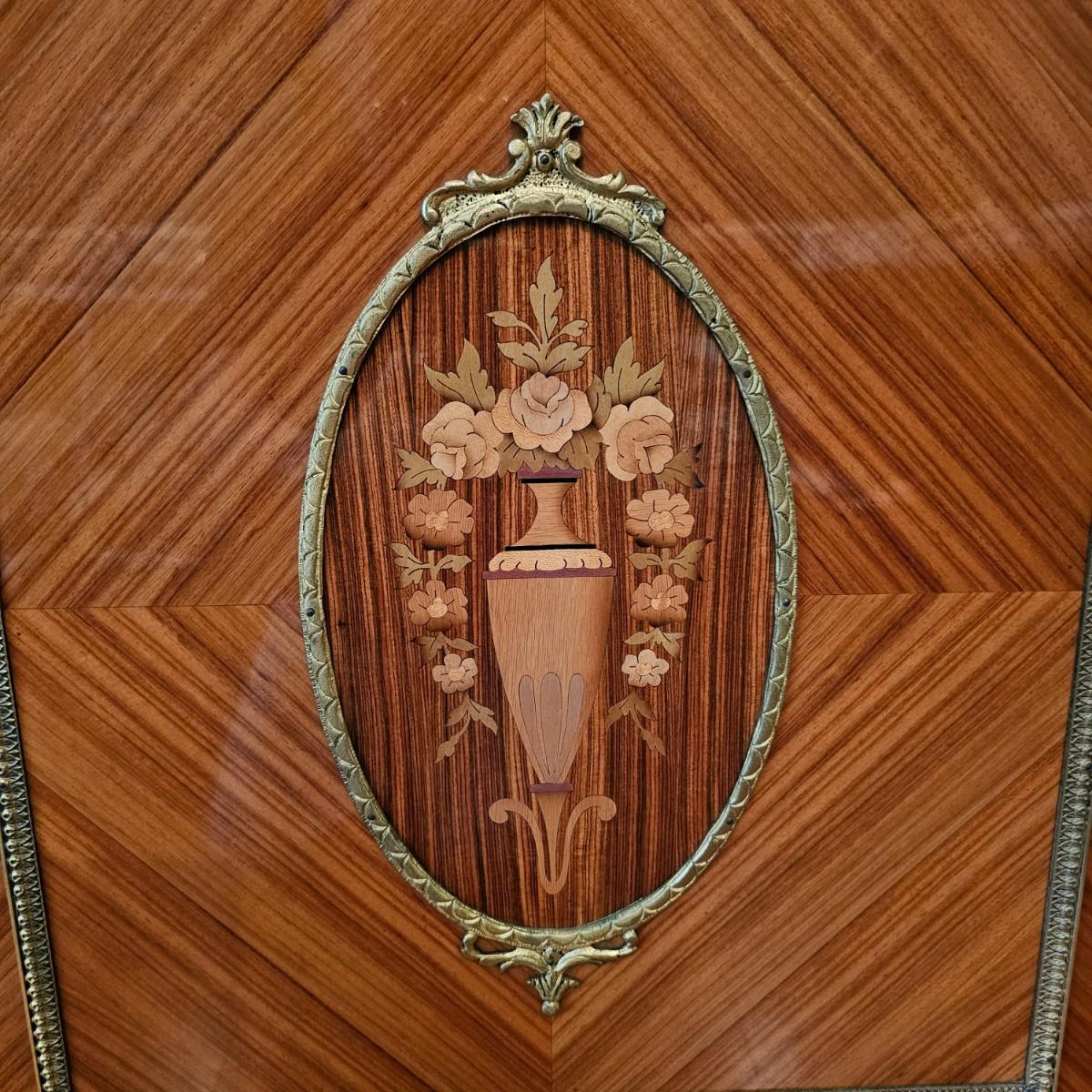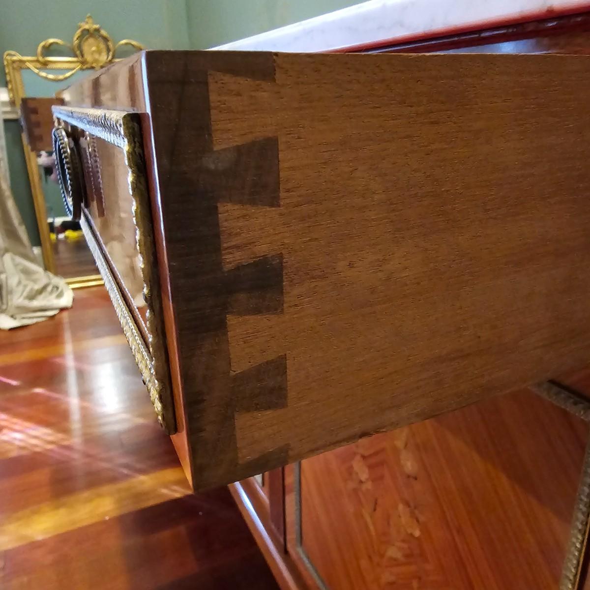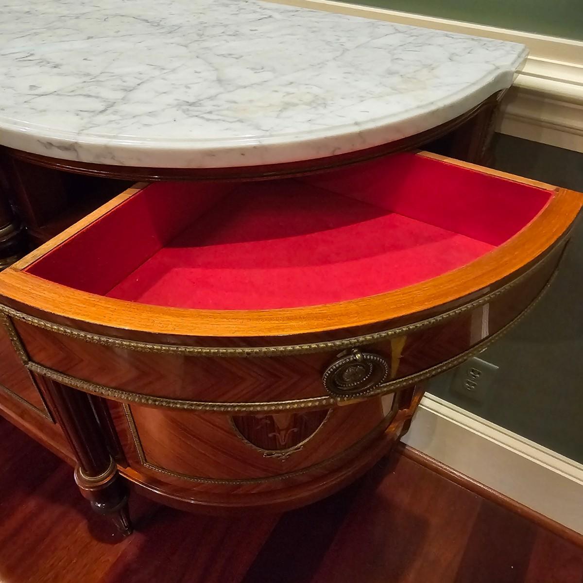 Stunning marble top buffet with inlay doors and decorative accents. Three full doors/cabinets across the front and both ends have rounded corners, doors and drawers. Bottom cabinets share a common locking key. Drawers all have dovetail conctruction and felt lining. Tag inside door indicates made in France. Marble top has front routed edges, is over 1" thick and shaped to the buffet contours and is removable. Buffet measures 105.5" x 21.5" x 40" H, has tensioning rods underneath for added strength. See photos for details. Local pickup only. Winning bidder must bring assistance to help move and load this item due to its weight and/or size. This item is massive and will require three or four people to move it. Item is located on first floor.