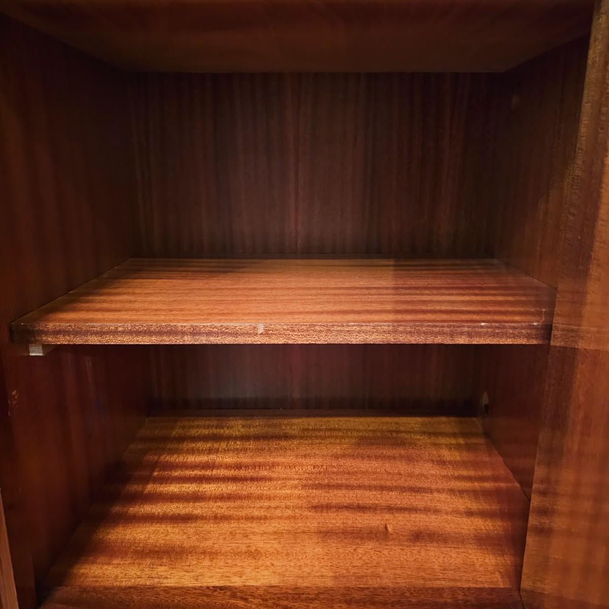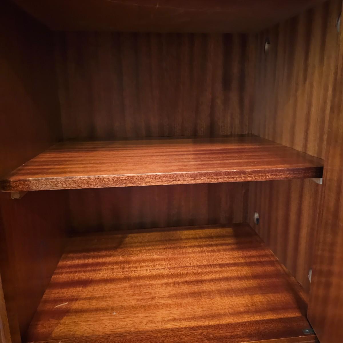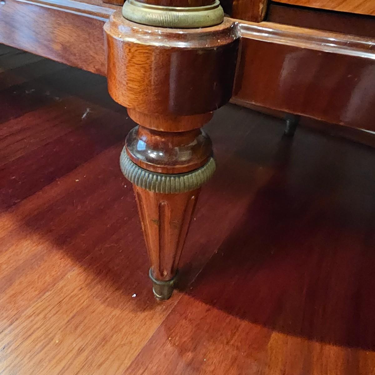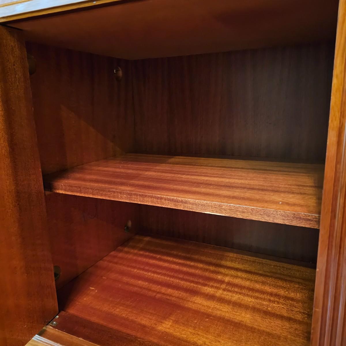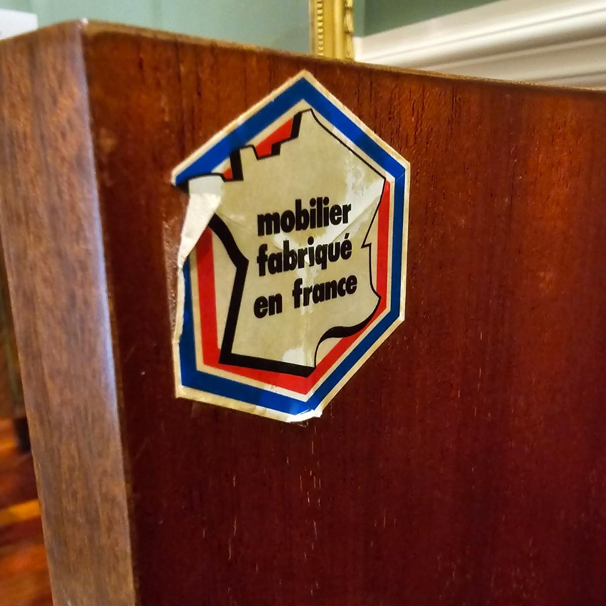 Stunning marble top buffet with inlay doors and decorative accents. Three full doors/cabinets across the front and both ends have rounded corners, doors and drawers. Bottom cabinets share a common locking key. Drawers all have dovetail conctruction and felt lining. Tag inside door indicates made in France. Marble top has front routed edges, is over 1" thick and shaped to the buffet contours and is removable. Buffet measures 105.5" x 21.5" x 40" H, has tensioning rods underneath for added strength. See photos for details. Local pickup only. Winning bidder must bring assistance to help move and load this item due to its weight and/or size. This item is massive and will require three or four people to move it. Item is located on first floor.