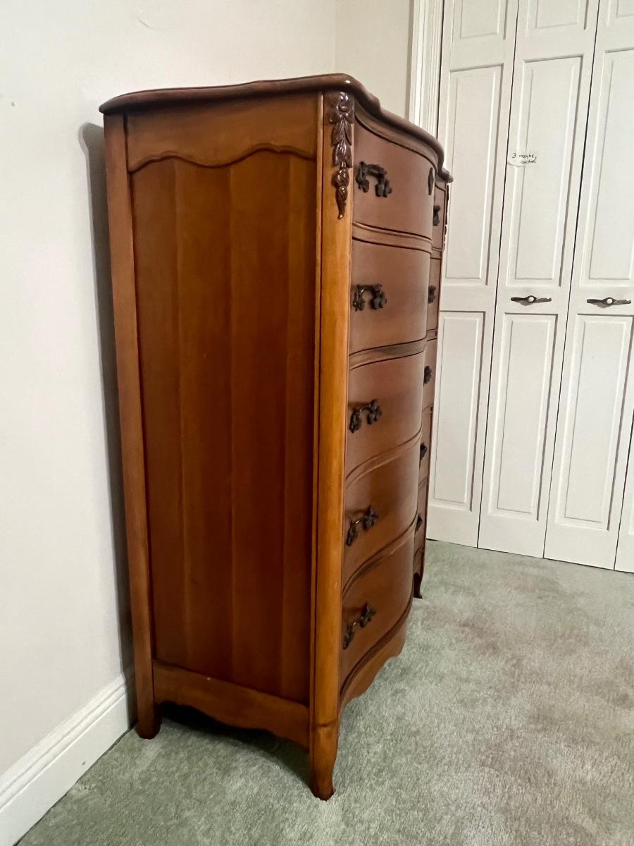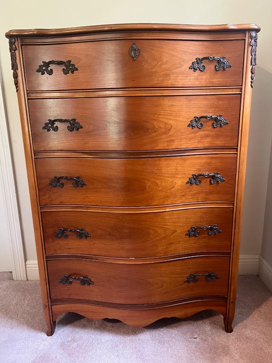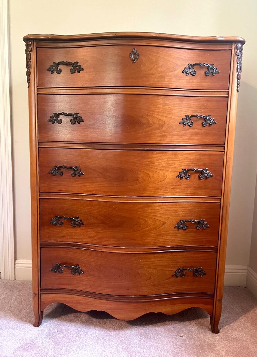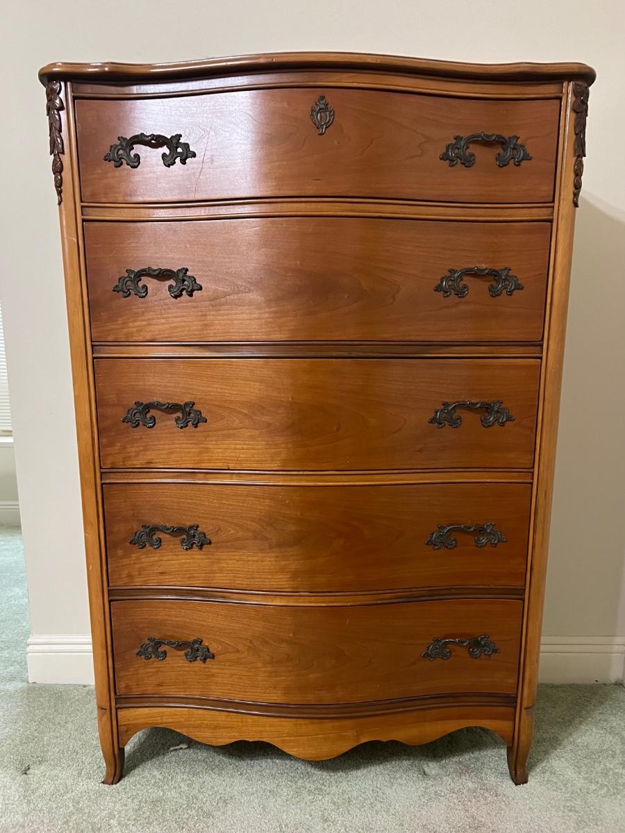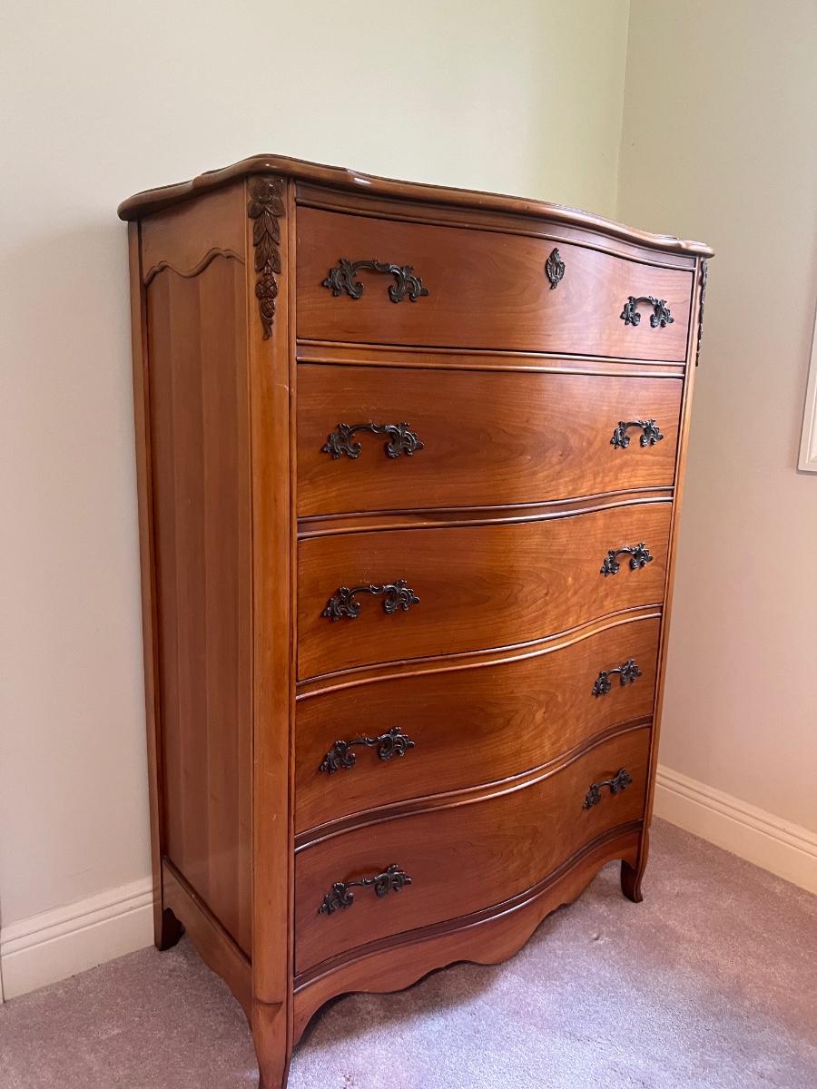French Provincial Curved Front Tall Boy Dresser with 5 drawers. All drawers open and close as they should. Measures 49 inches tall, 34 inches wide and 18 inches deep.