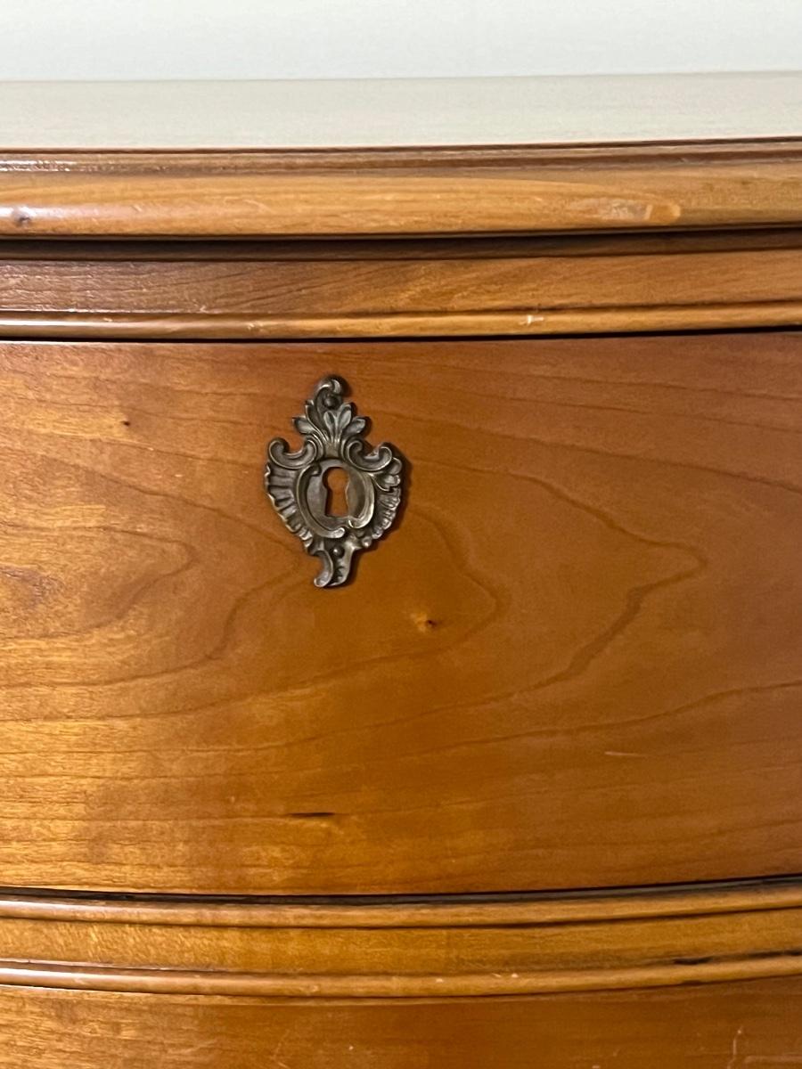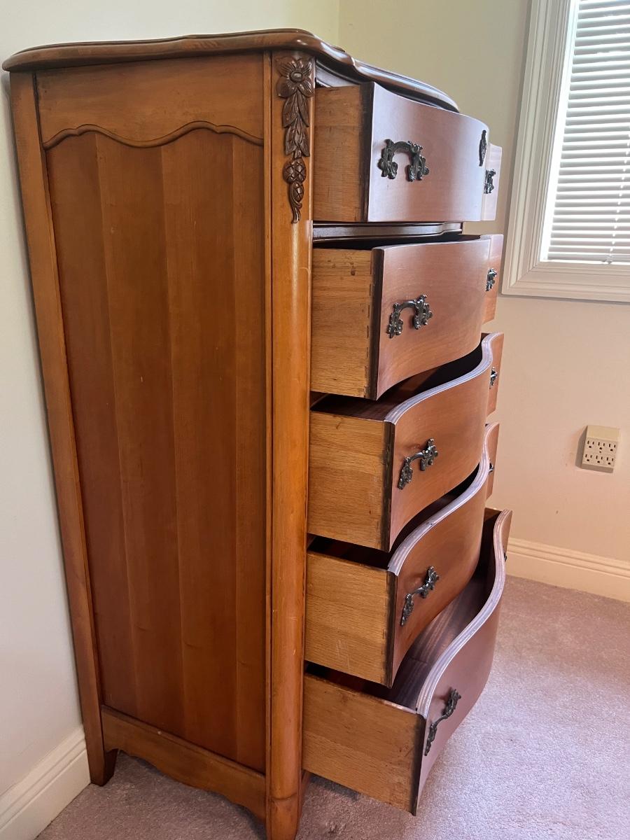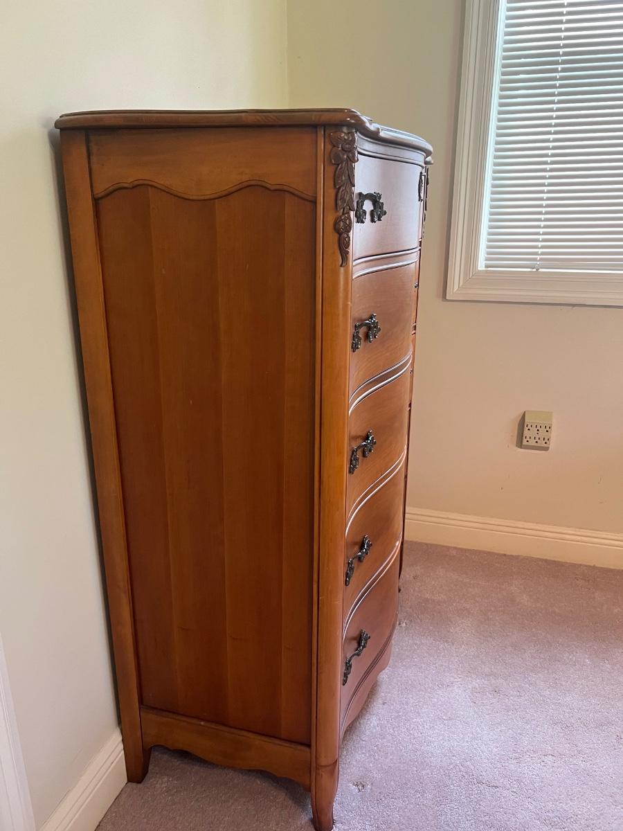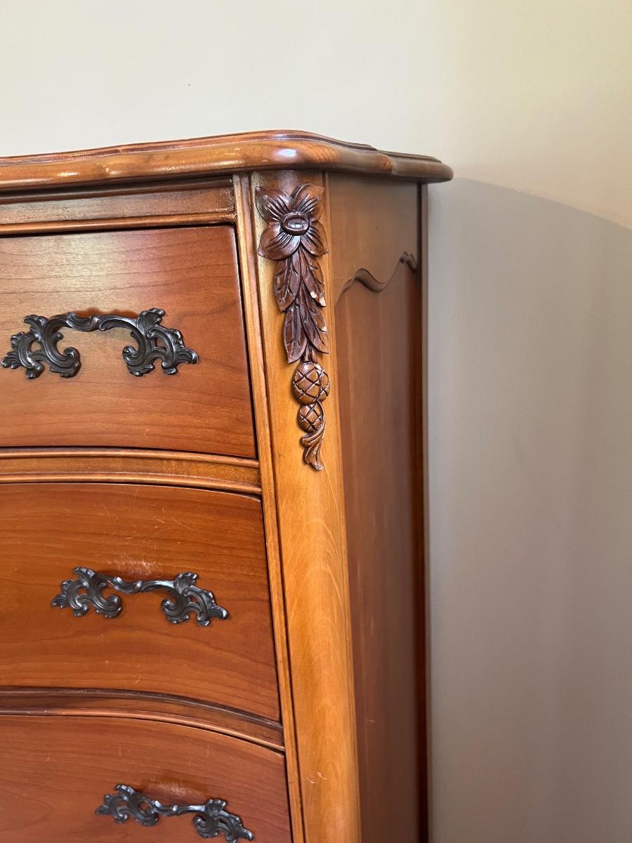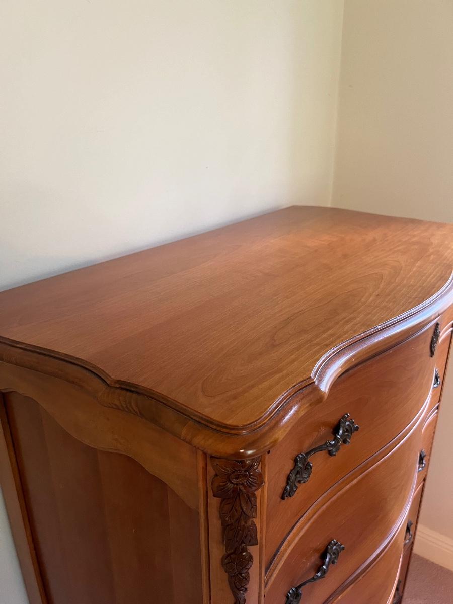French Provincial Curved Front Tall Boy Dresser with 5 drawers. All drawers open and close as they should. Measures 49 inches tall, 34 inches wide and 18 inches deep.