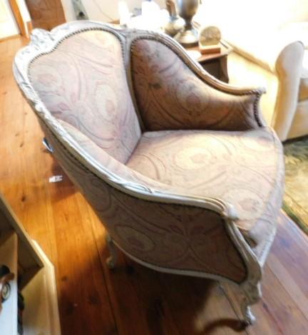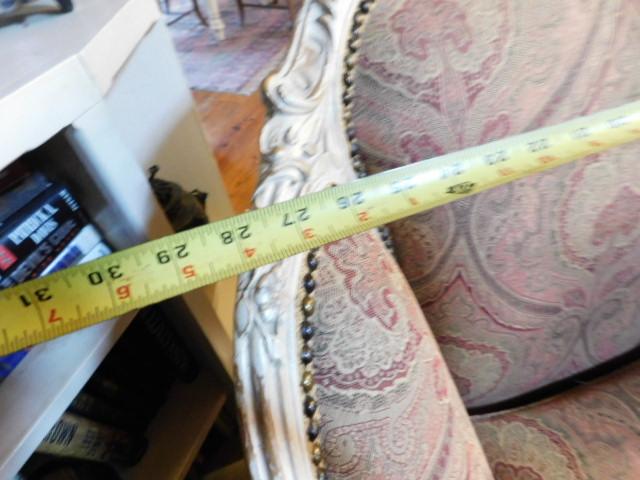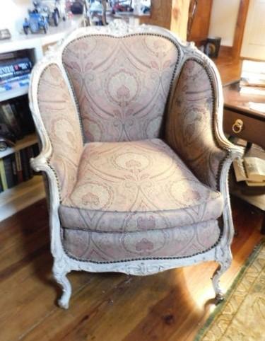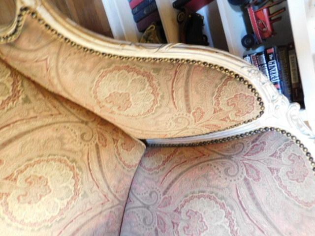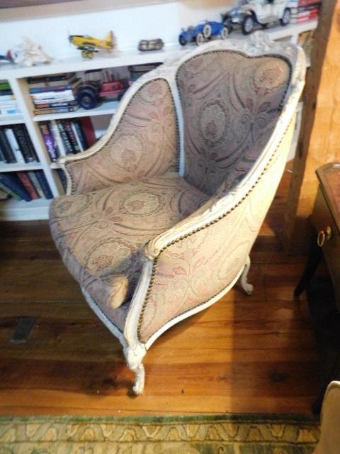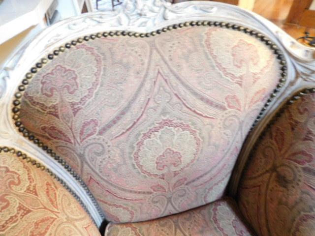 French Provincial Wood Framed Upholstered Chair will need to be cleaned. Has a few spot s as shown