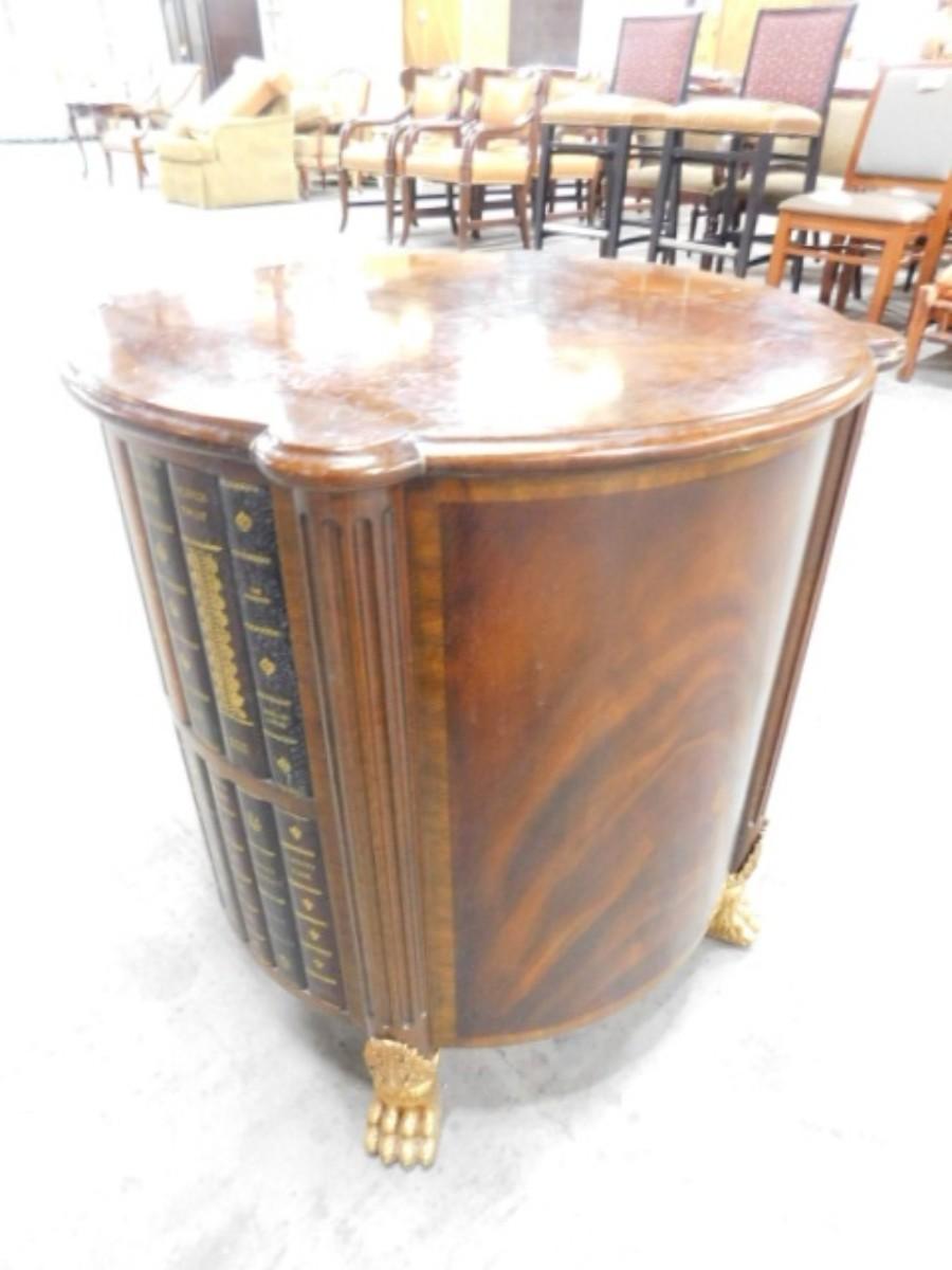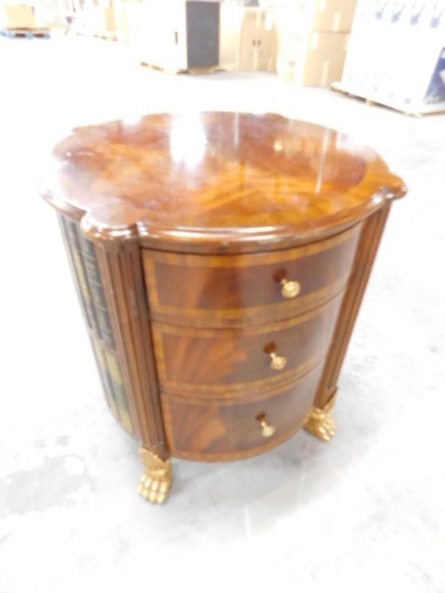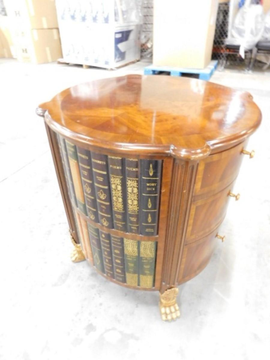 French Regency Mahogany Finish Three Drawer Drum Table Library Design Maitland-Smith Choice A. Expect some wear or scratches to the finish. Shipping option available via freight or local mover at Buyer's expense. Buyer must have all shipping scheduled within the stated dates and times of pickup. Recommended local mover is Beaty Bros. Moving 828-201-2982