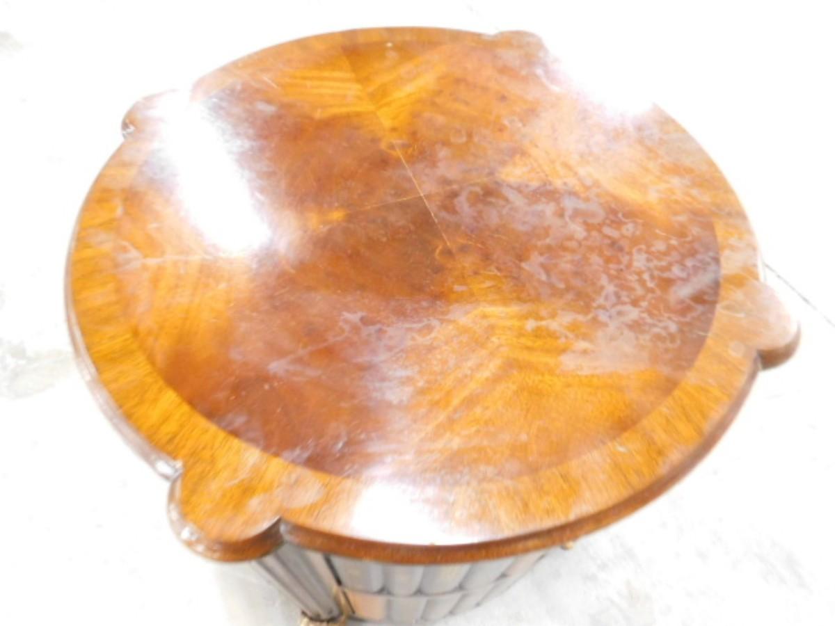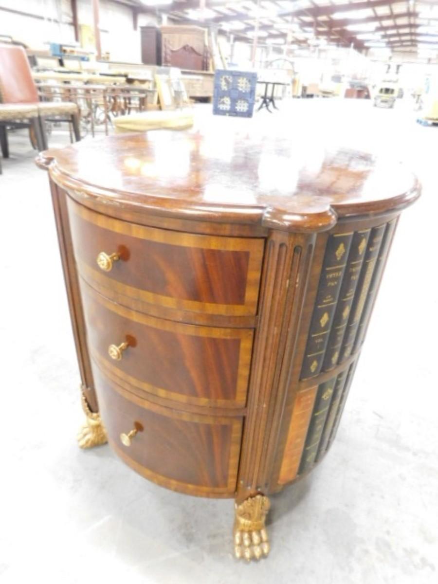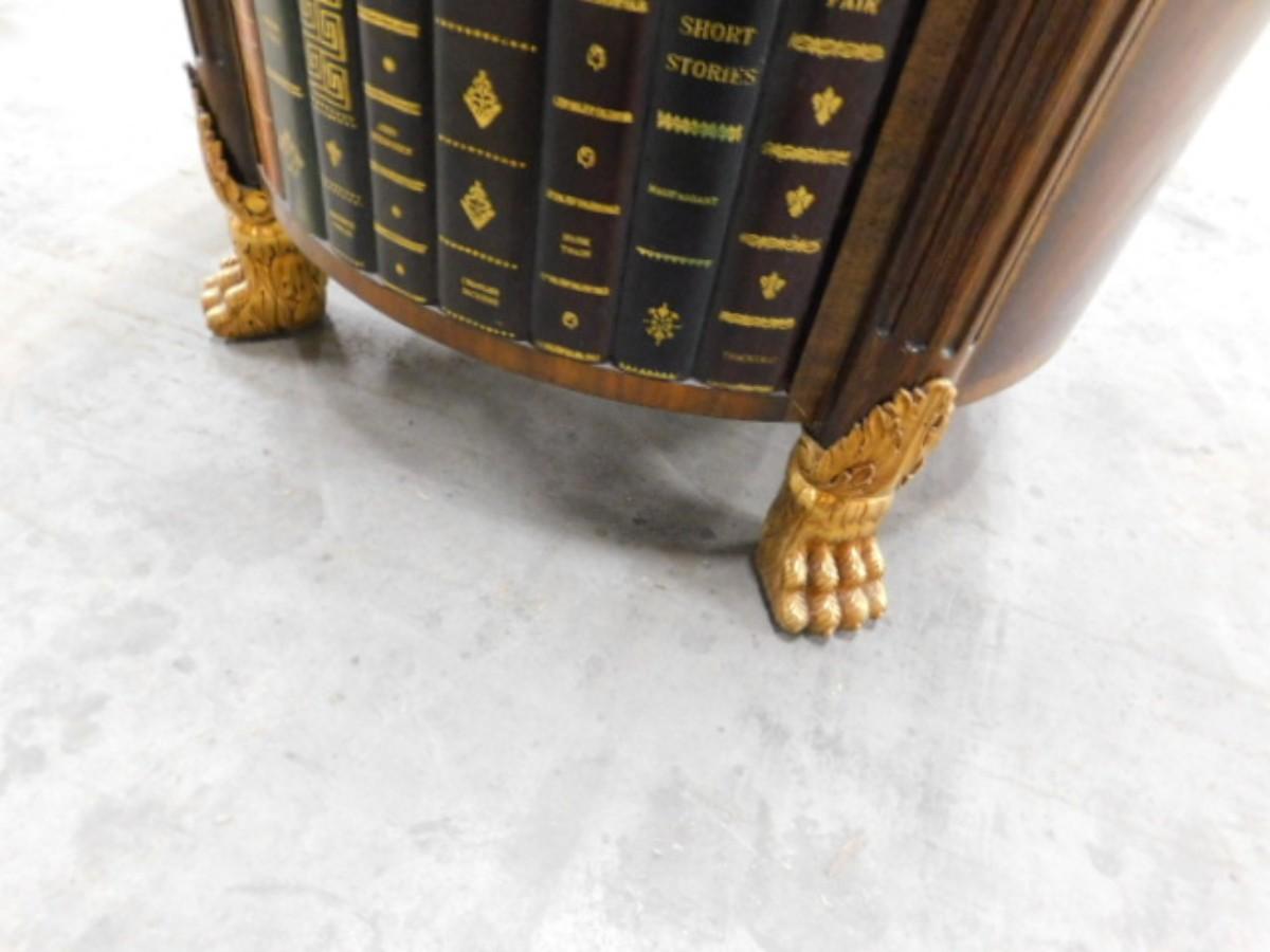 French Regency Mahogany Finish Three Drawer Drum Table Library Design Maitland-Smith Choice A. Expect some wear or scratches to the finish. Shipping option available via freight or local mover at Buyer's expense. Buyer must have all shipping scheduled within the stated dates and times of pickup. Recommended local mover is Beaty Bros. Moving 828-201-2982