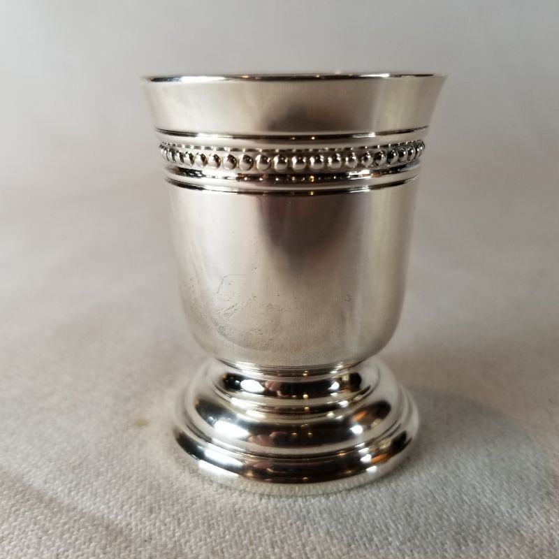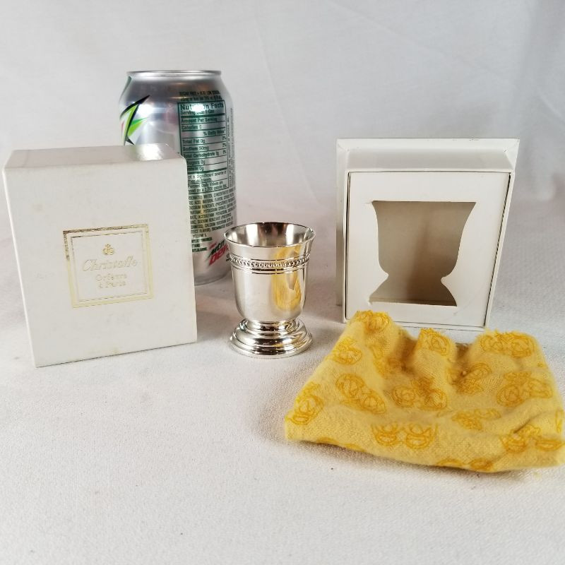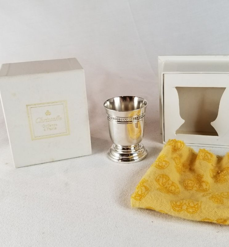 This offering is for a beautiful Jigger made by Christofle of Paris, France. Very heavily silver plated. In original box with tarnish resistant bag. Would make a lovely gift. Nearly new - never used. Not engraved or personalized in any way.