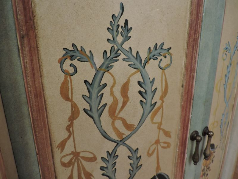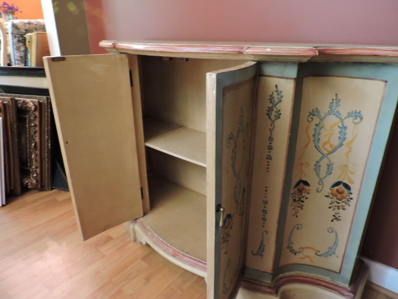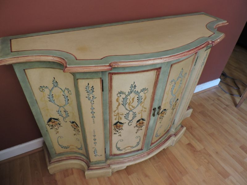 Beautifully painted accent cabinet. Painted in shades of tan, yellows, blues, and maroon. Beautifully distressed and antiqued for that great vintage look. Two doors open to inside shelf and storage. 49.5”x17”x34.5”
