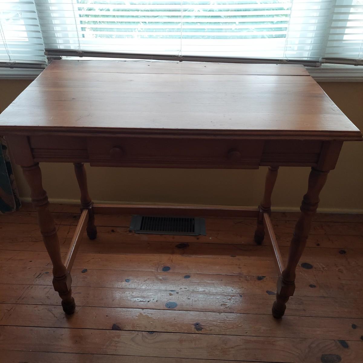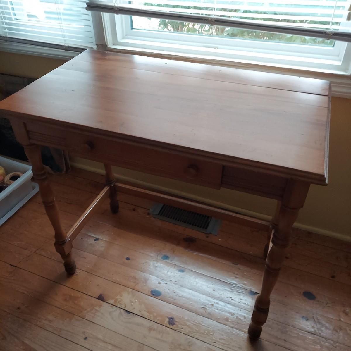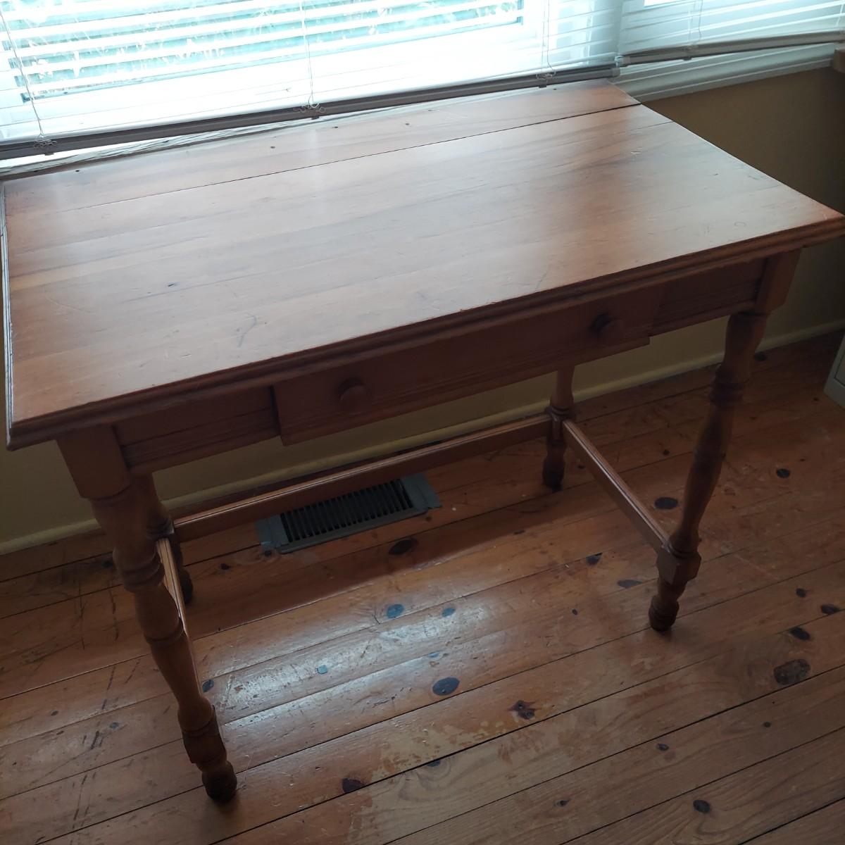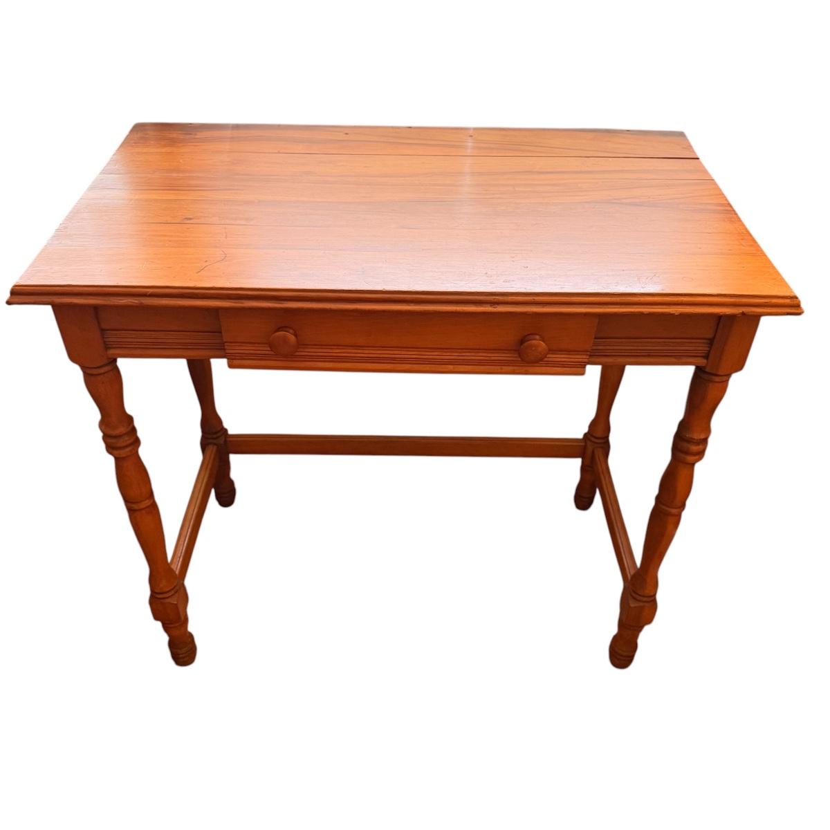 Small wooden writing desk in a vintage French style. Has a single drawer and spindle legs. Measures 32” x 18” x 29"H. Top is a bit uneven. Please see photos for details. Local Pickup Only