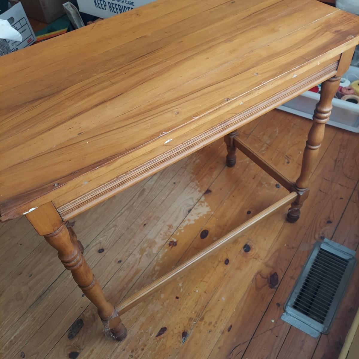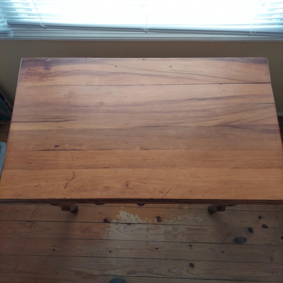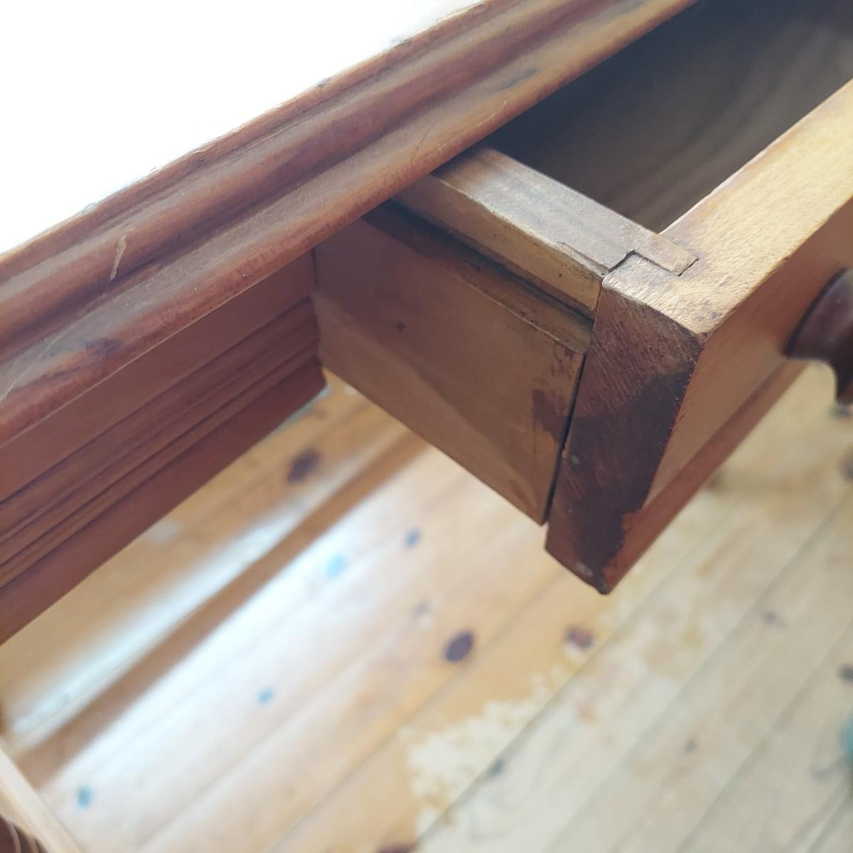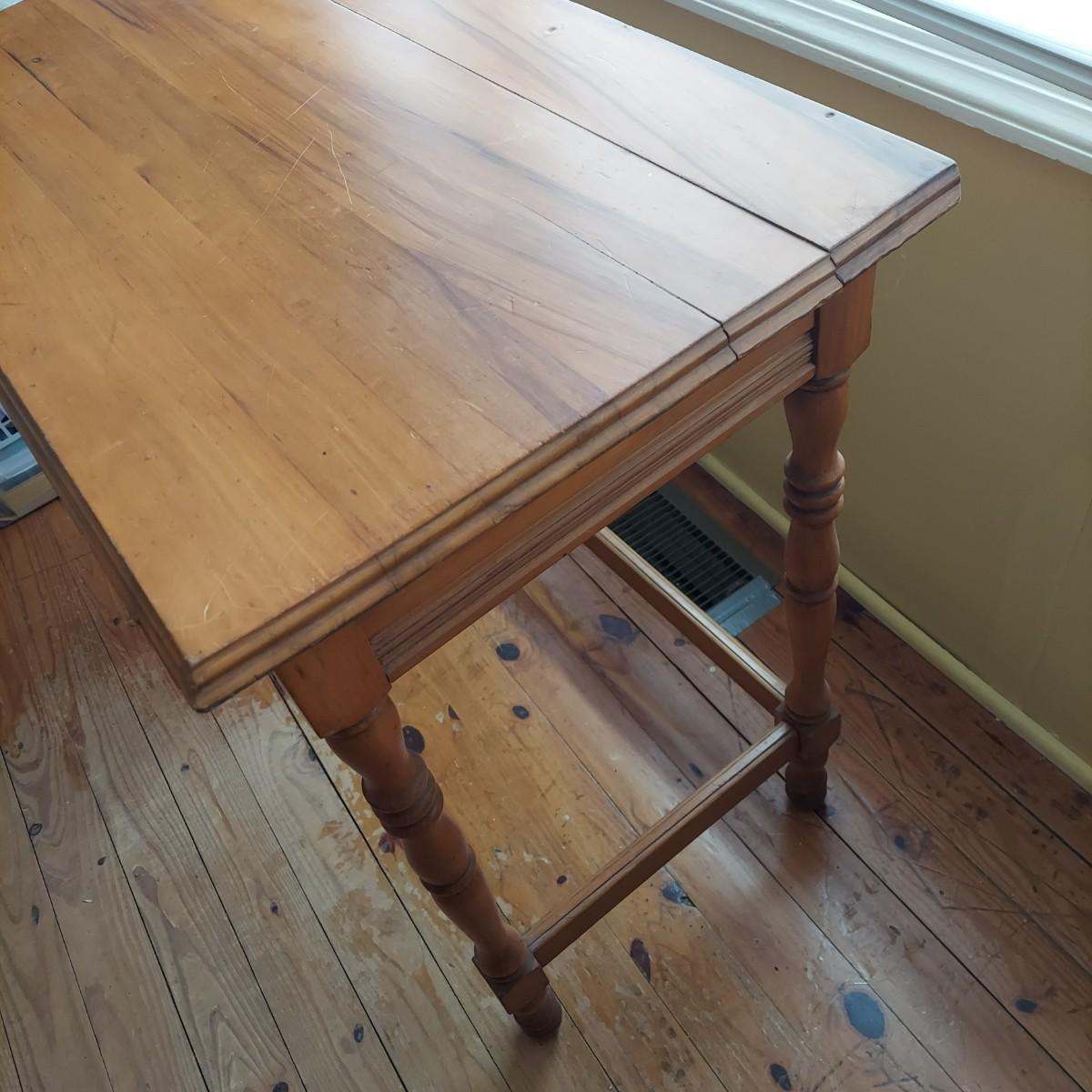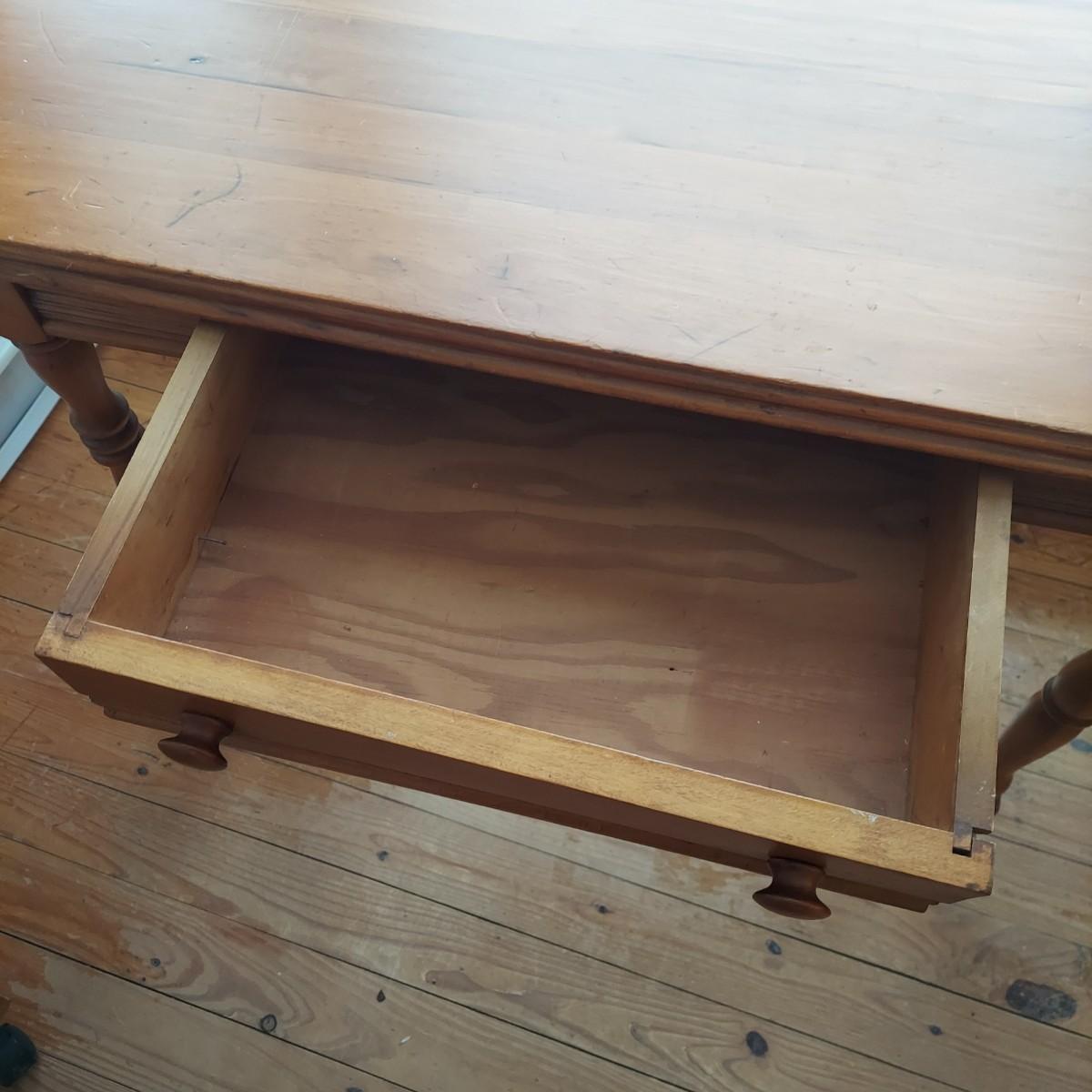 Small wooden writing desk in a vintage French style. Has a single drawer and spindle legs. Measures 32” x 18” x 29"H. Top is a bit uneven. Please see photos for details. Local Pickup Only