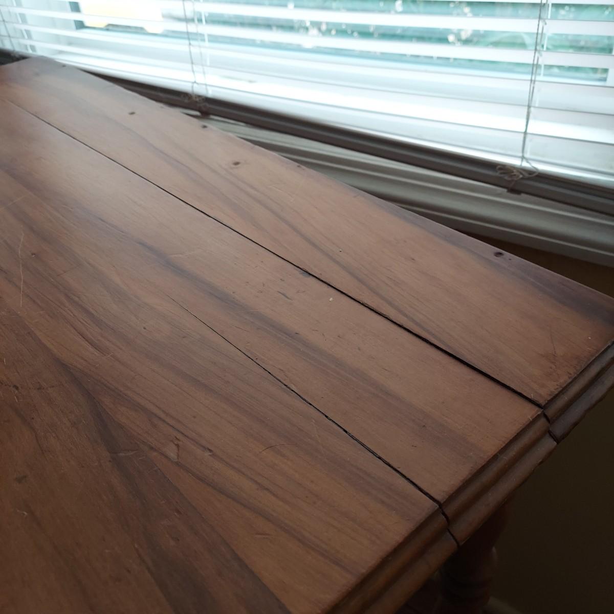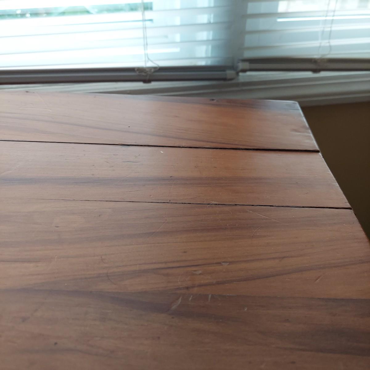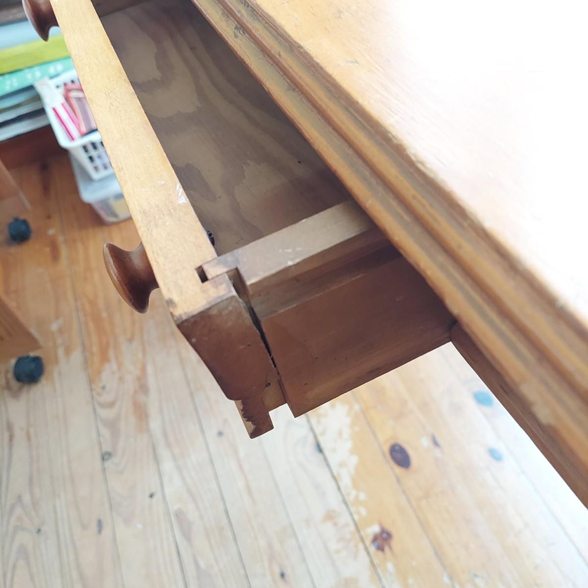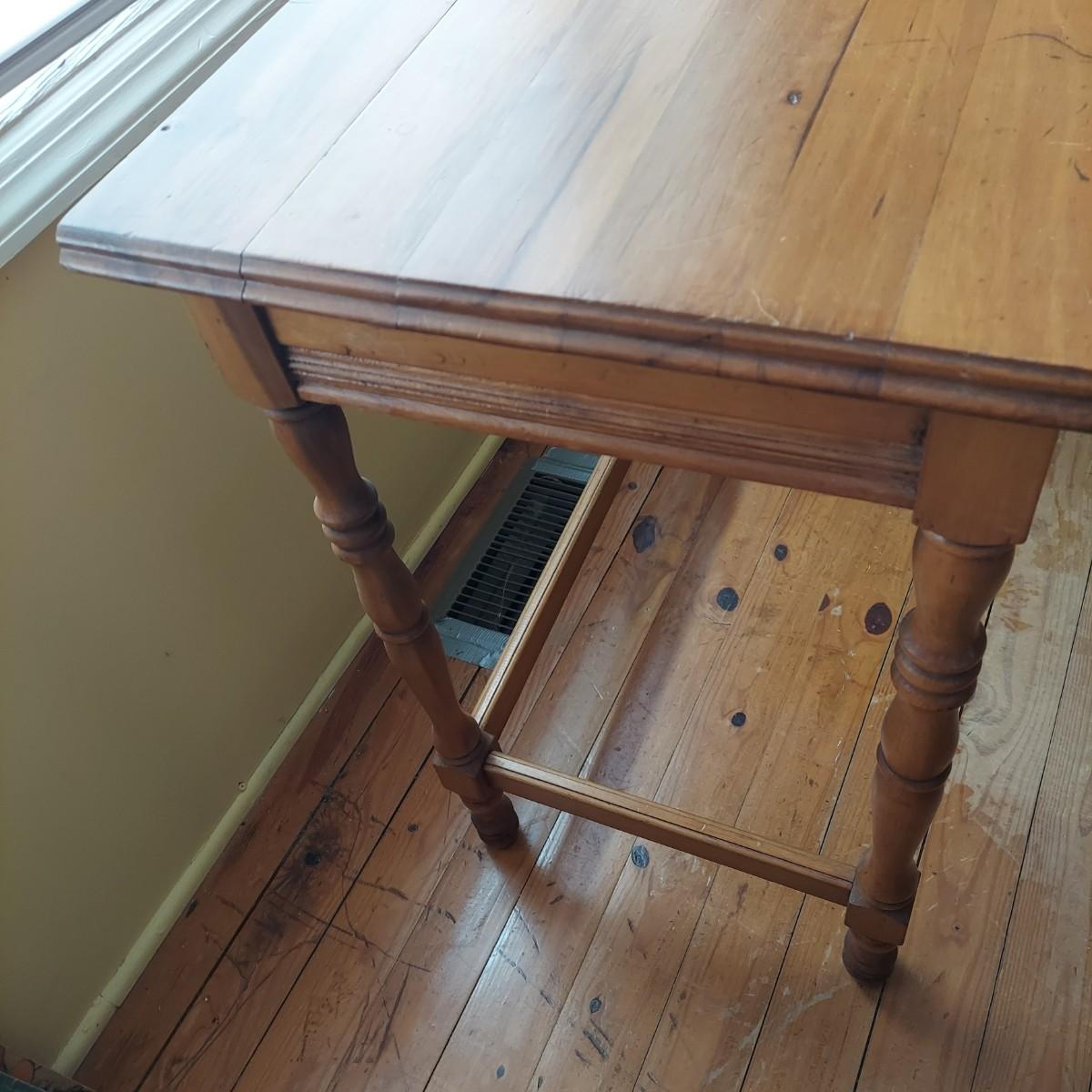 Small wooden writing desk in a vintage French style. Has a single drawer and spindle legs. Measures 32” x 18” x 29"H. Top is a bit uneven. Please see photos for details. Local Pickup Only