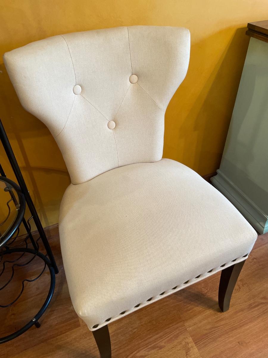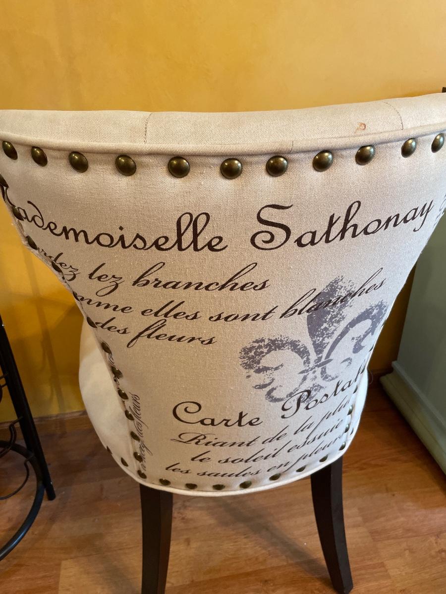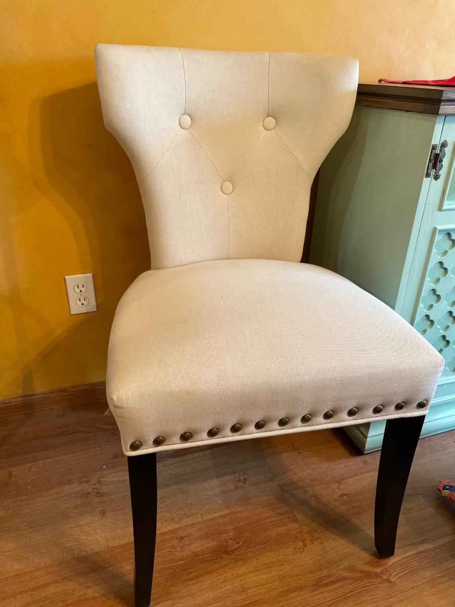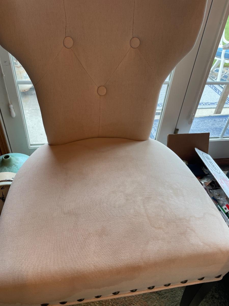 One of the chairs looks like somebody spilled their wine all over it. It maybe able to be cleaned, but it looks pretty bad. The other chair is in good shape.