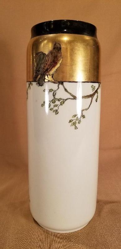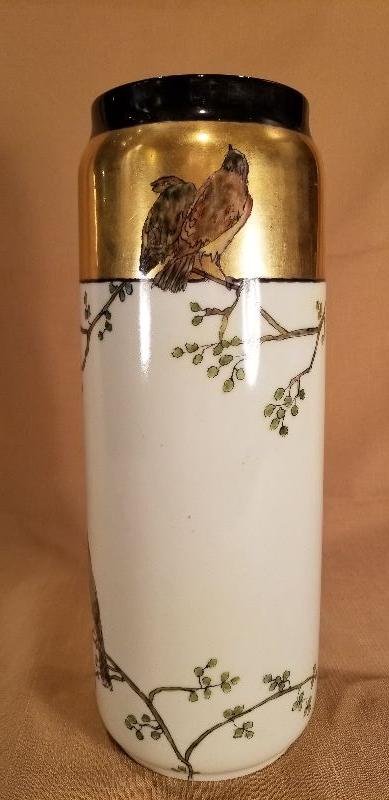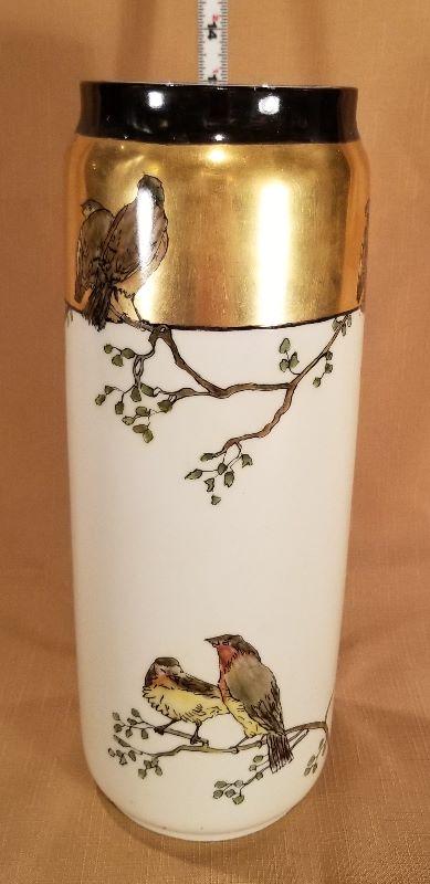 French Hand Painted Vase. 5-inches wide x 13-inches tall. Very good condition. Beautiful vase with stunning rendition of beautiful birds - has a nouveau feel. Great decorator piece, with vintage.
