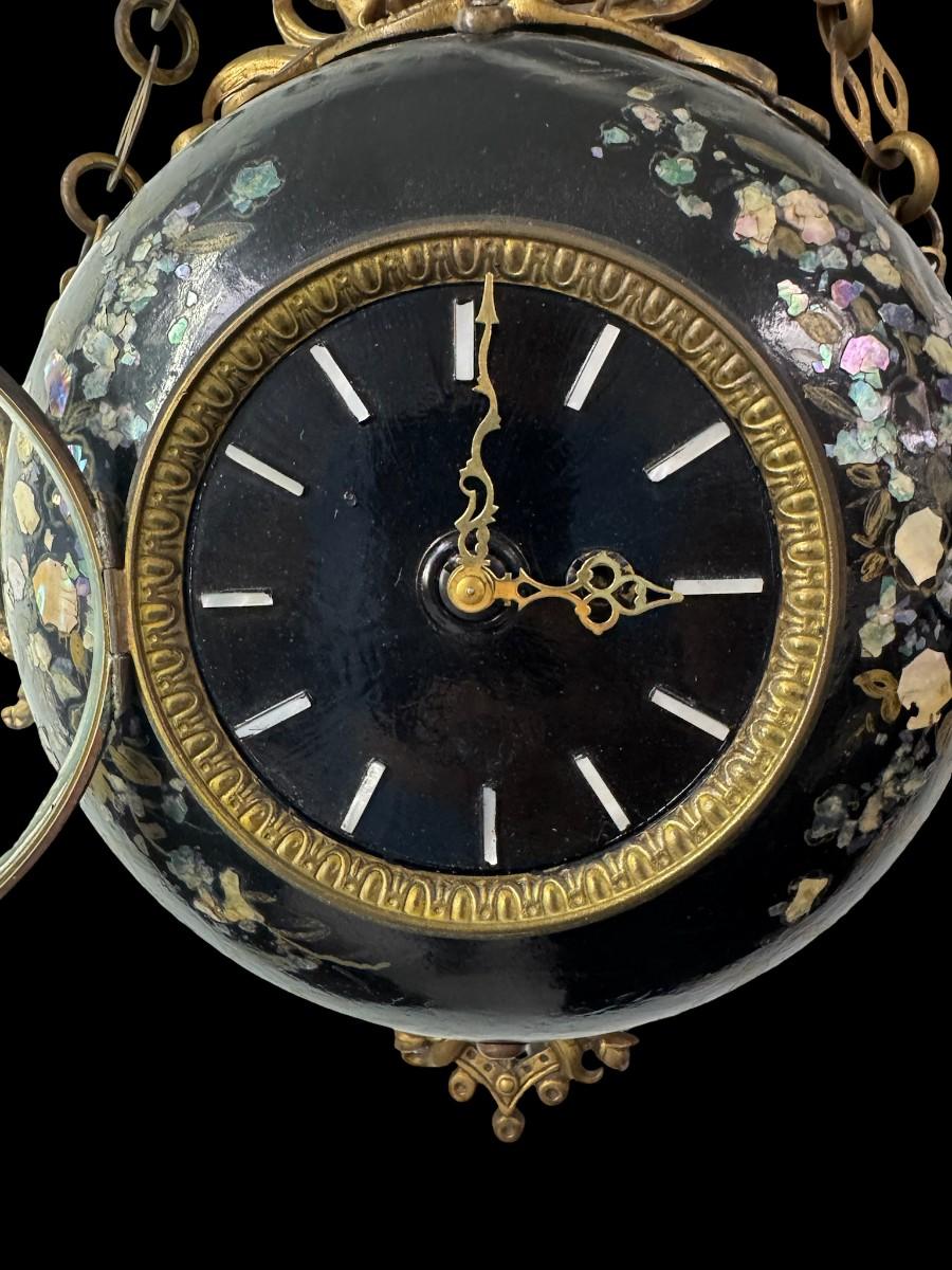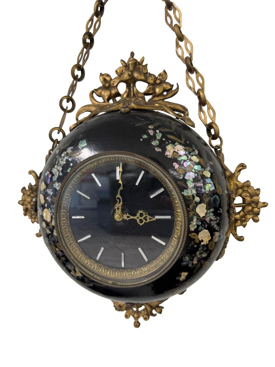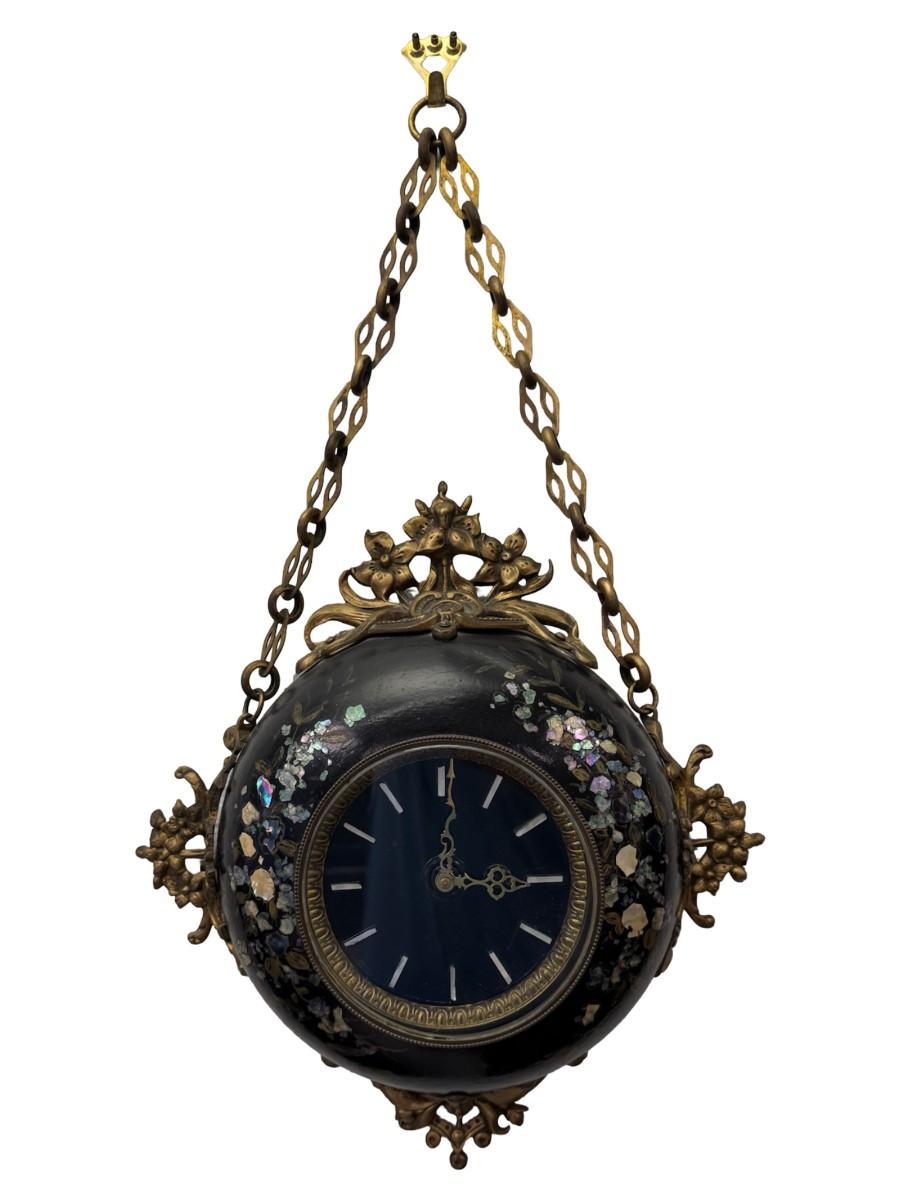 Made in France, this Napoleon III era piece has a black lacquered finish with mother of pearl inlay, and brass accents. It includes a hanging chain. It has not been tested. Two screws are missing, but the piece is still sturdy. Measurement: 13.5” Diameter. [JP]