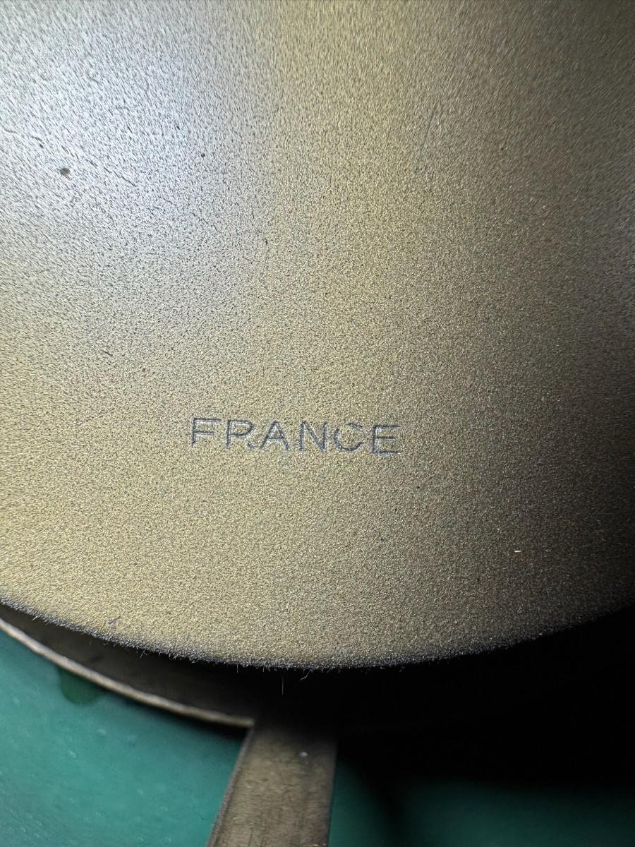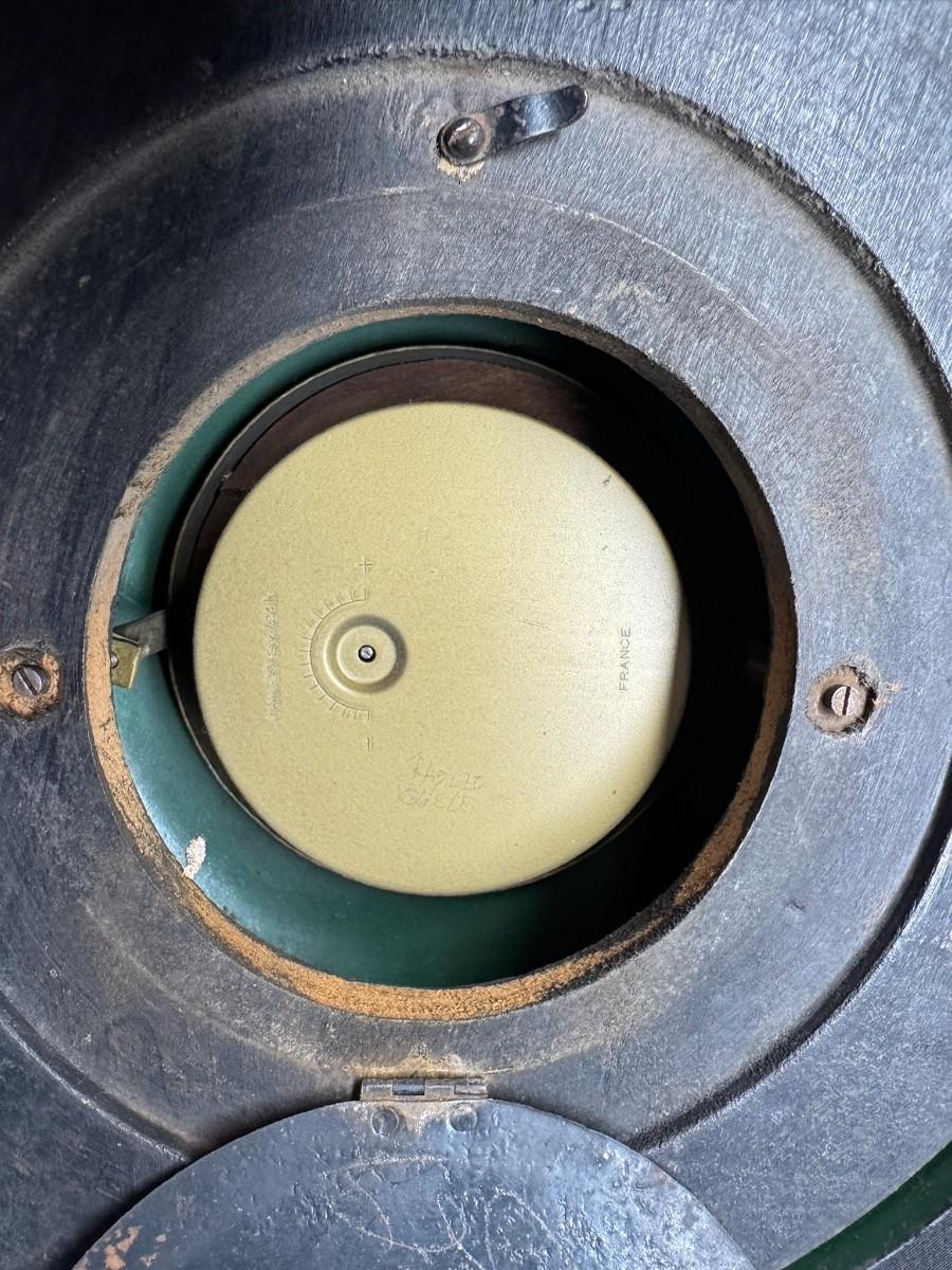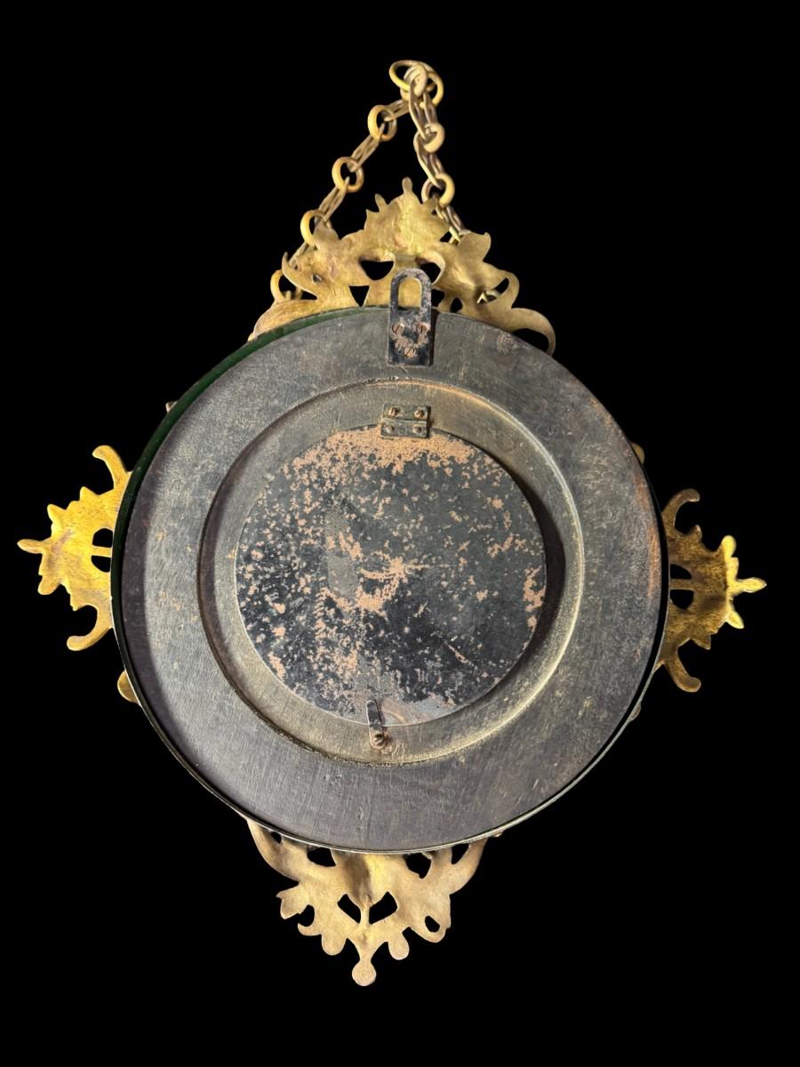Made in France, this Napoleon III era piece has a black lacquered finish with mother of pearl inlay, and brass accents. It includes a hanging chain. It has not been tested. Two screws are missing, but the piece is still sturdy. Measurement: 13.5” Diameter. [JP]
