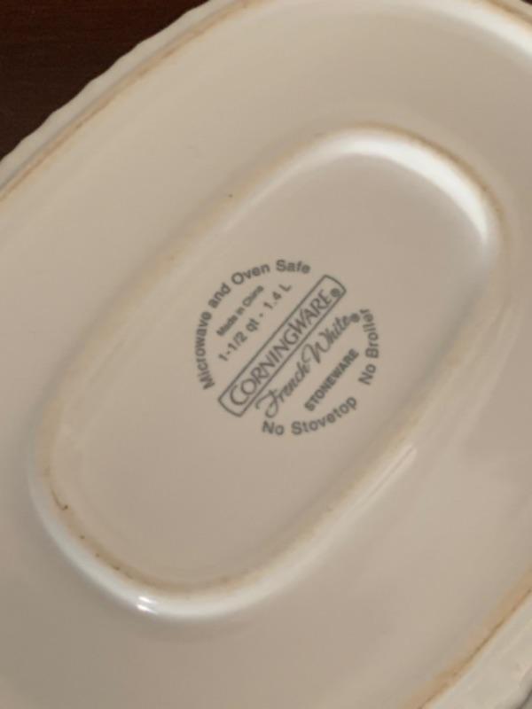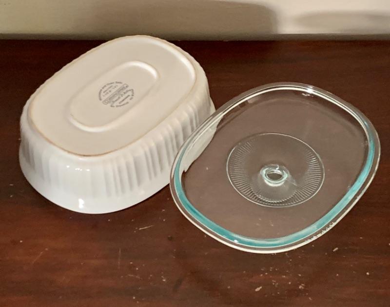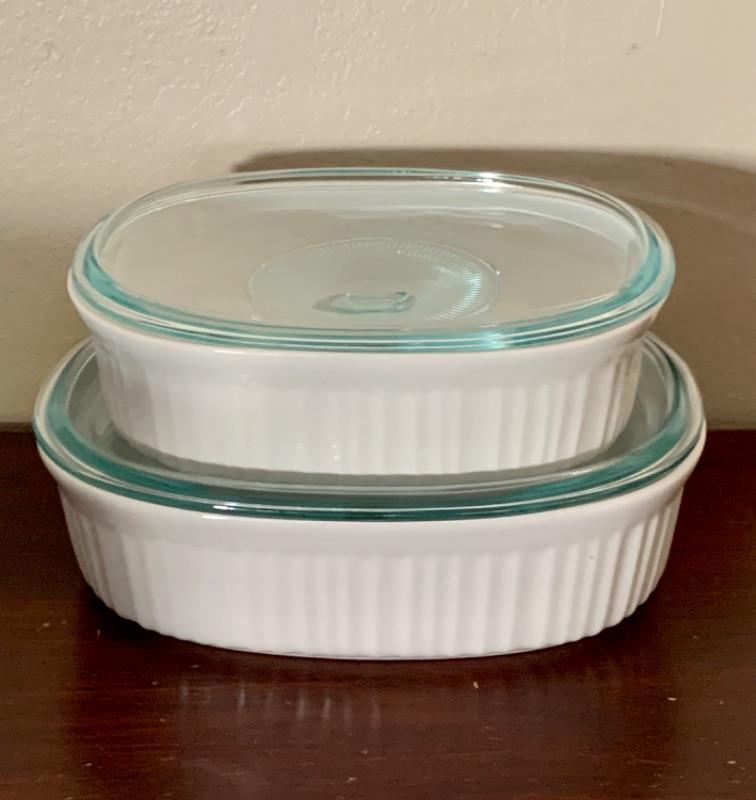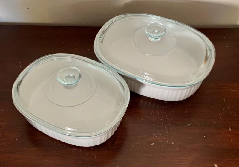 Set of 2, vintage Corning Ware French White casserole dishes with lids. Small chip below rim on largest dish. No stains, cracks or further chips. Lids in excellent condition. 1 1/2 qt and 2 1/2 qt.