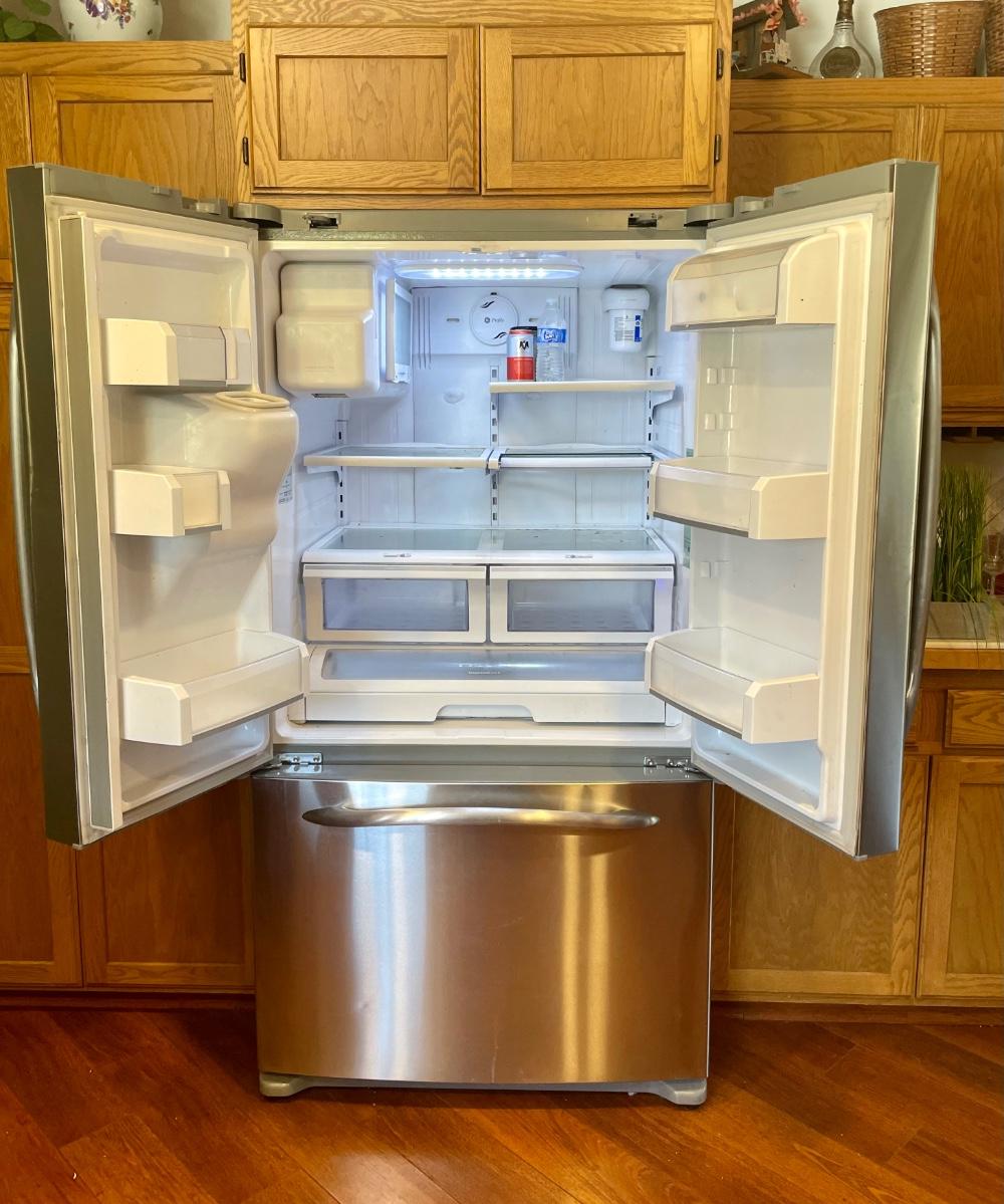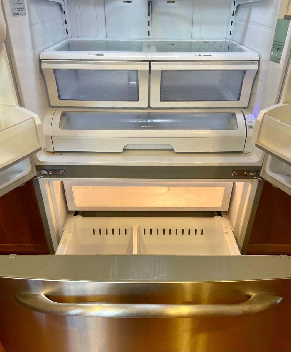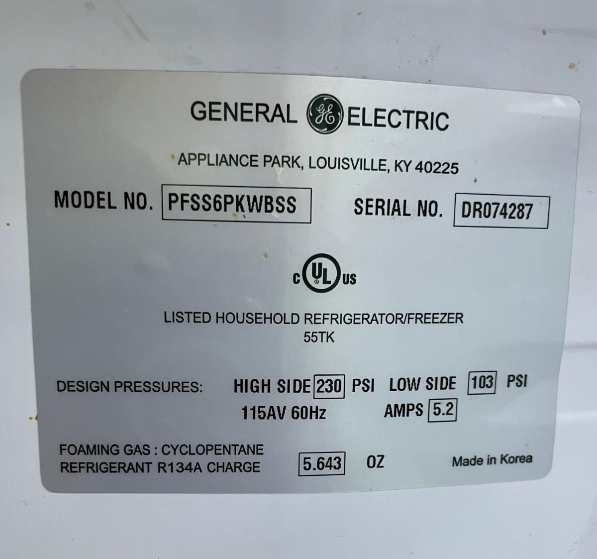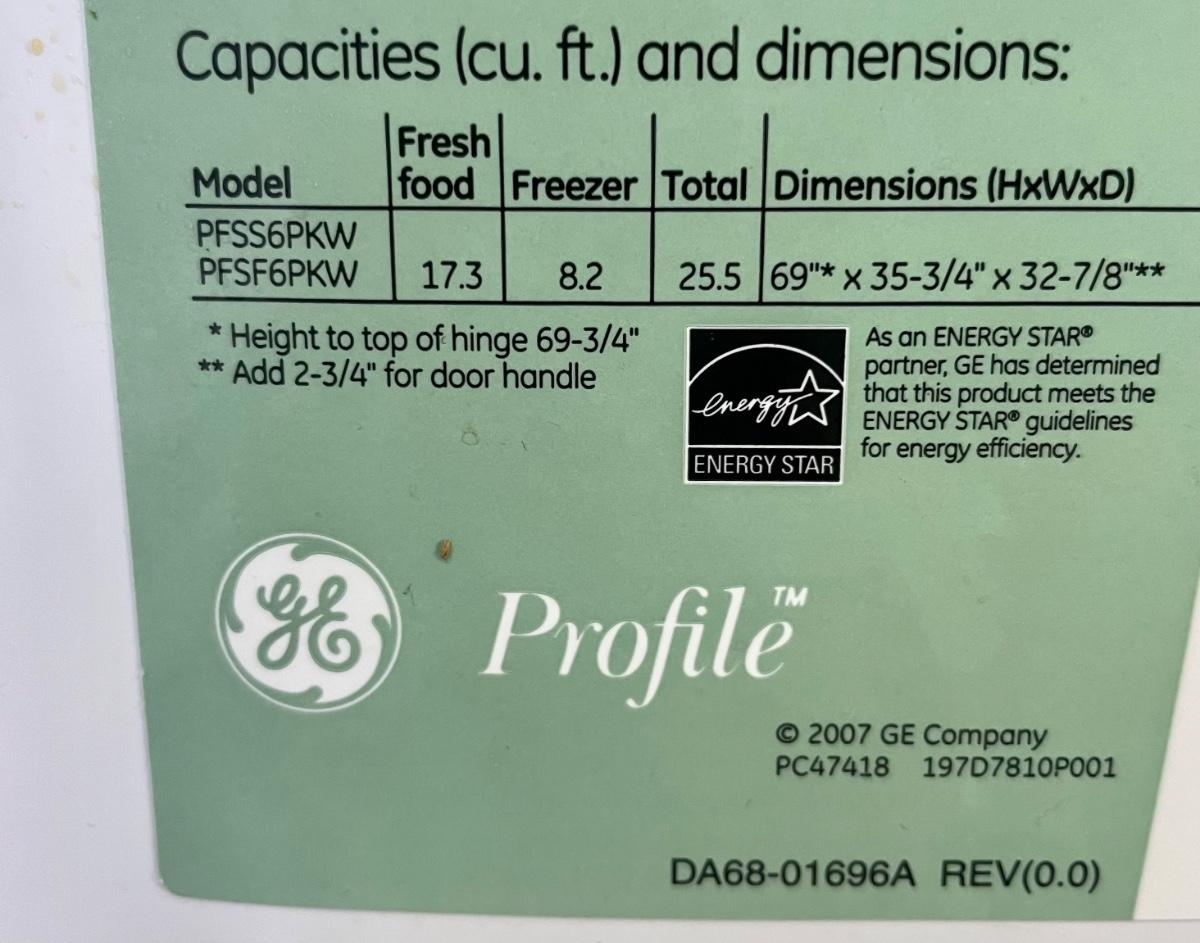 GE Profile French Door Refrigerator. 25.5 cubic feet. Stainless Steel finish, model PFSS6PKWBSS. LED lighting, ice and water dispenser in door, 69" H x 35 3/4" wide x 32 7/8" deep.