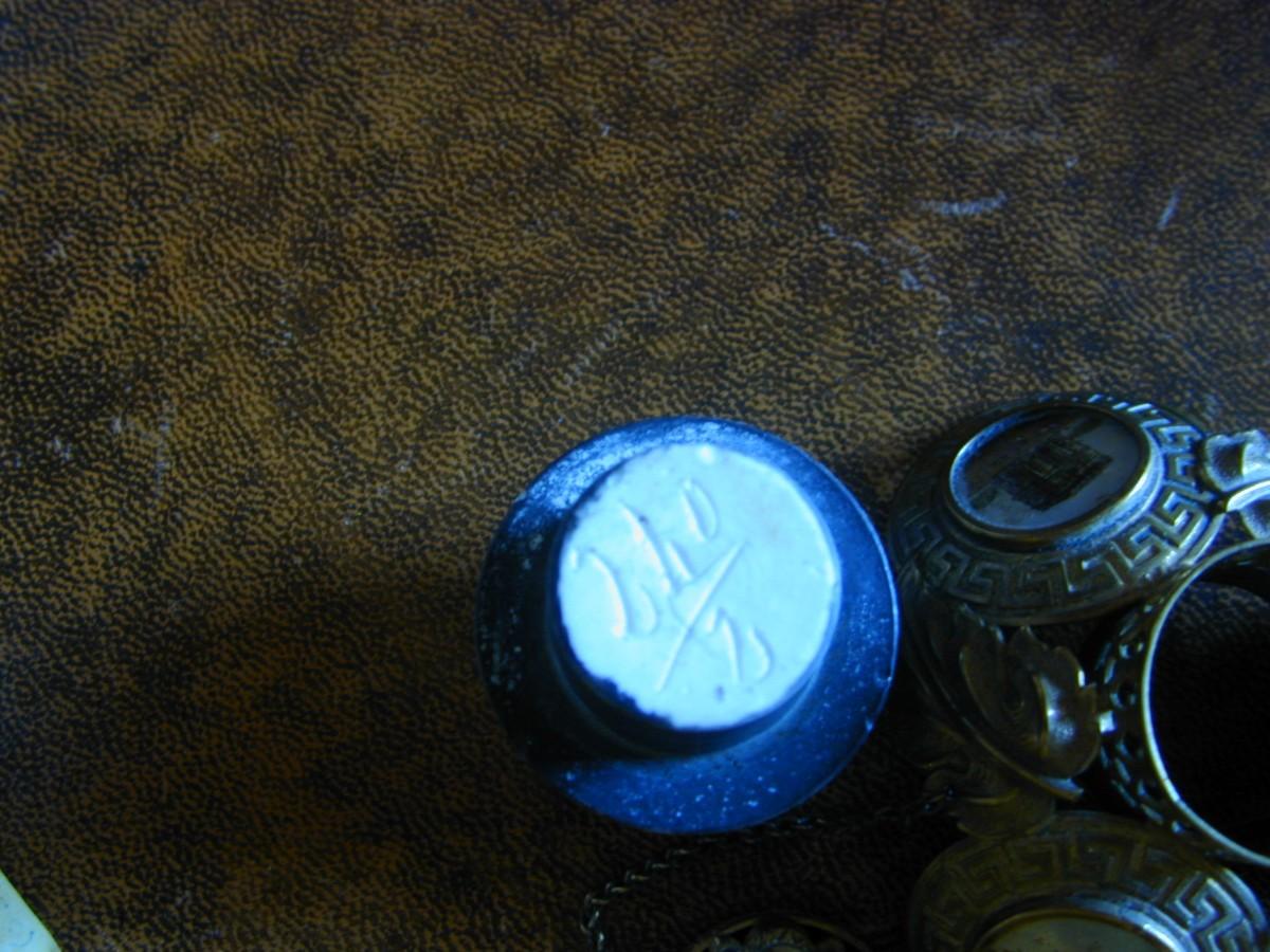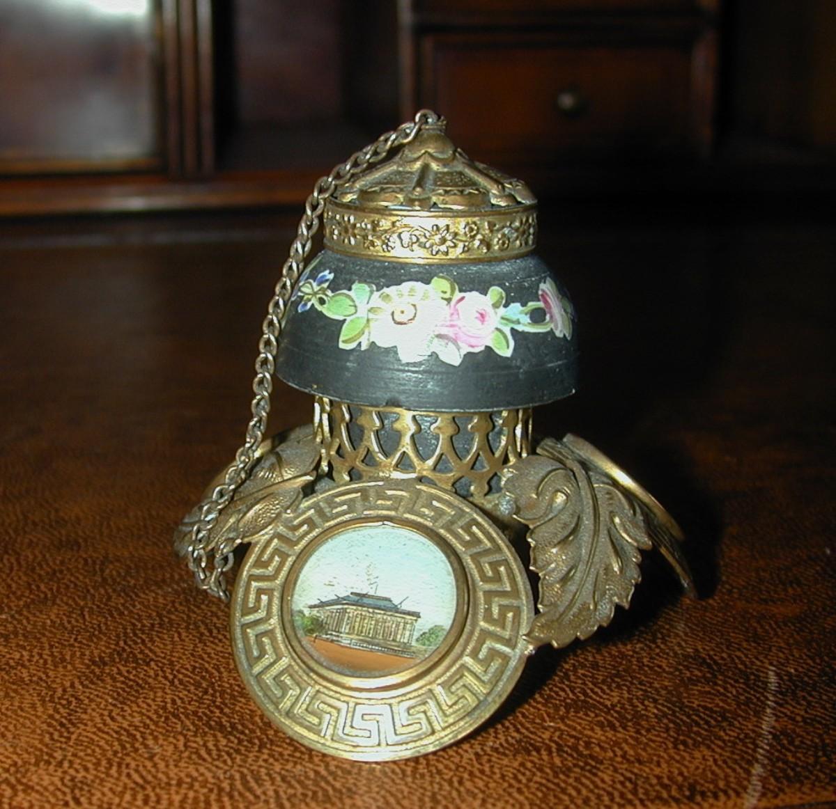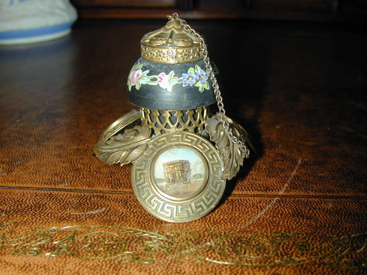 French/German Porcelain & Gilt Metal Inkwell W/Three Reverse Painted Images - 2 5/8" tall
