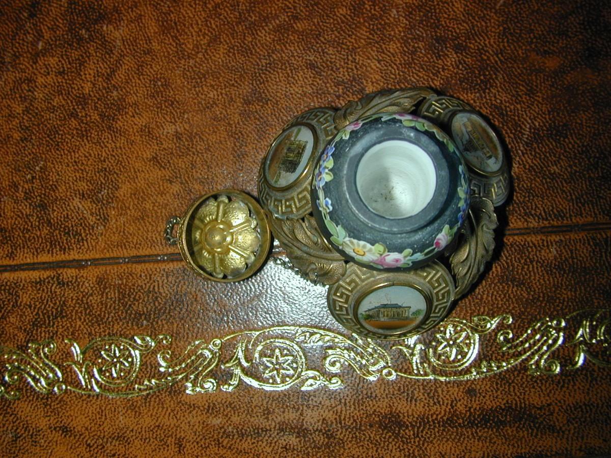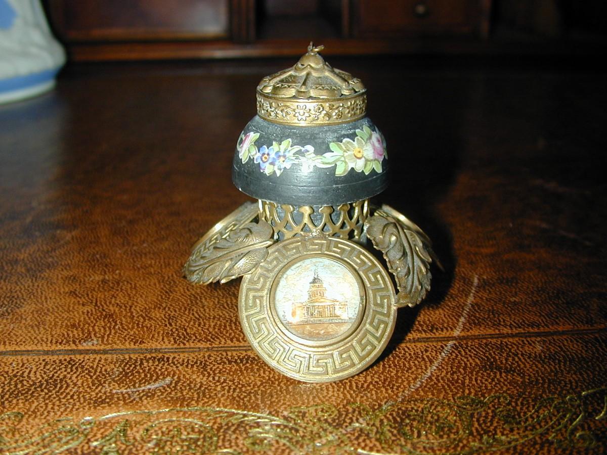 French/German Porcelain & Gilt Metal Inkwell W/Three Reverse Painted Images