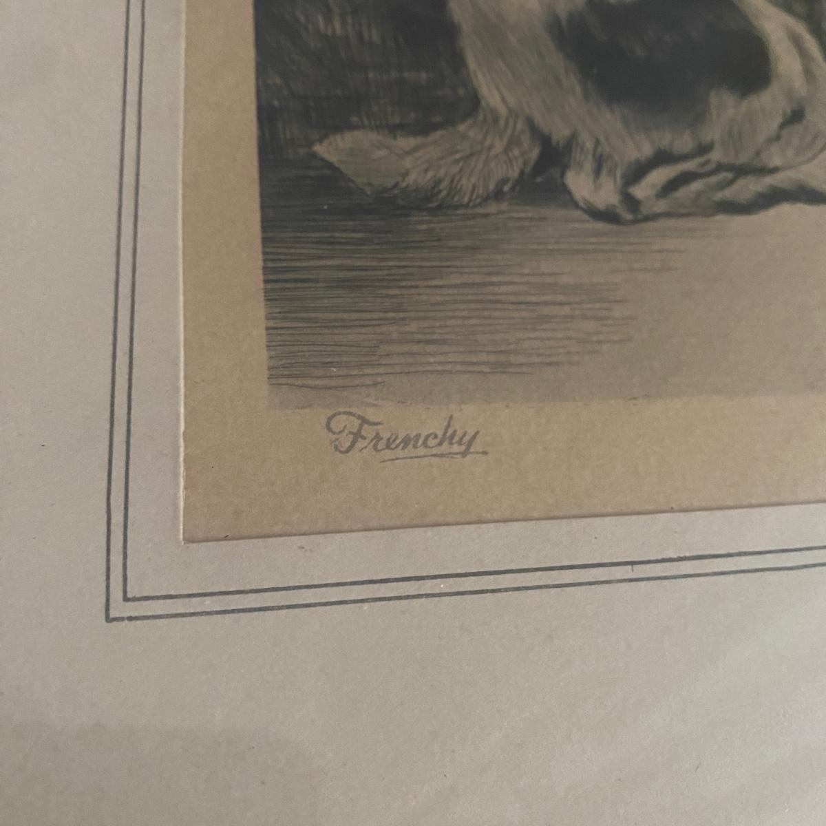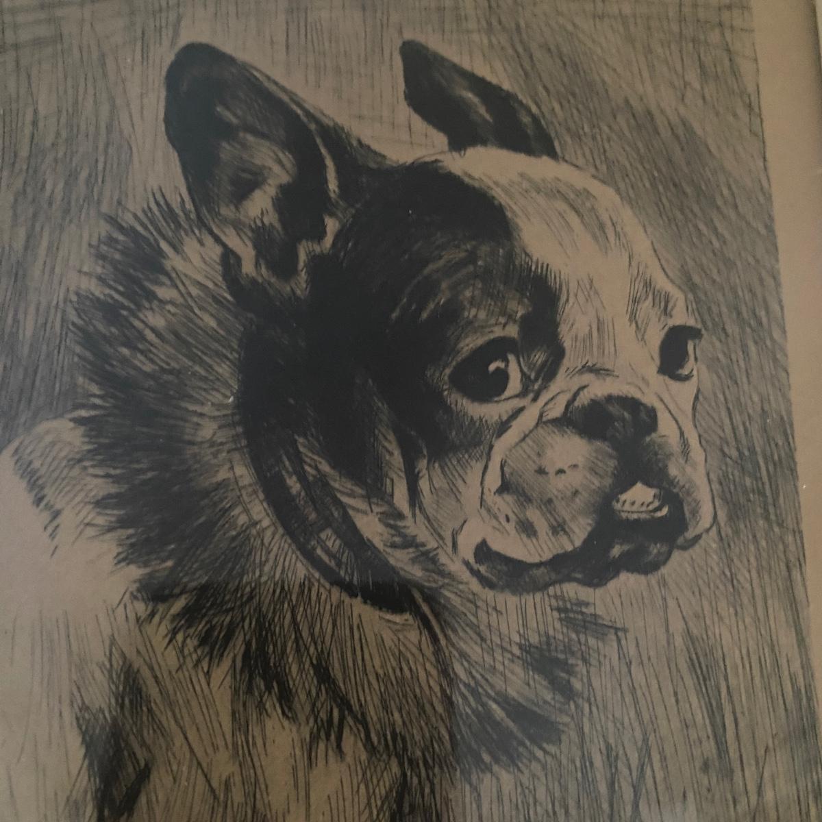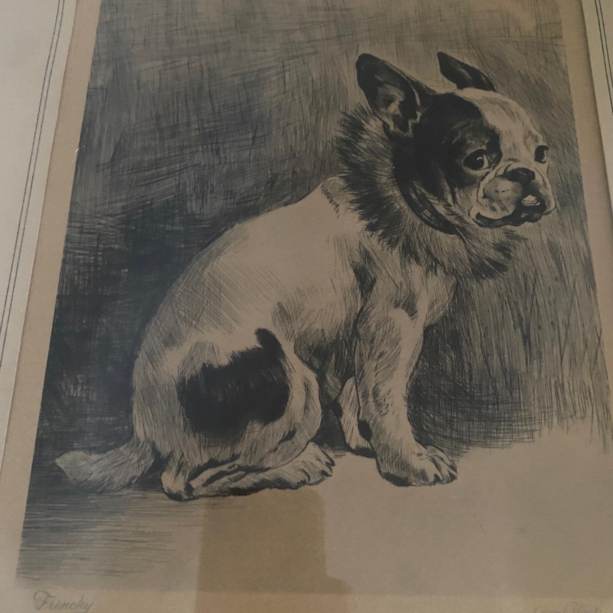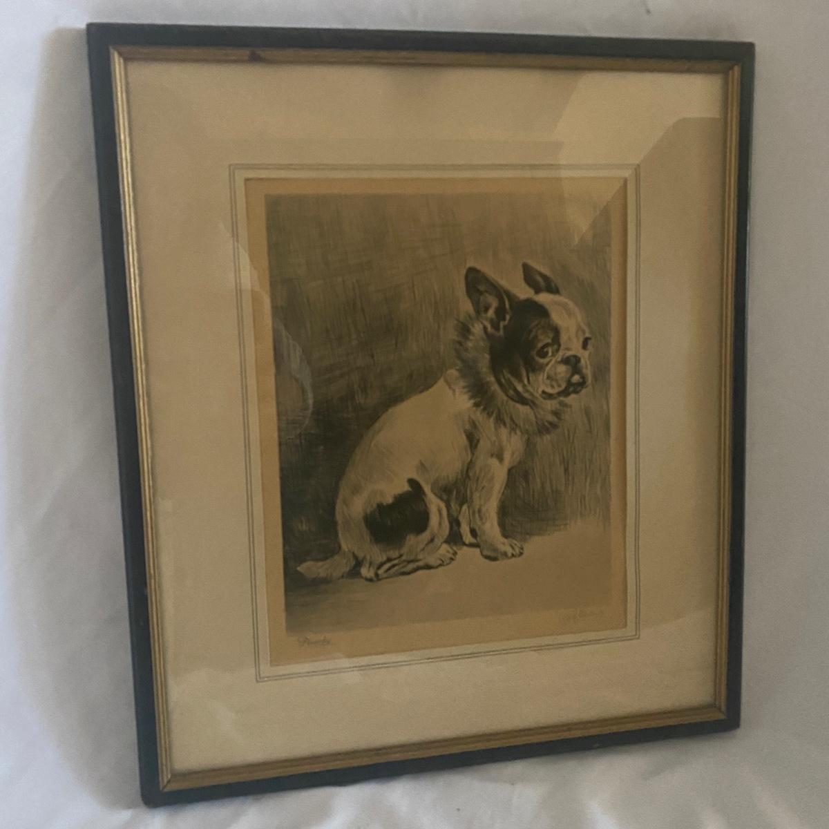 Cute dog print of a Frenchy dog breed. Looks a bit like a Boston Terrier too! Print has markings on bottom with signature. Appears to be printed. Hangs in an antique thin black wood frame. Measures 14”W x 16”H Shipping available. Shipping art can be costly. We suggest contacting our preferred local shipping provider, Postage Express, with dimensions and getting an estimate before bidding: (828) 670-5501 or postageexpress@yahoo.com.