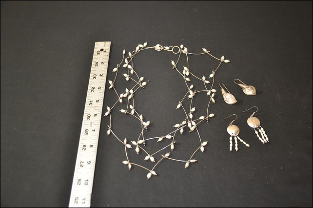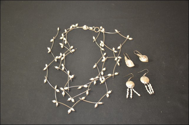 freshwater pearl and silver necklace and two pairs of earrings.  Studio art, one
