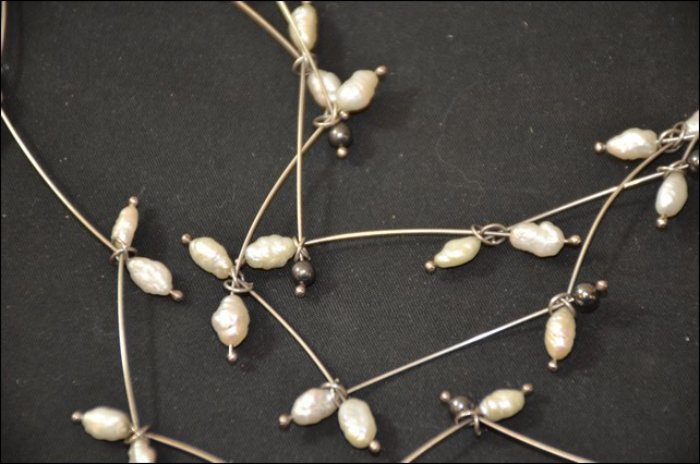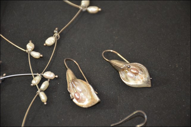 freshwater pearl and silver necklace and two pairs of earrings. Studio art, one pair of earrings was made by Joan Schwartz